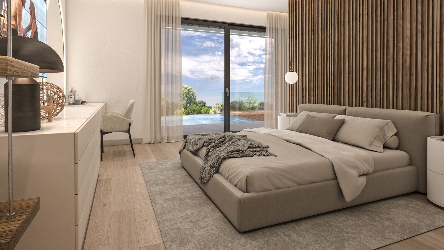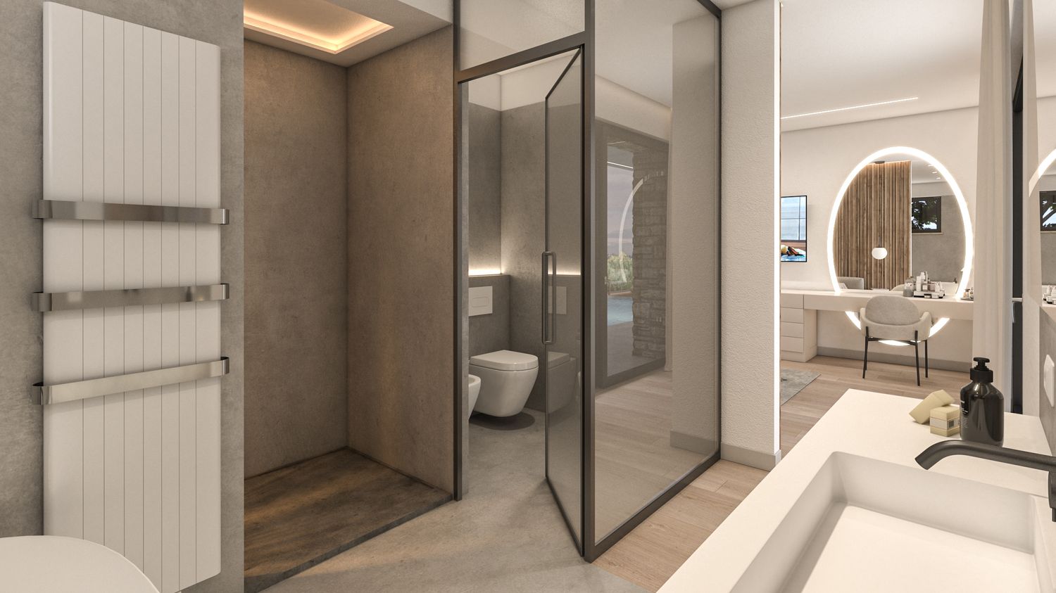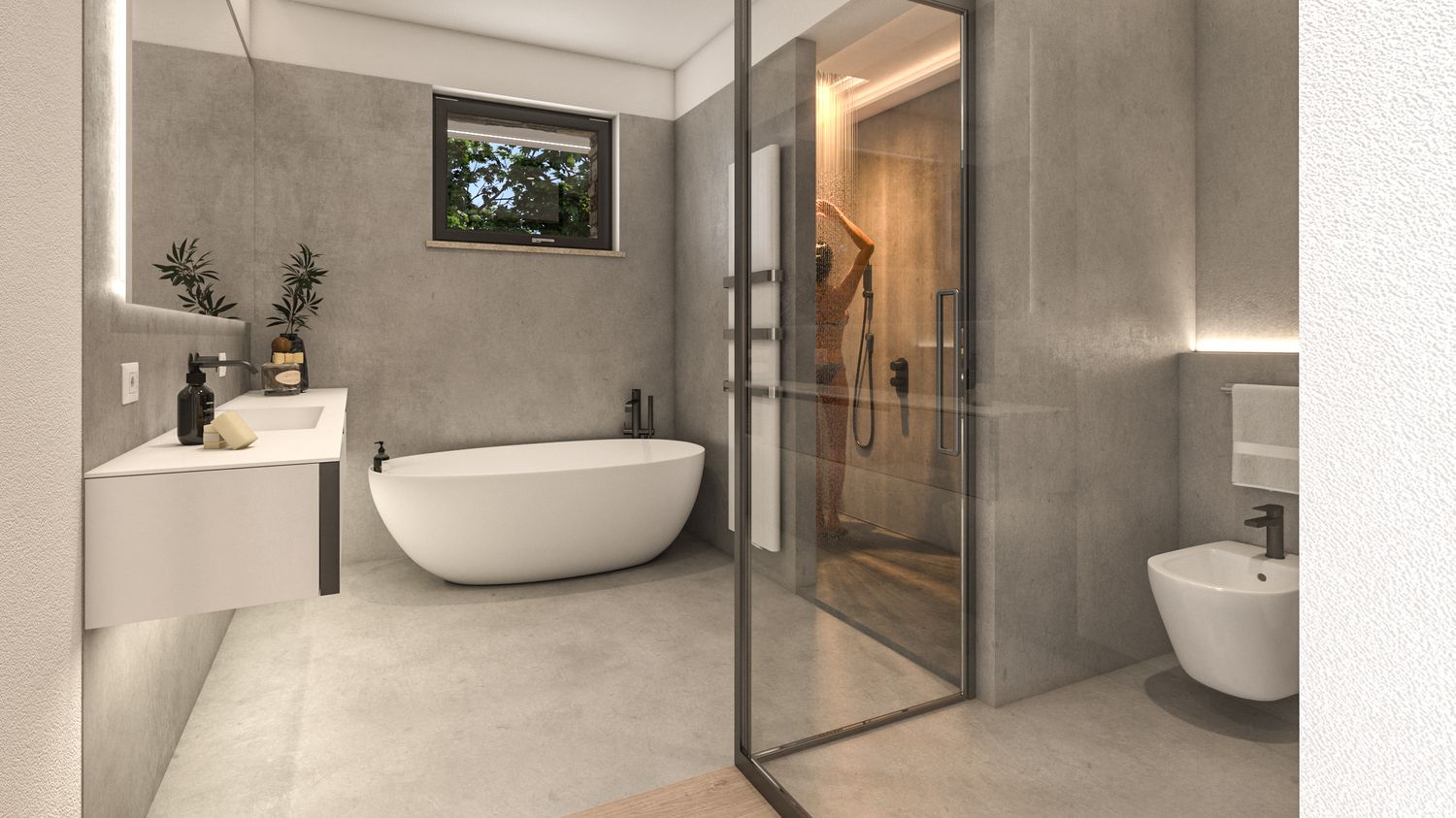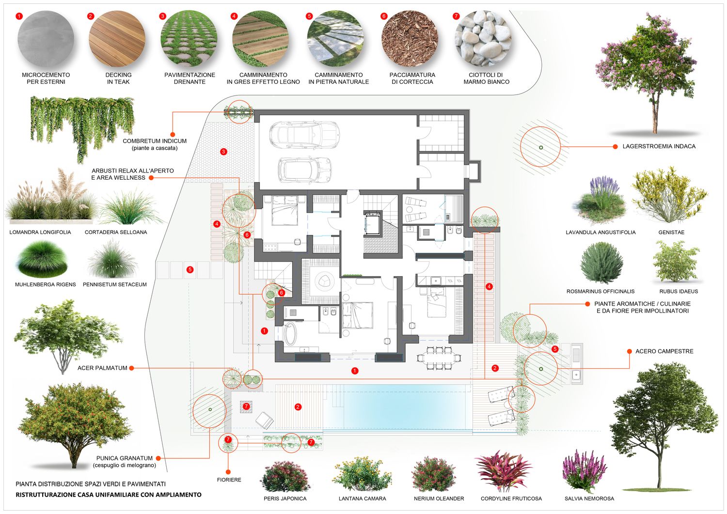 Gli spazi esterni sono progettati per integrarsi nel contesto collinare, attraverso l’uso di vegetazioni autoctone, materiali naturali e un’organizzazione morbida dei terrazzamenti. L’area relax a sud ospita una piscina rettangolare a sfioro visivo, studiata per dialogare con la linea dell’orizzonte e con i vigneti circostanti. L’involucro è progettato per garantire efficienza energetica, comfort termico e durabilità, con particolare attenzione alla ventilazione naturale e alla protezione solare mediante frangisole e sporgenze calibrate.