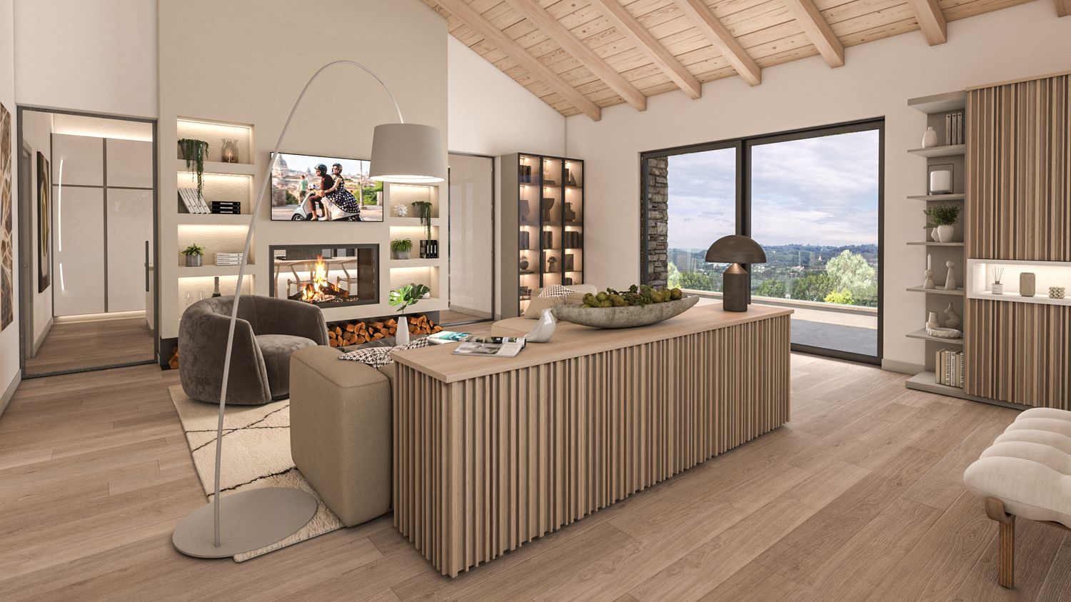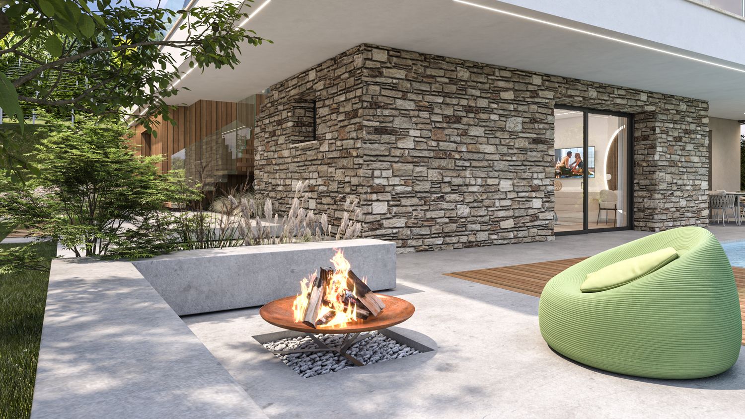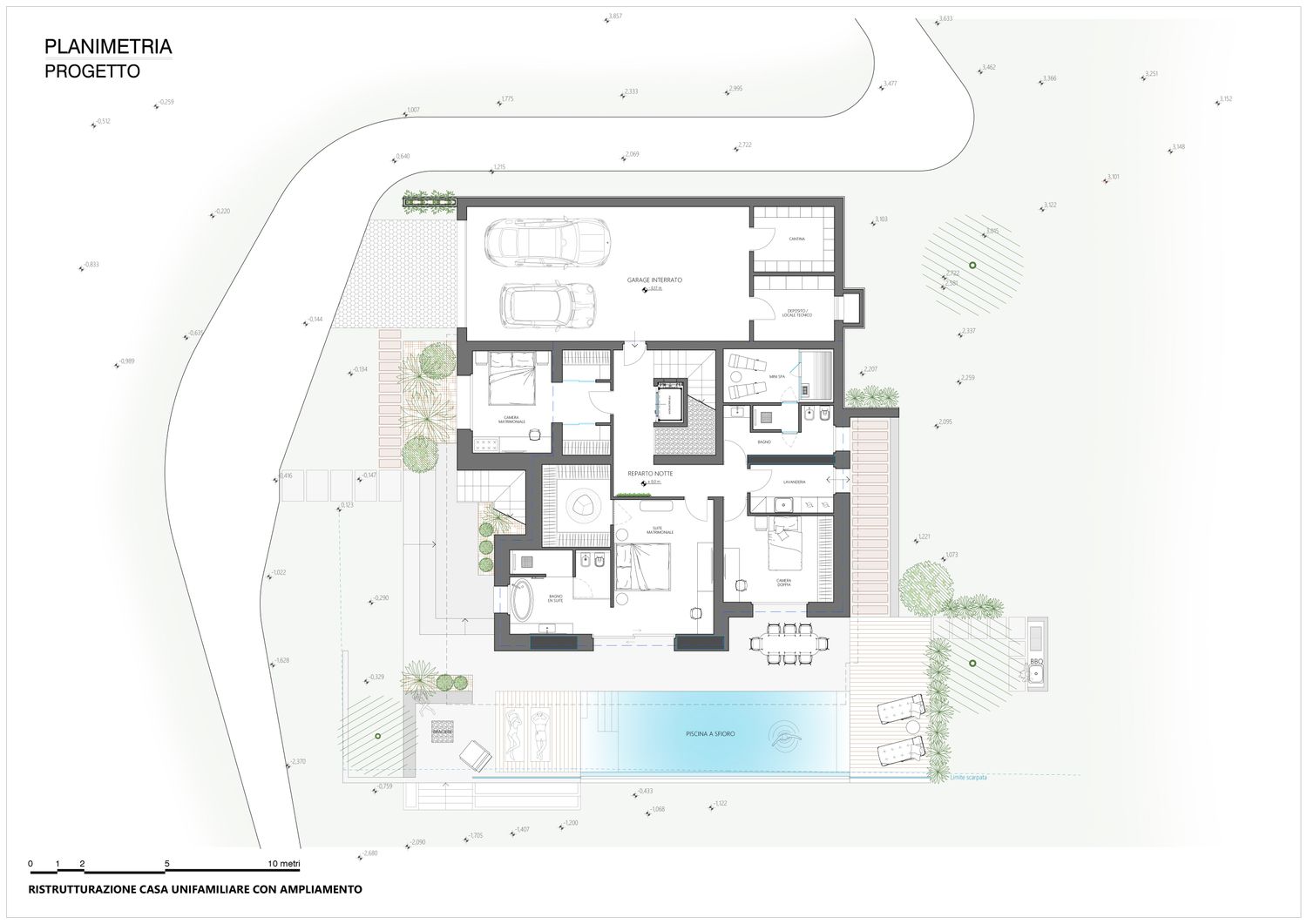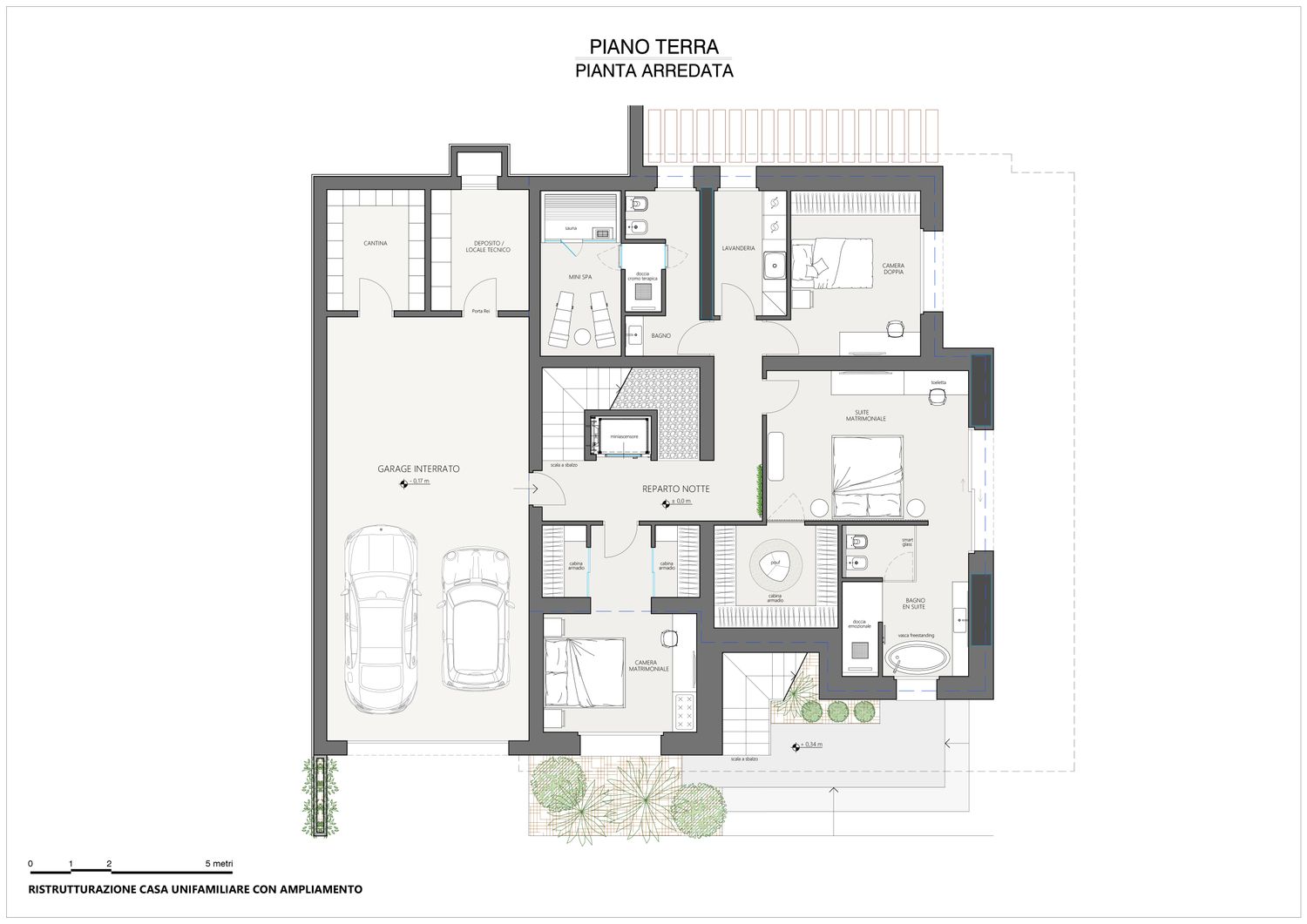 La casa viene riorganizzata su due livelli abitabili, collegati sia da una nuova scala interna sia da una scala esterna. Il piano terra accoglie il reparto notte in modo raccolto e protetto: tre camere da letto, di cui la matrimoniale con bagno en suite, un secondo bagno con accesso alla mini spa e una lavanderia. L’ampliamento consente inoltre di ricavare un garage interrato, perfettamente integrato nel pendio, oltre a locale tecnico e cantina. Il piano superiore è concepito come uno spazio fluido e luminoso, interamente dedicato alla vita quotidiana e alla convivialità, con una zona giorno panoramica affacciata sul paesaggio.