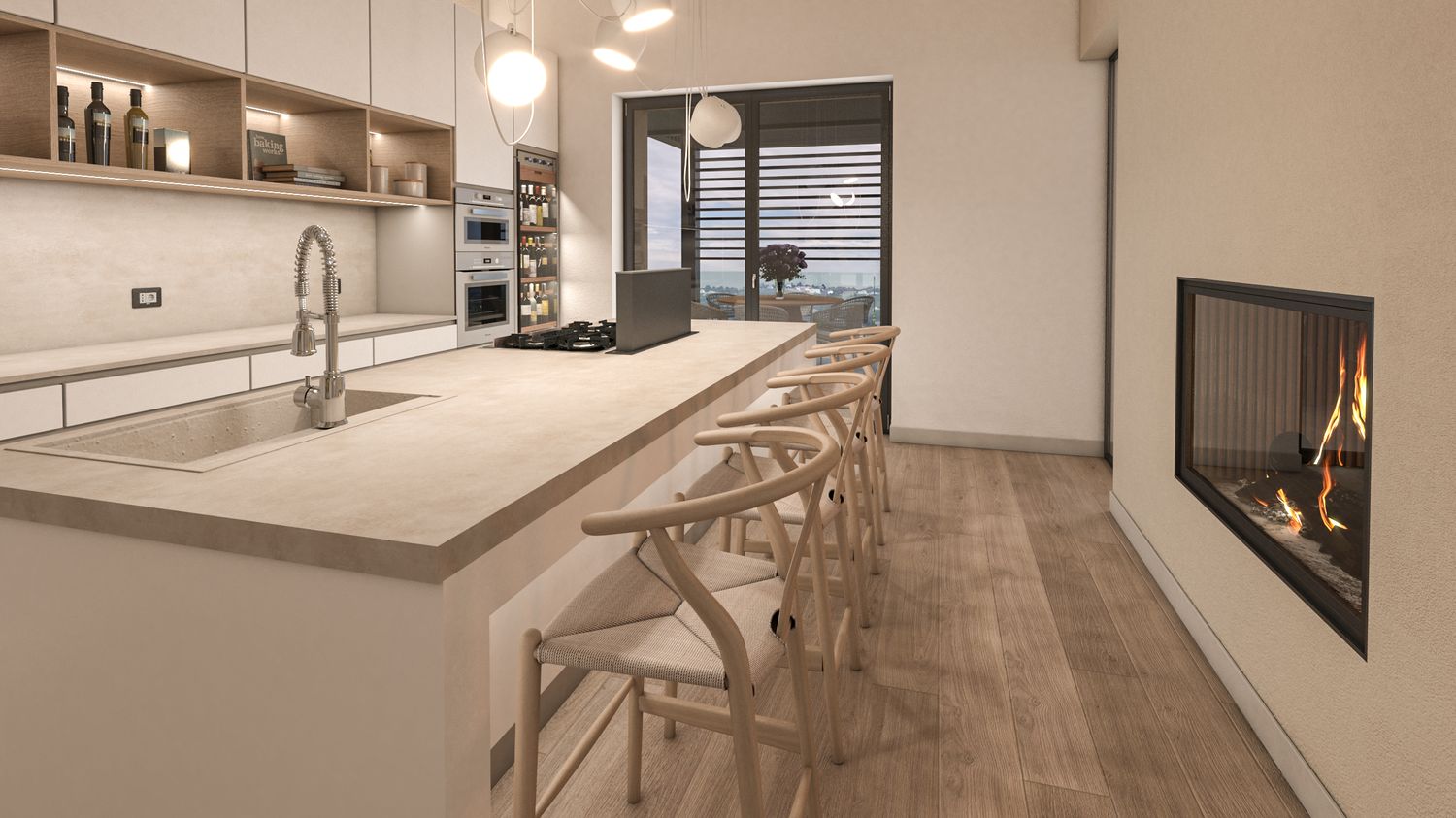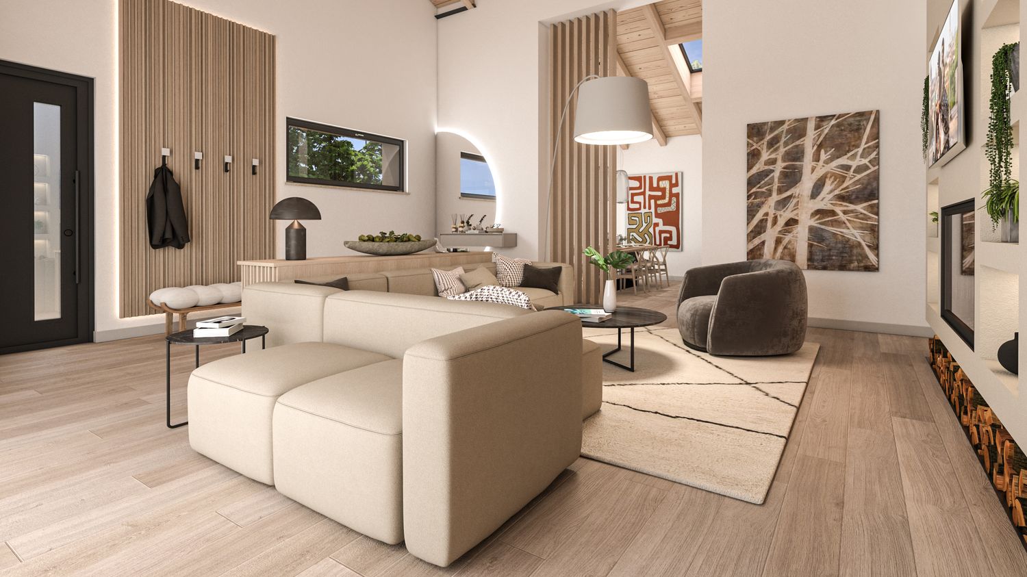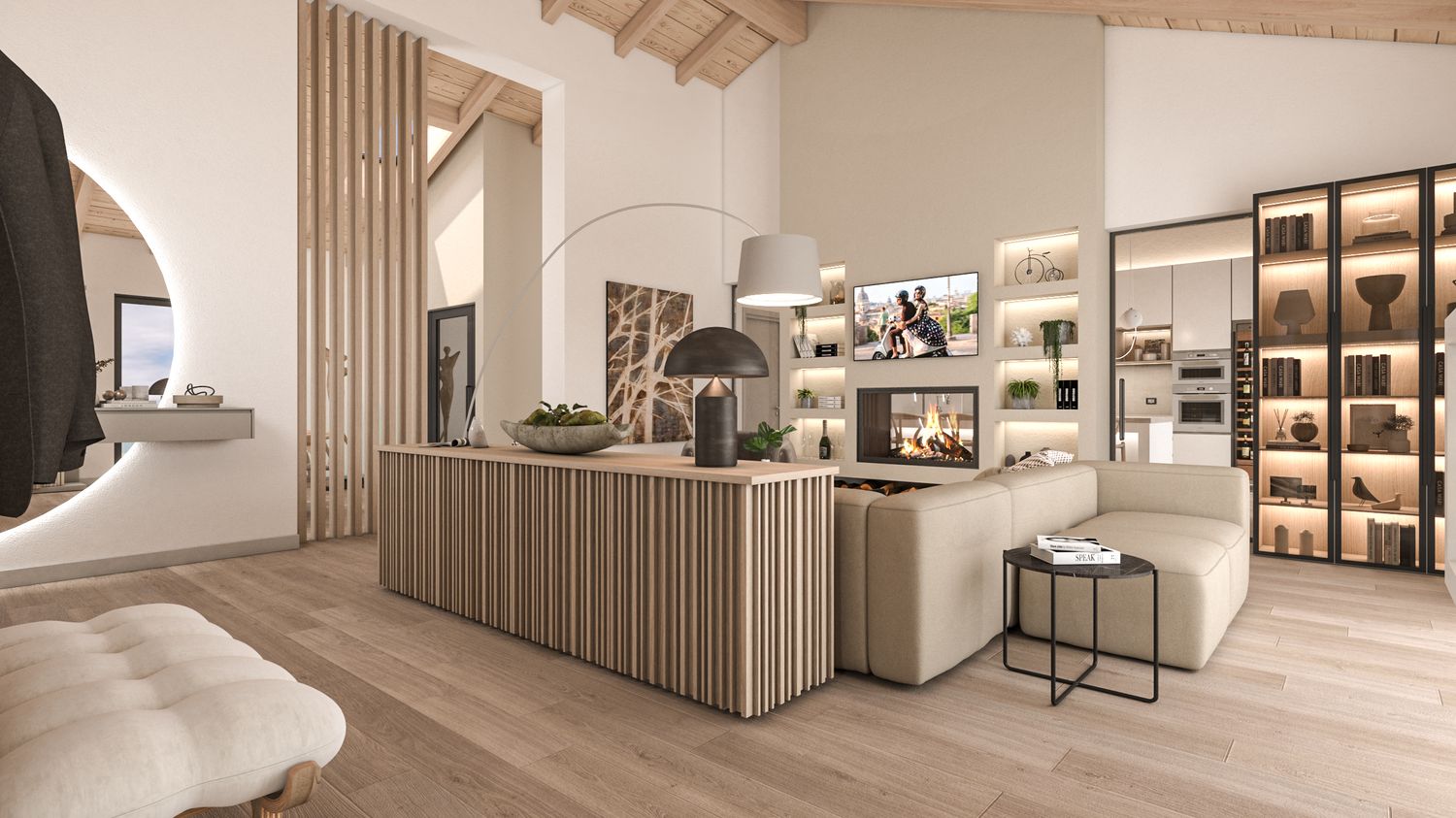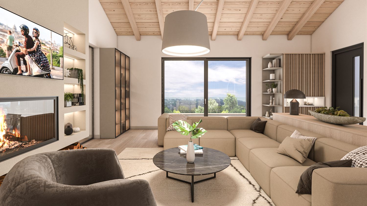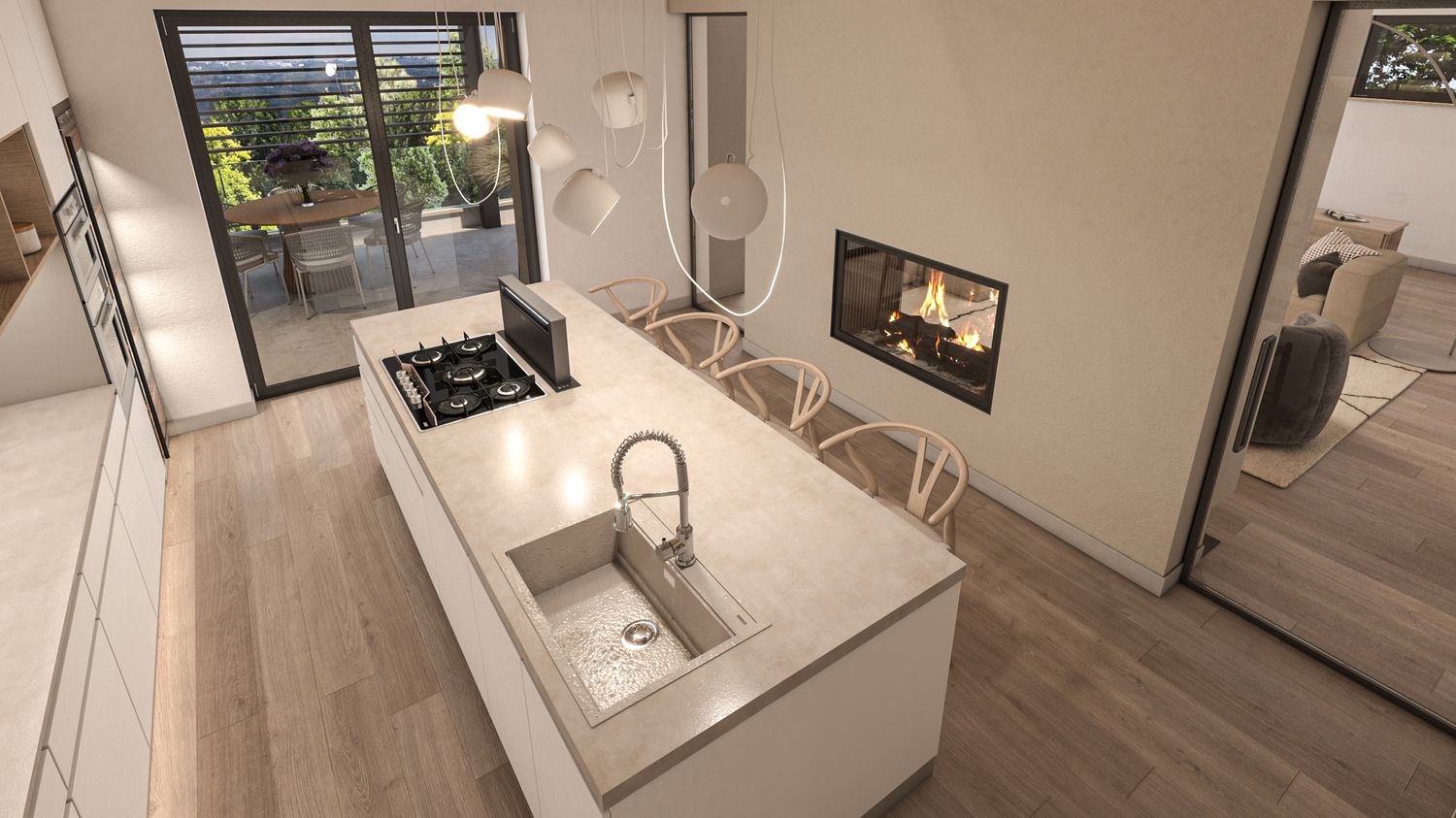 La casa viene riorganizzata su due livelli abitabili, collegati sia da una nuova scala interna sia da una scala esterna. Il piano terra accoglie il reparto notte in modo raccolto e protetto: tre camere da letto, di cui la matrimoniale con bagno en suite, un secondo bagno con accesso alla mini spa e una lavanderia. L’ampliamento consente inoltre di ricavare un garage interrato, perfettamente integrato nel pendio, oltre a locale tecnico e cantina. Il piano superiore è concepito come uno spazio fluido e luminoso, interamente dedicato alla vita quotidiana e alla convivialità, con una zona giorno panoramica affacciata sul paesaggio.