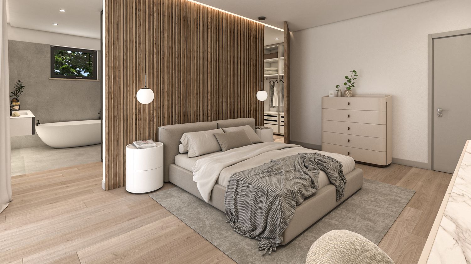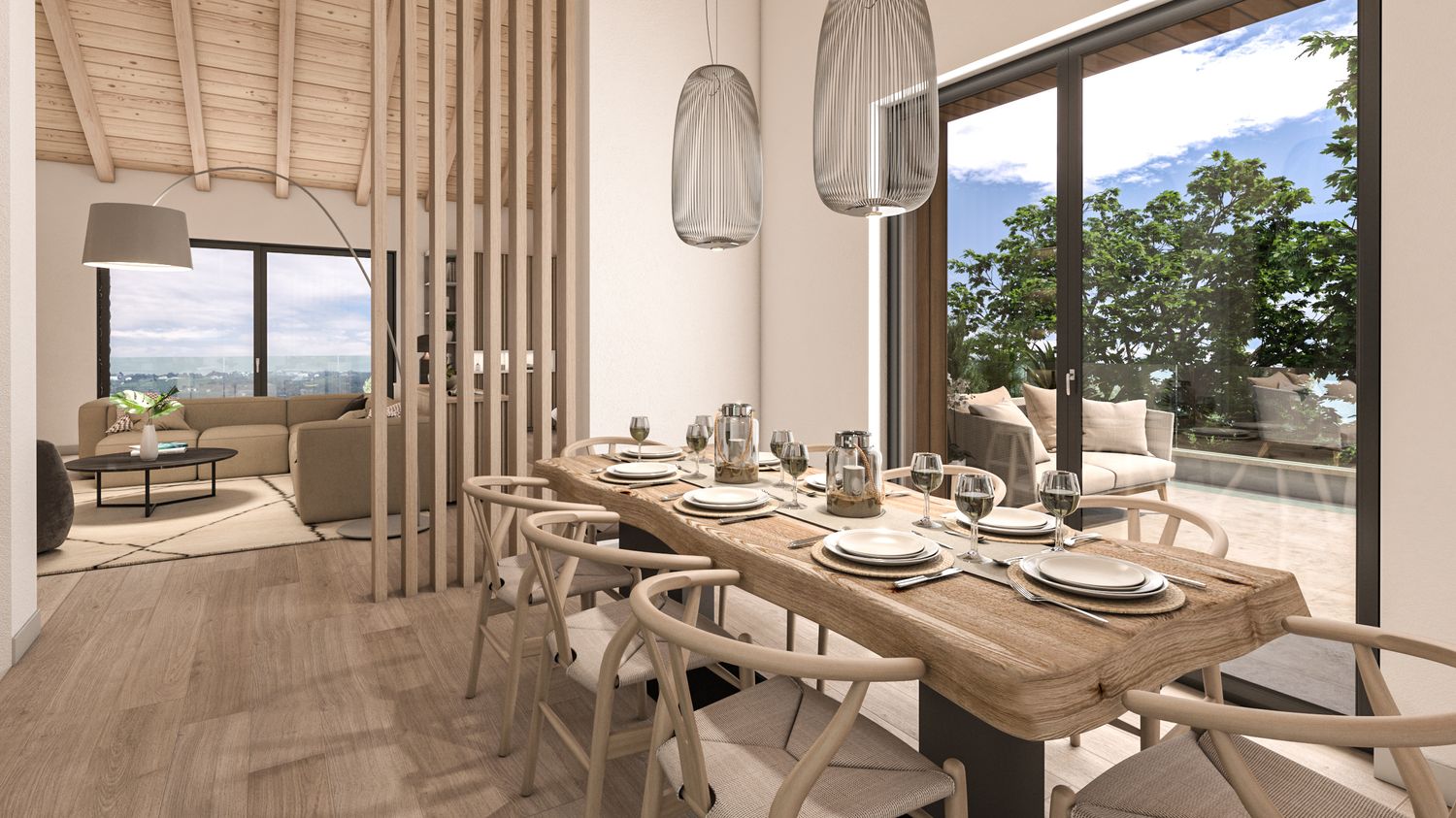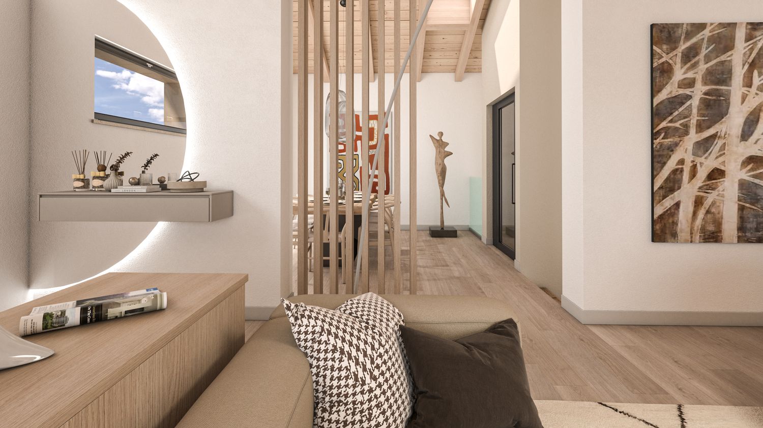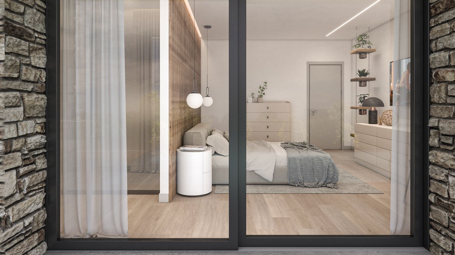 La casa viene riorganizzata su due livelli abitabili, collegati sia da una nuova scala interna sia da una scala esterna. Il piano terra accoglie il reparto notte in modo raccolto e protetto: tre camere da letto, di cui la matrimoniale con bagno en suite, un secondo bagno con accesso alla mini spa e una lavanderia. L’ampliamento consente inoltre di ricavare un garage interrato, perfettamente integrato nel pendio, oltre a locale tecnico e cantina. Il piano superiore è concepito come uno spazio fluido e luminoso, interamente dedicato alla vita quotidiana e alla convivialità, con una zona giorno panoramica affacciata sul paesaggio.