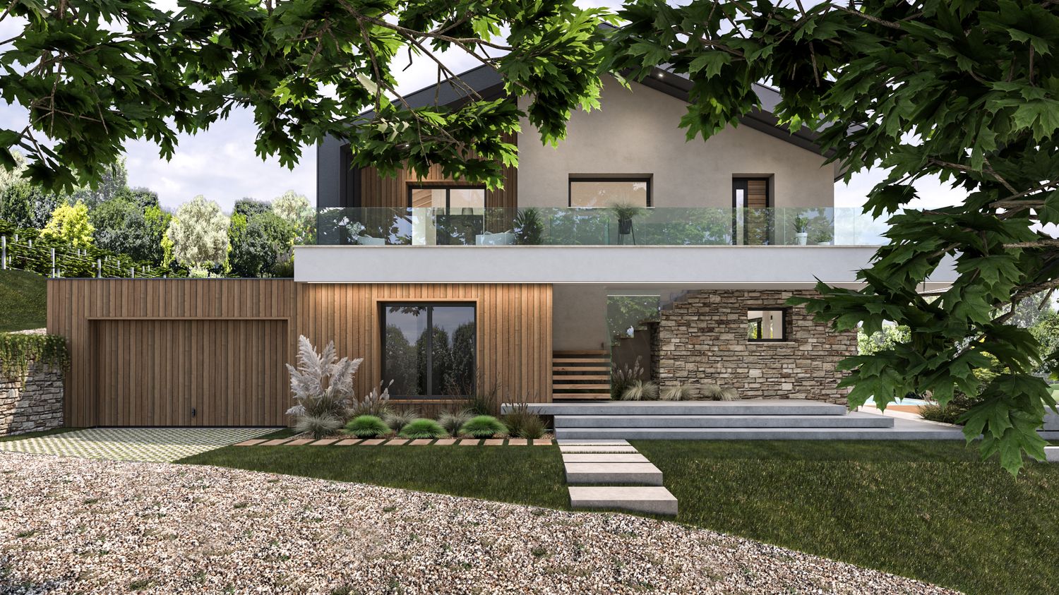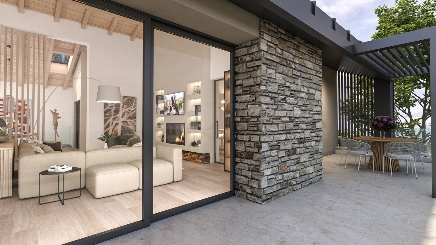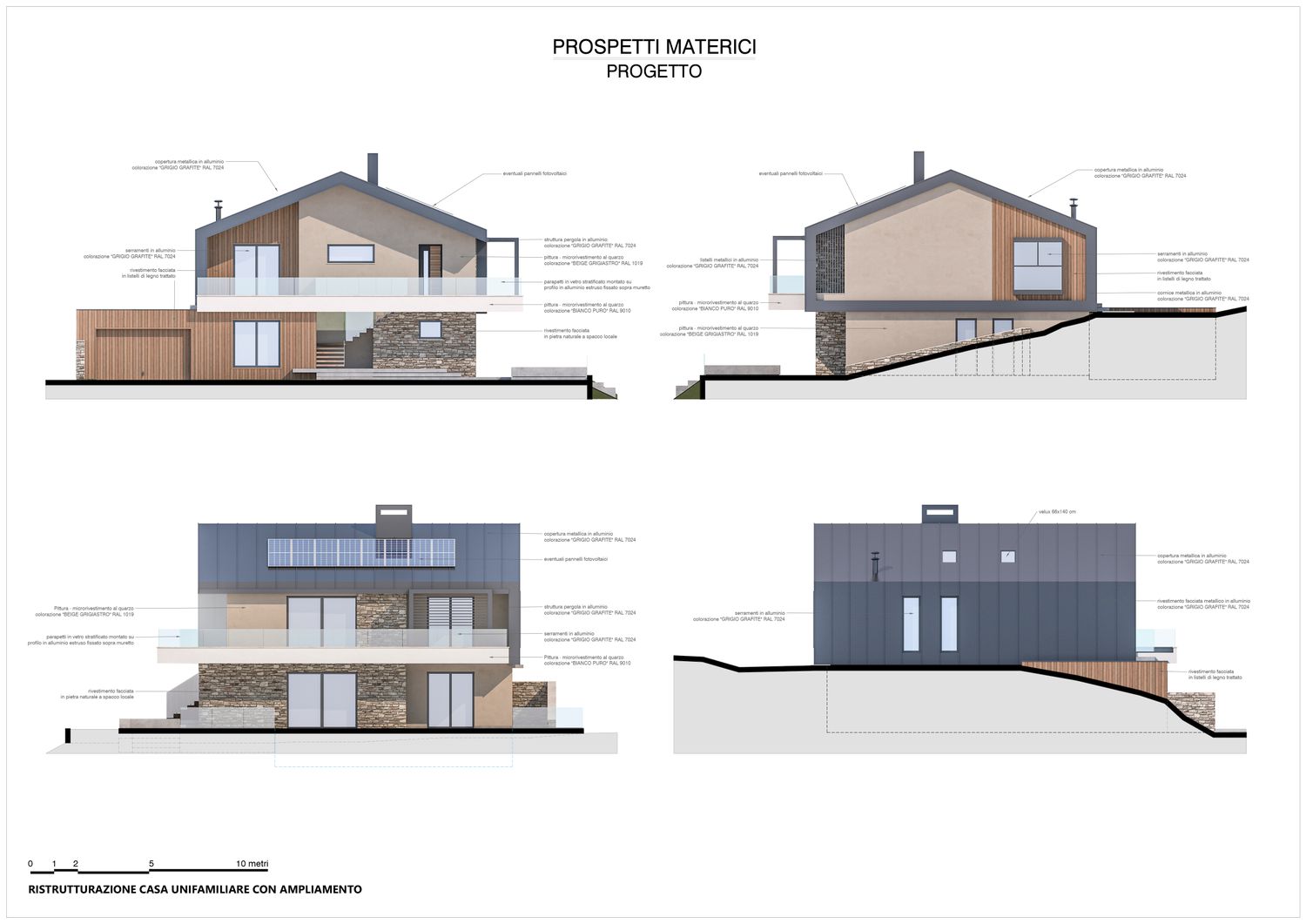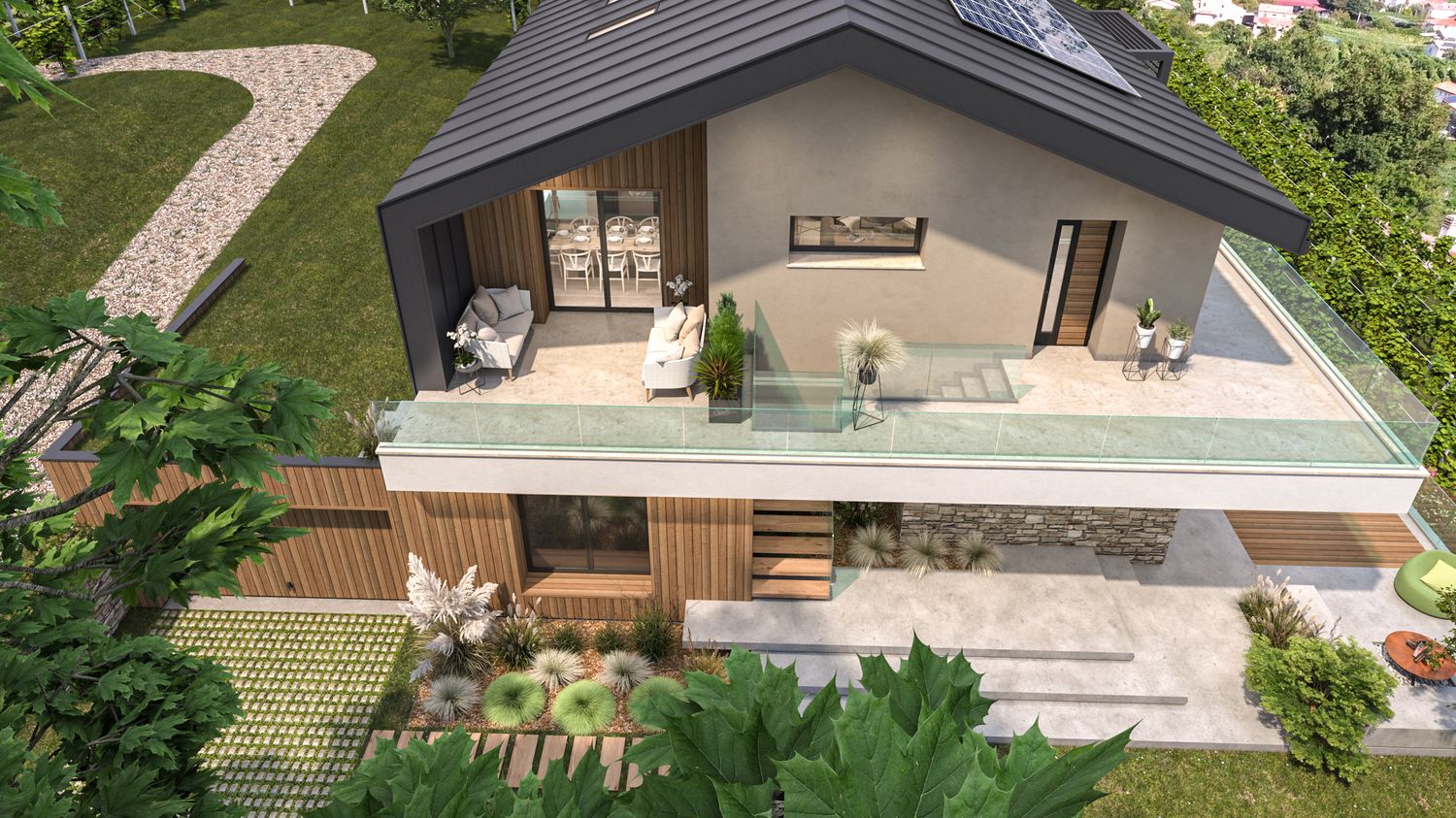 I prospetti alternano intonaco chiaro in tonalità naturali, doghe verticali in legno che richiamano i fienili rurali, pietra locale per ancorare visivamente il volume al suolo, cornici metalliche e frangisole che esprimono la modernità dell’intervento. Le grandi aperture rivolte a sud incorniciano il paesaggio collinare, garantendo luminosità agli ambienti principali, mentre aggetti e parapetti in vetro amplificano la relazione tra interno ed esterno.