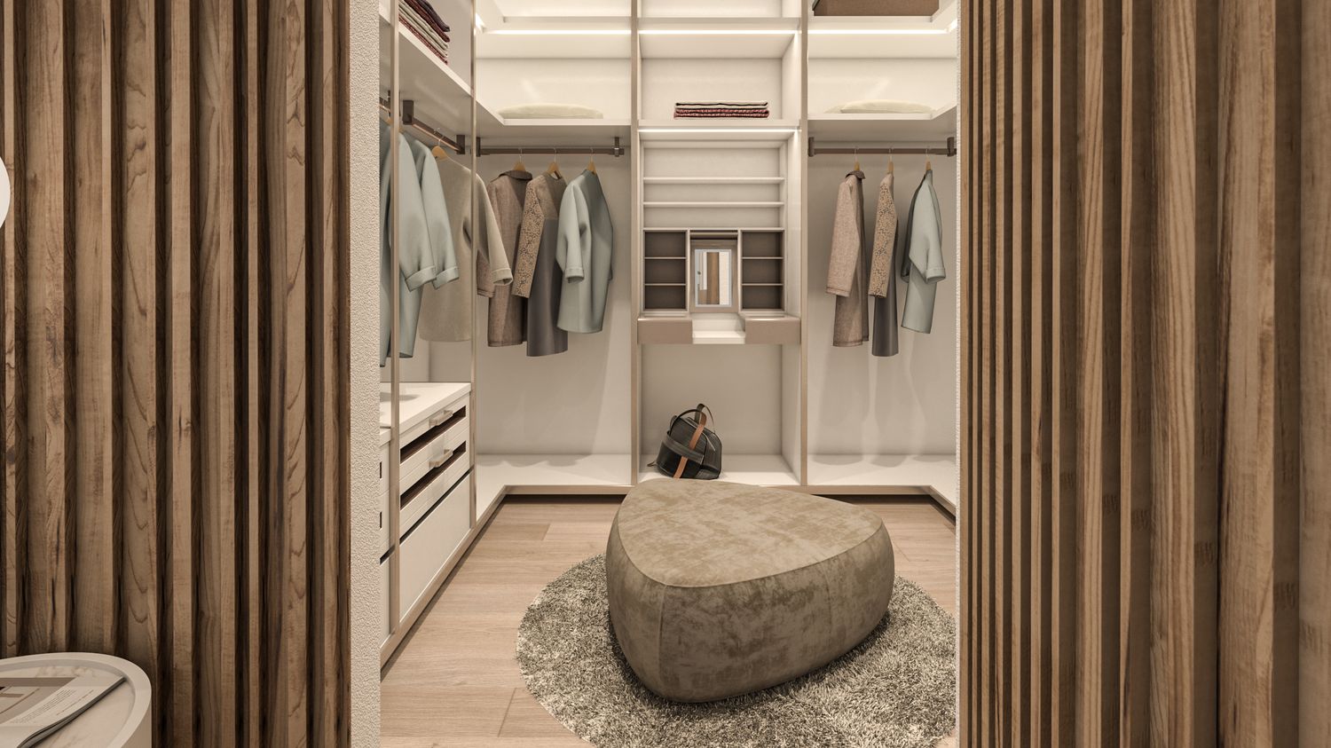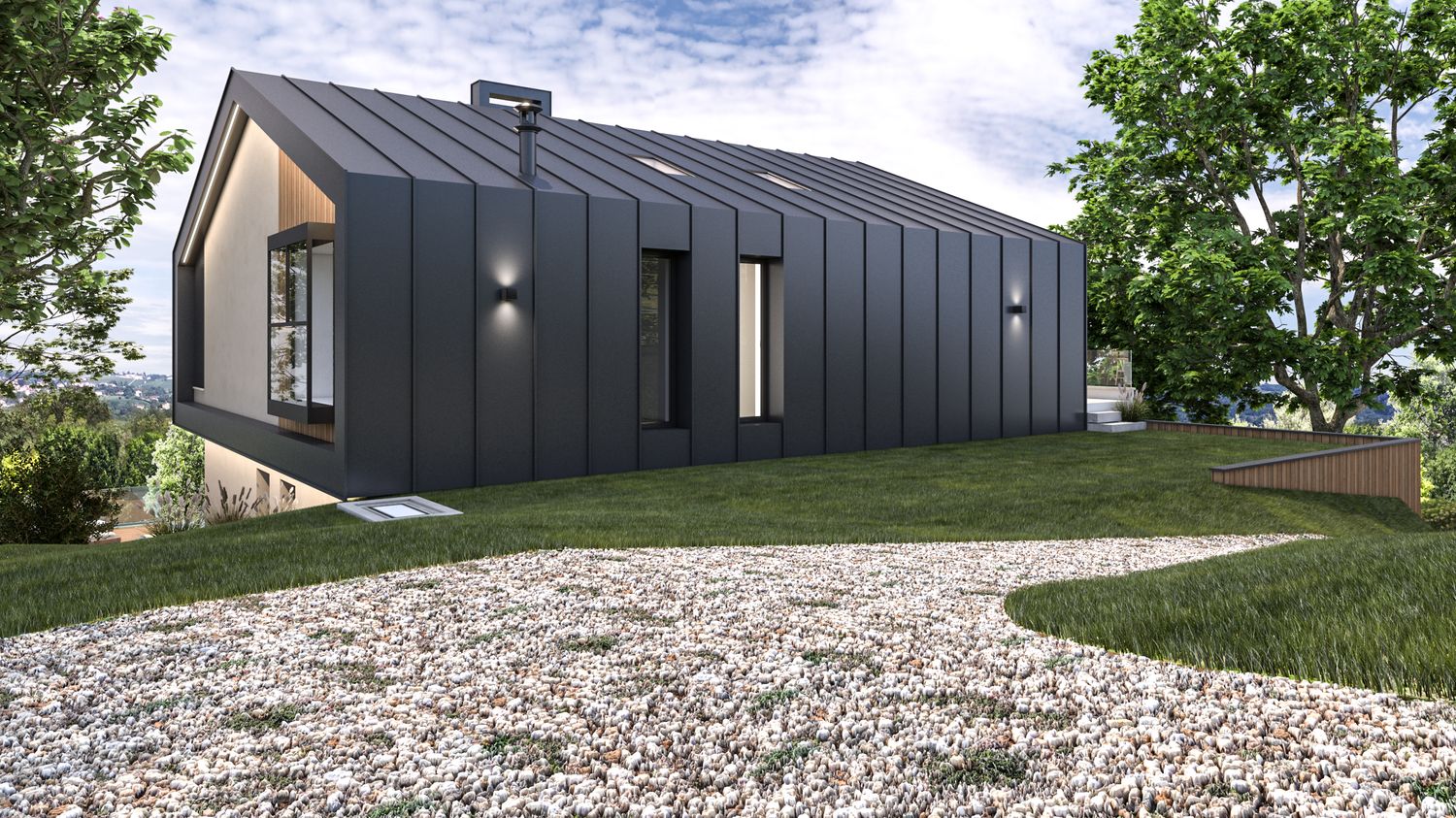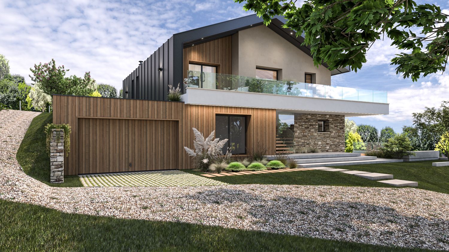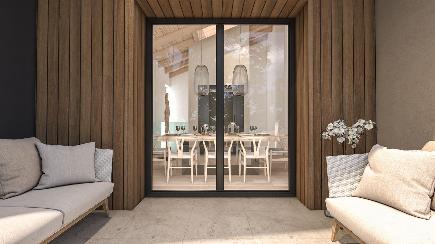 I prospetti alternano intonaco chiaro in tonalità naturali, doghe verticali in legno che richiamano i fienili rurali, pietra locale per ancorare visivamente il volume al suolo, cornici metalliche e frangisole che esprimono la modernità dell’intervento. Le grandi aperture rivolte a sud incorniciano il paesaggio collinare, garantendo luminosità agli ambienti principali, mentre aggetti e parapetti in vetro amplificano la relazione tra interno ed esterno.