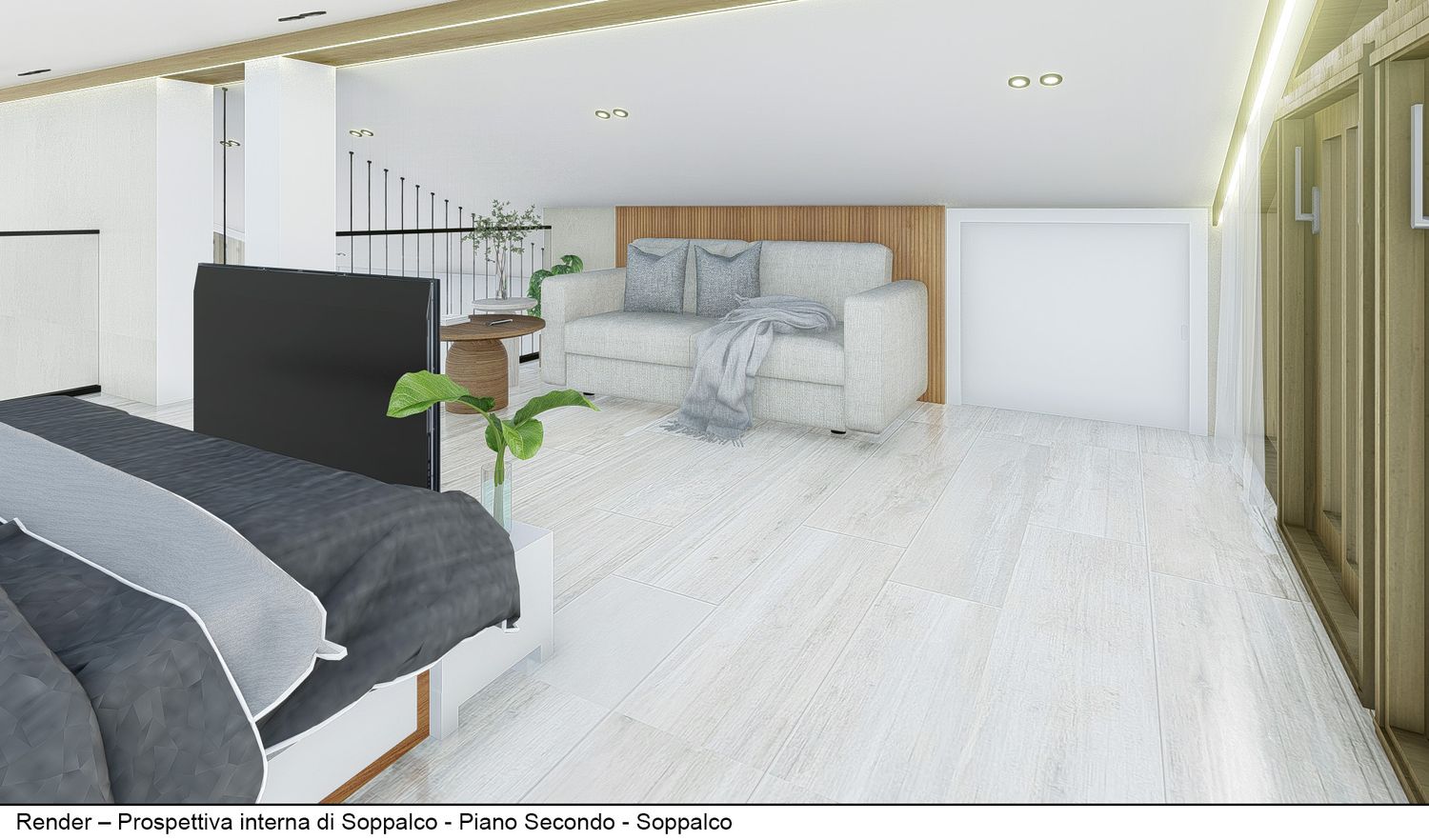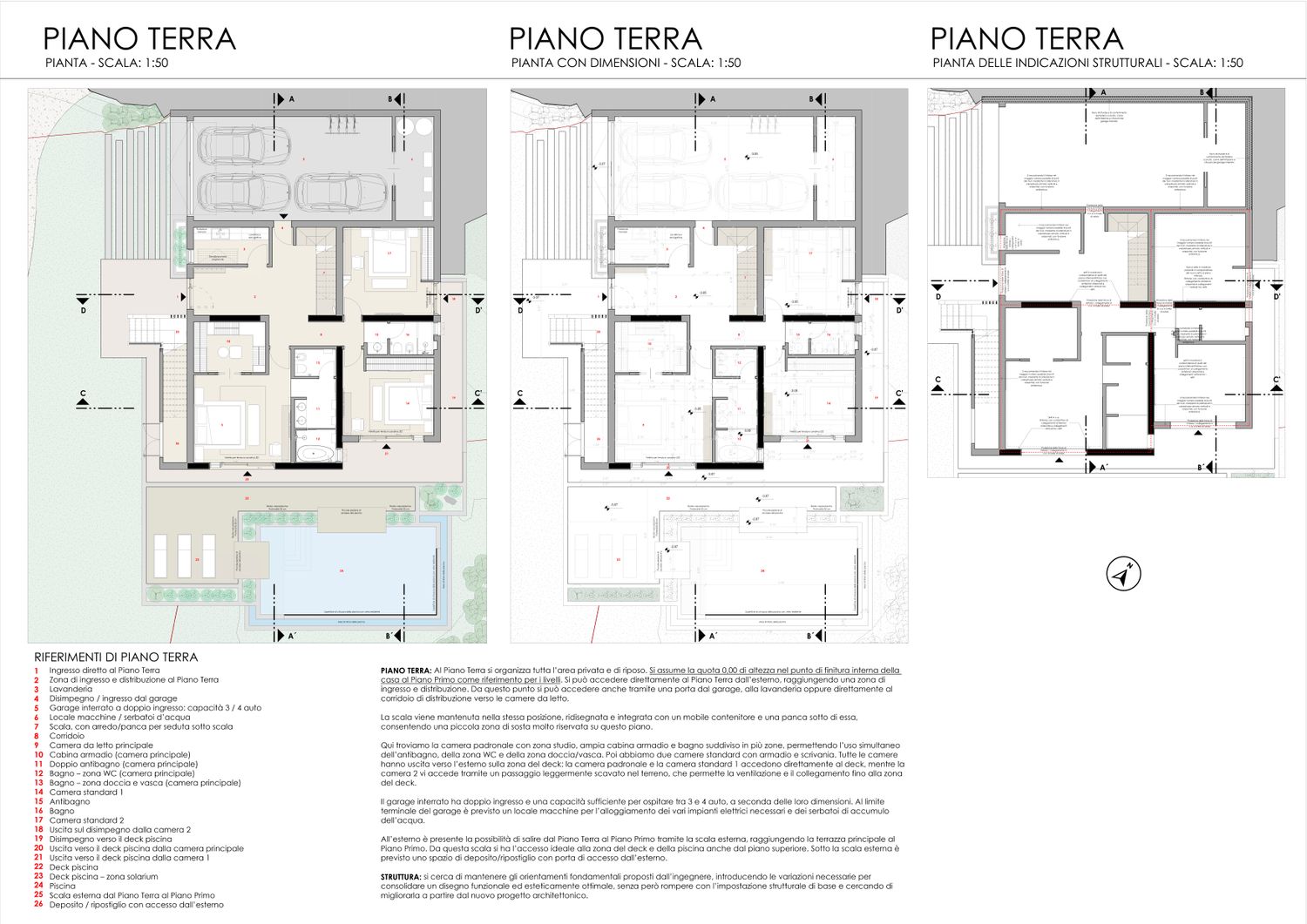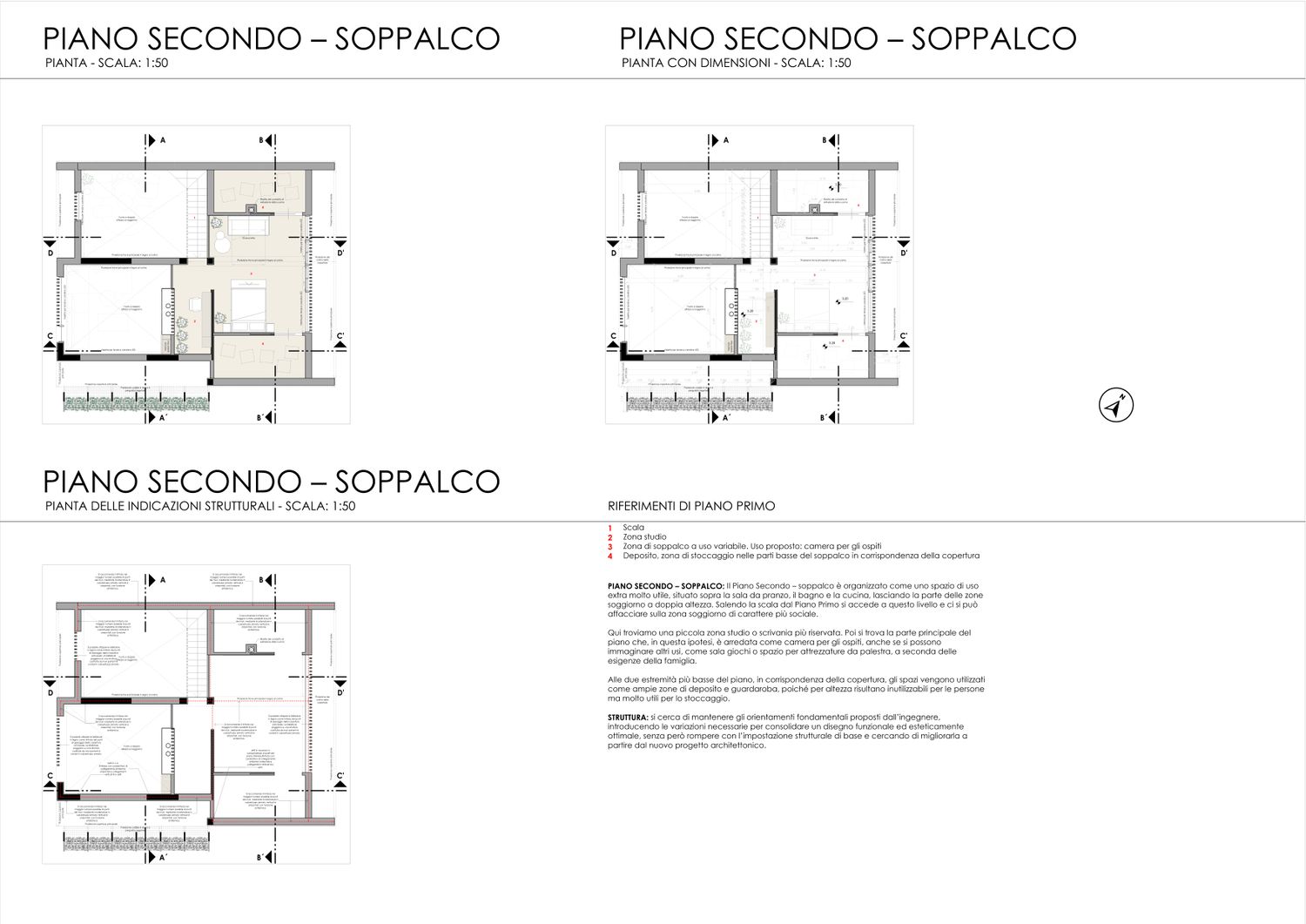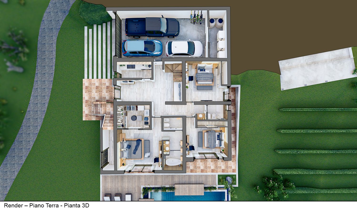 Il garage interrato dispone di doppio accesso e di una capacità per tre o quattro veicoli, includendo un locale tecnico per impianti e serbatoi di accumulo dell’acqua. Tramite la scala esterna si collegano il Piano Terra e l’area piscina direttamente con la terrazza del Piano Primo, consentendo un uso fluido tra i livelli. Il soppalco del Piano Secondo funziona come spazio flessibile di uso aggiuntivo, con vista sulla doppia altezza del soggiorno. Qui si trova una zona studio e si propone una camera per gli ospiti, pur potendo prevedere altri usi come sala giochi o area per l’allenamento. Questo soppalco dispone inoltre di ampi spazi laterali destinati a deposito, grazie alla minore altezza utile sotto la copertura.