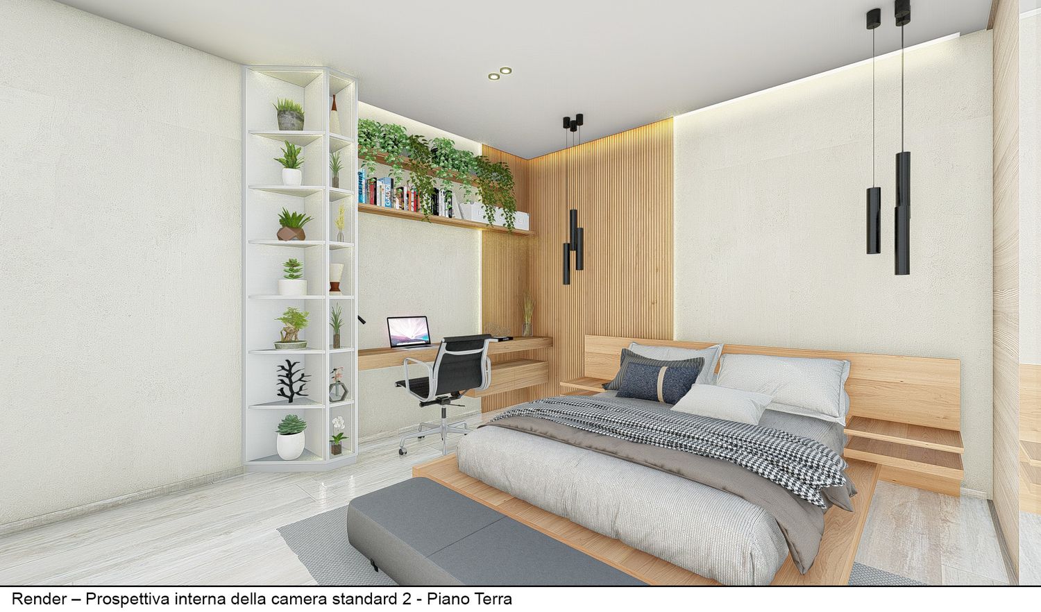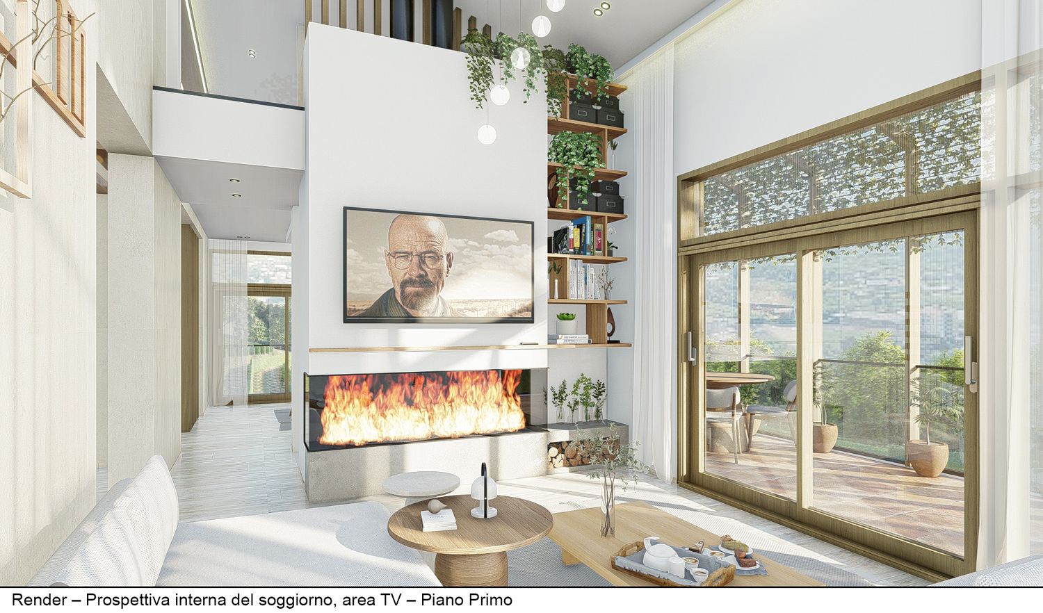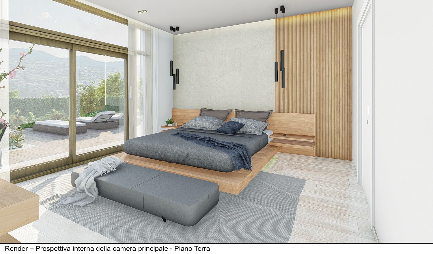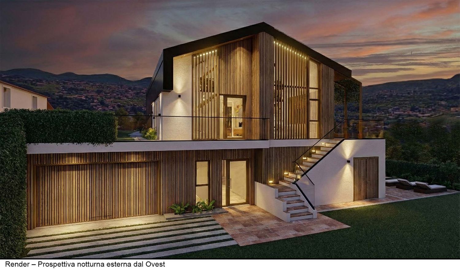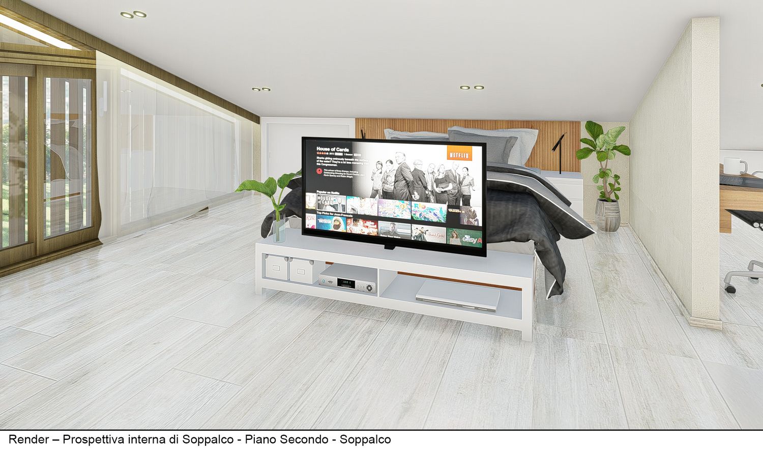 Il garage interrato dispone di doppio accesso e di una capacità per tre o quattro veicoli, includendo un locale tecnico per impianti e serbatoi di accumulo dell’acqua. Tramite la scala esterna si collegano il Piano Terra e l’area piscina direttamente con la terrazza del Piano Primo, consentendo un uso fluido tra i livelli. Il soppalco del Piano Secondo funziona come spazio flessibile di uso aggiuntivo, con vista sulla doppia altezza del soggiorno. Qui si trova una zona studio e si propone una camera per gli ospiti, pur potendo prevedere altri usi come sala giochi o area per l’allenamento. Questo soppalco dispone inoltre di ampi spazi laterali destinati a deposito, grazie alla minore altezza utile sotto la copertura.