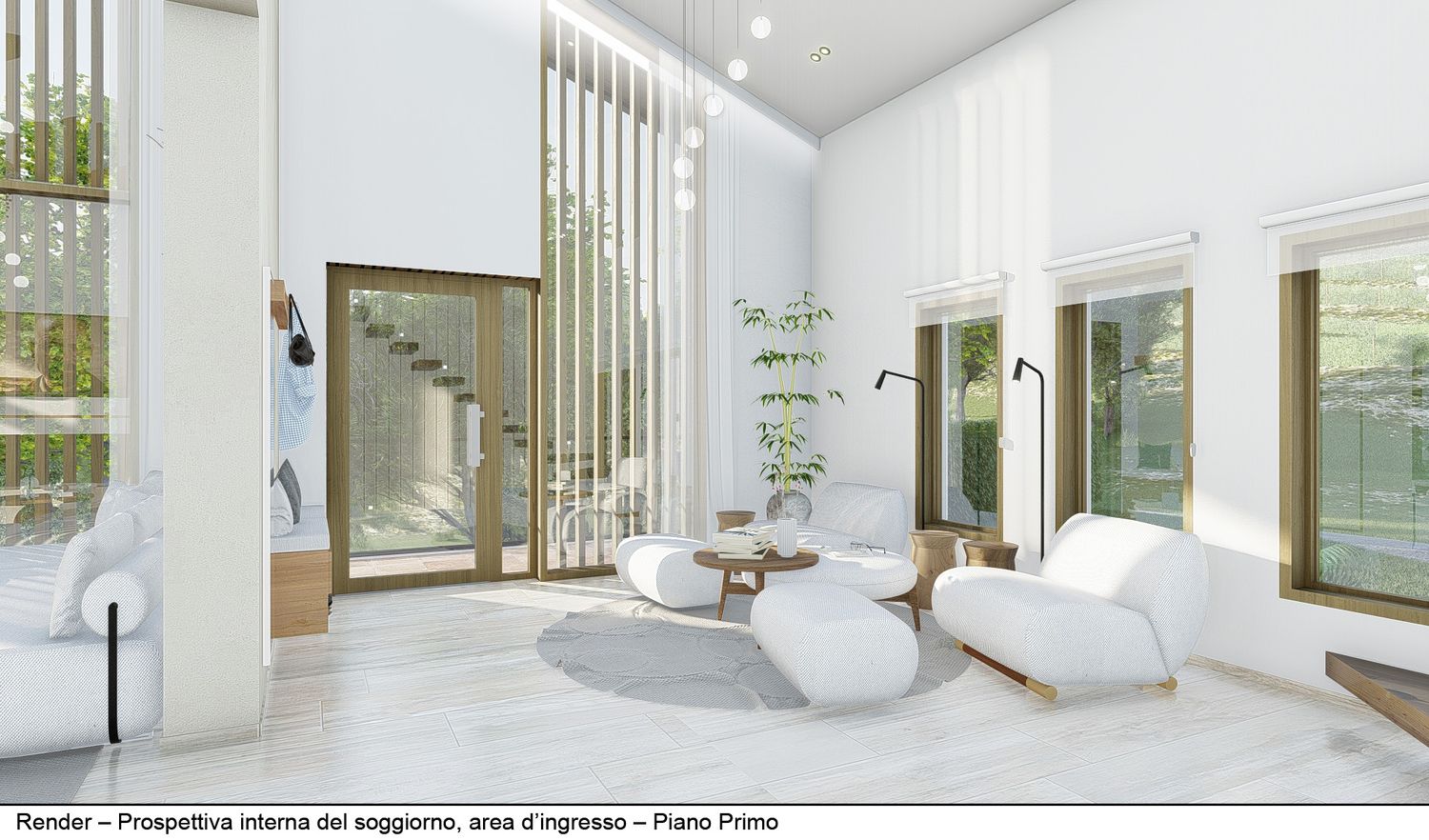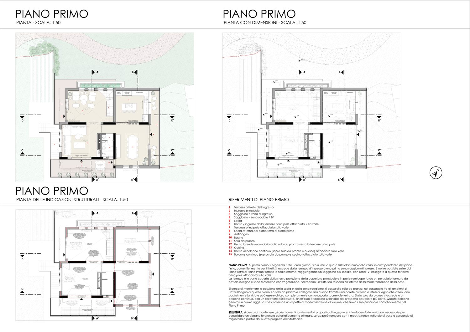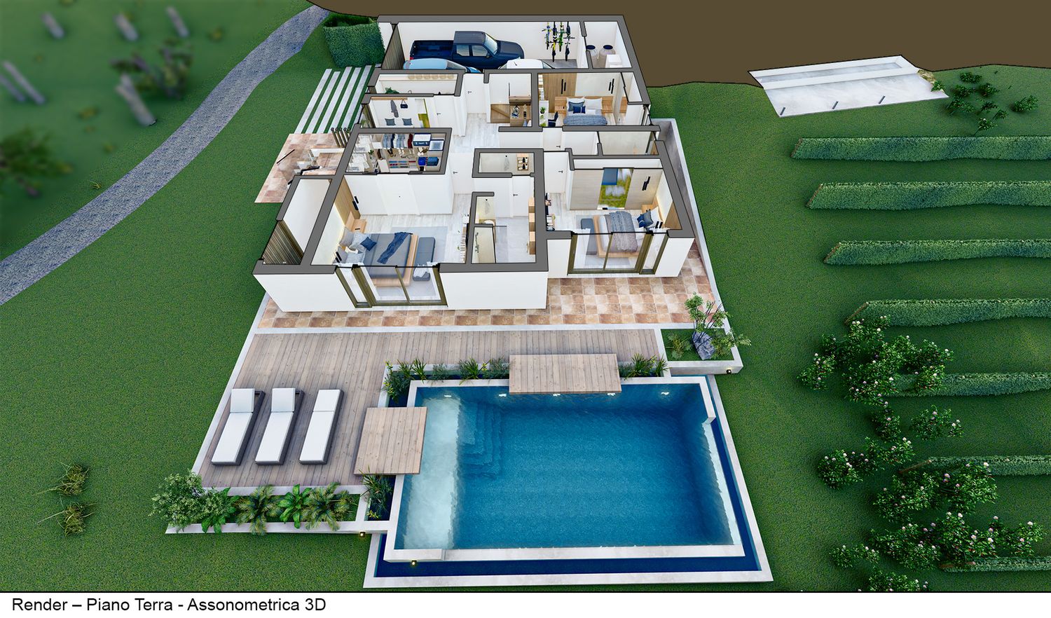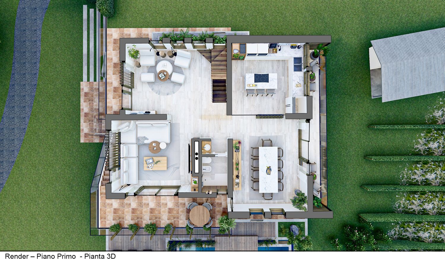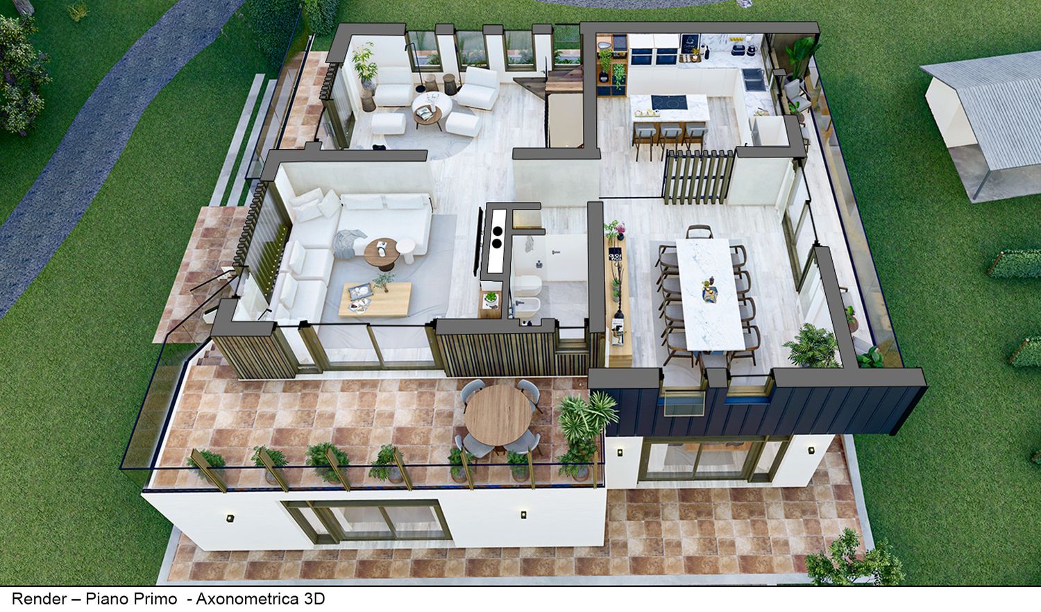 Gentile cliente, il progetto propone la riorganizzazione integrale dell’abitazione, mantenendo il perimetro originale fondamentale e le principali premesse strutturali, consolidando un linguaggio contemporaneo che dialoga con l’identità preesistente. Al Piano Primo si sviluppa tutta l’area sociale, accedendo dalla terrazza d’ingresso a un soggiorno con area d’ingresso e la scala, ridisegnata, collocata nello stesso punto, rispettando il vano esistente. Dalla terrazza principale si accede inoltre a un soggiorno più sociale con zona TV, raggiungibile tramite la scala esterna preesistente. La terrazza combina la proiezione della copertura principale con un pergolato in legno e tiranti metallici coperti da vegetazione, integrando un’estetica mediterranea reinterpretata all’interno del nuovo linguaggio moderno della casa.