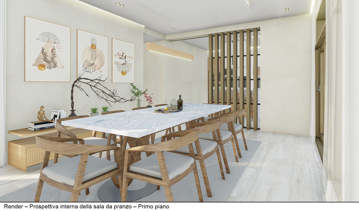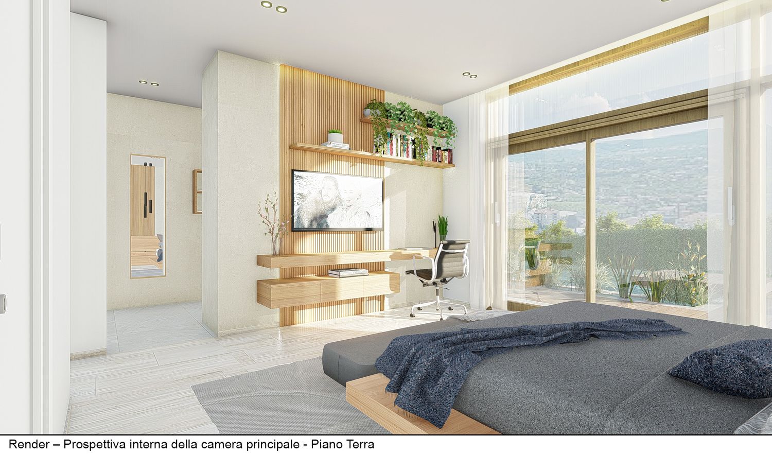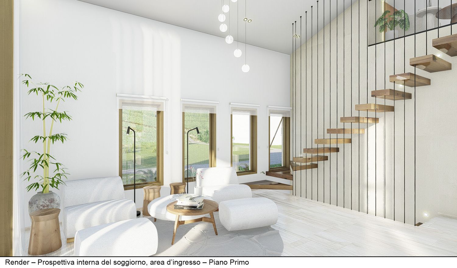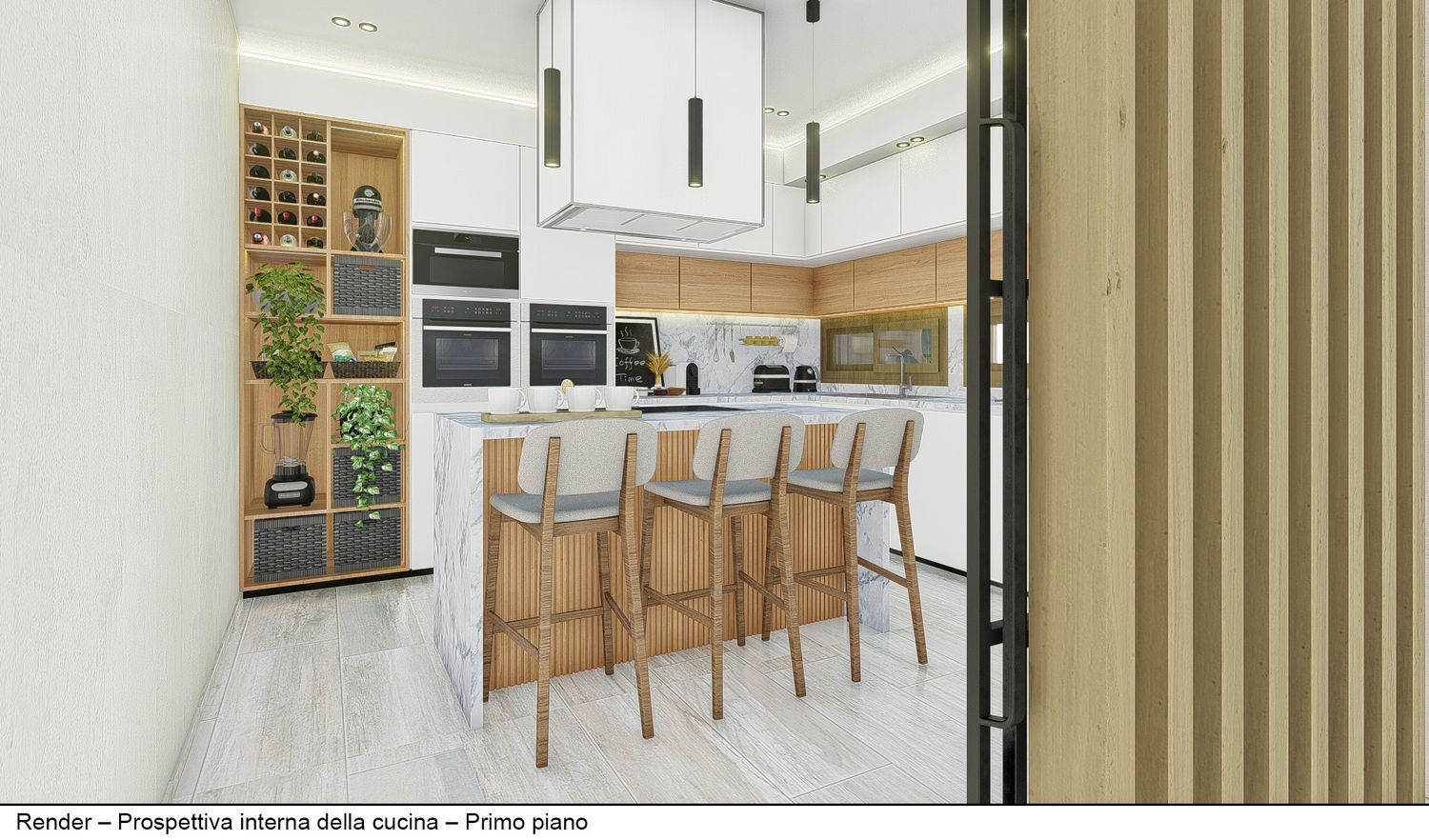 Gentile cliente, il progetto propone la riorganizzazione integrale dell’abitazione, mantenendo il perimetro originale fondamentale e le principali premesse strutturali, consolidando un linguaggio contemporaneo che dialoga con l’identità preesistente. Al Piano Primo si sviluppa tutta l’area sociale, accedendo dalla terrazza d’ingresso a un soggiorno con area d’ingresso e la scala, ridisegnata, collocata nello stesso punto, rispettando il vano esistente. Dalla terrazza principale si accede inoltre a un soggiorno più sociale con zona TV, raggiungibile tramite la scala esterna preesistente. La terrazza combina la proiezione della copertura principale con un pergolato in legno e tiranti metallici coperti da vegetazione, integrando un’estetica mediterranea reinterpretata all’interno del nuovo linguaggio moderno della casa.