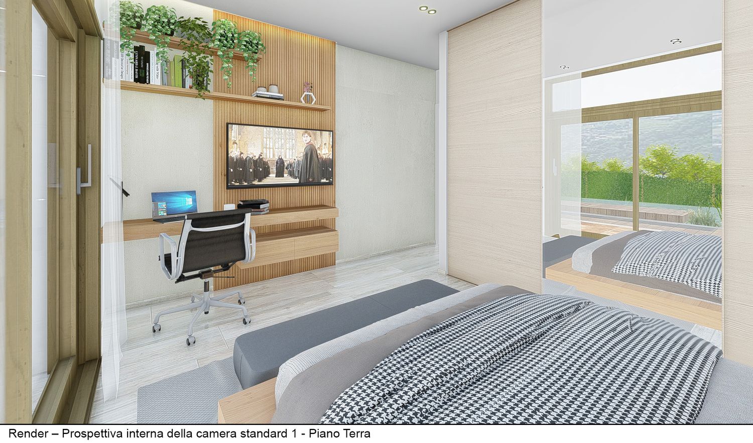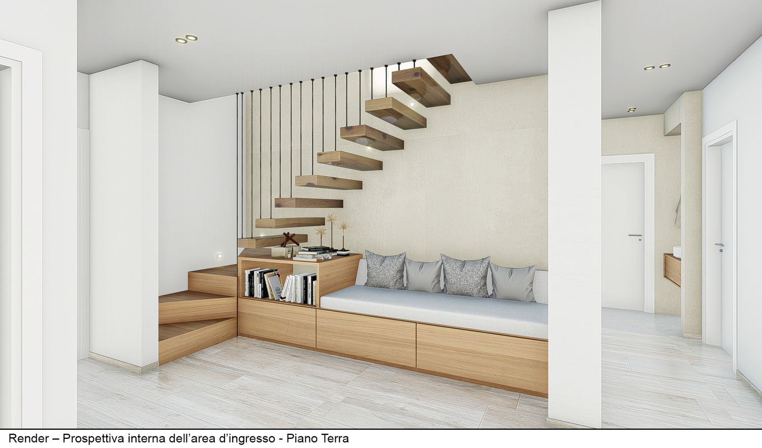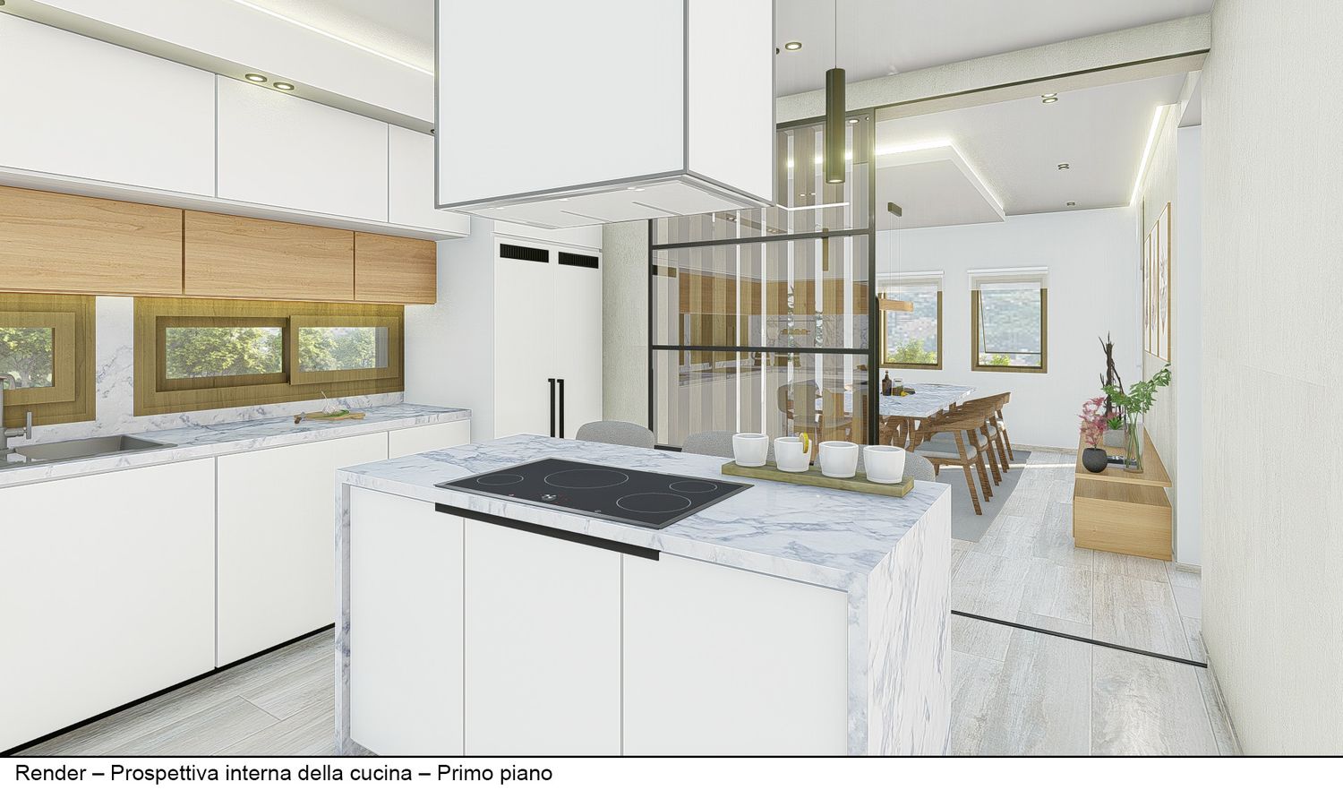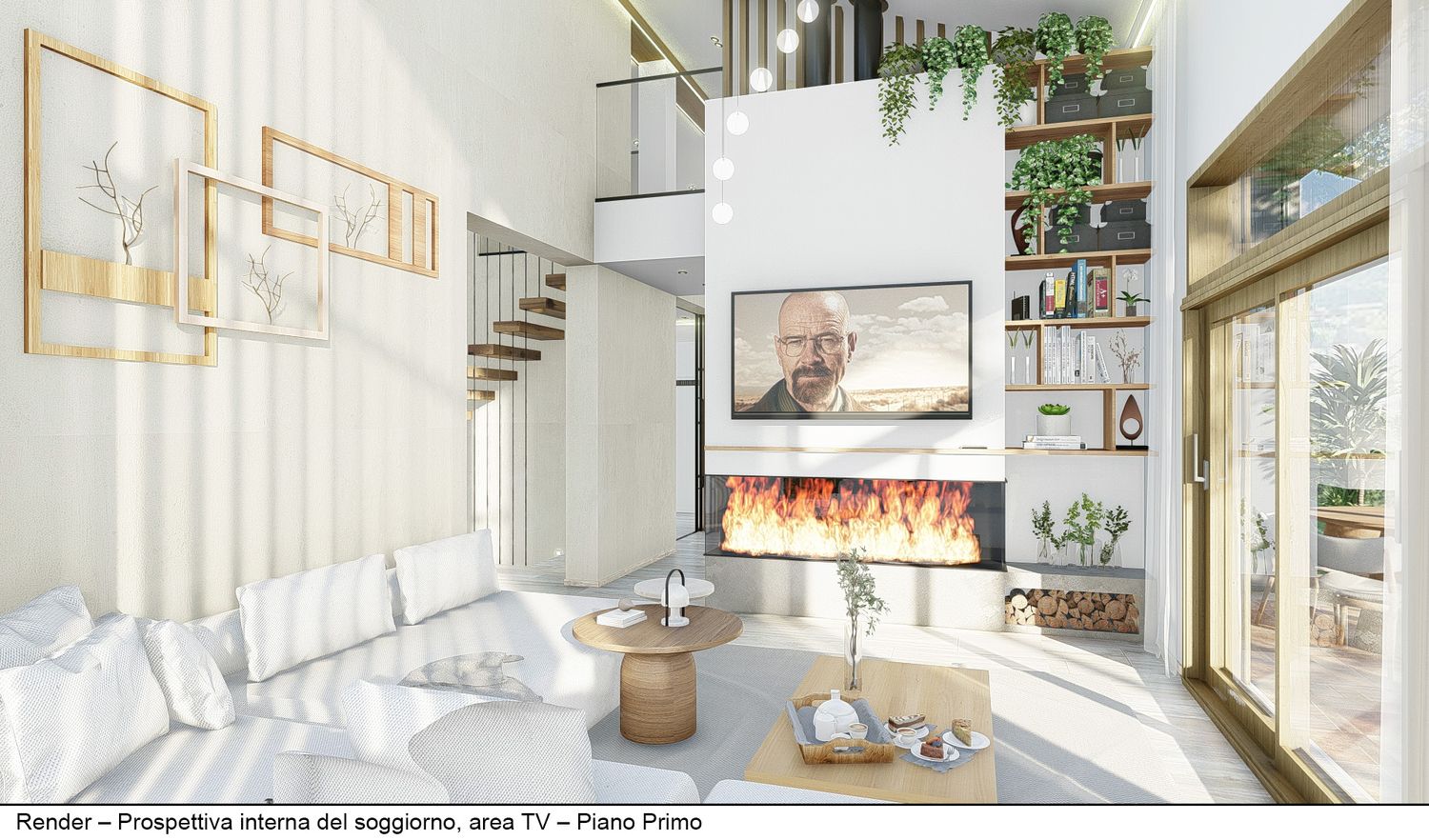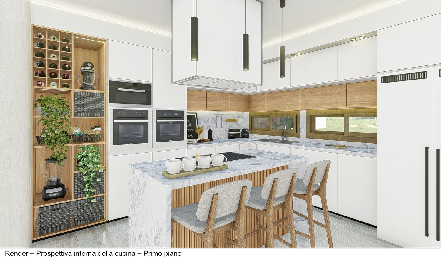 Gentile cliente, il progetto propone la riorganizzazione integrale dell’abitazione, mantenendo il perimetro originale fondamentale e le principali premesse strutturali, consolidando un linguaggio contemporaneo che dialoga con l’identità preesistente. Al Piano Primo si sviluppa tutta l’area sociale, accedendo dalla terrazza d’ingresso a un soggiorno con area d’ingresso e la scala, ridisegnata, collocata nello stesso punto, rispettando il vano esistente. Dalla terrazza principale si accede inoltre a un soggiorno più sociale con zona TV, raggiungibile tramite la scala esterna preesistente. La terrazza combina la proiezione della copertura principale con un pergolato in legno e tiranti metallici coperti da vegetazione, integrando un’estetica mediterranea reinterpretata all’interno del nuovo linguaggio moderno della casa.