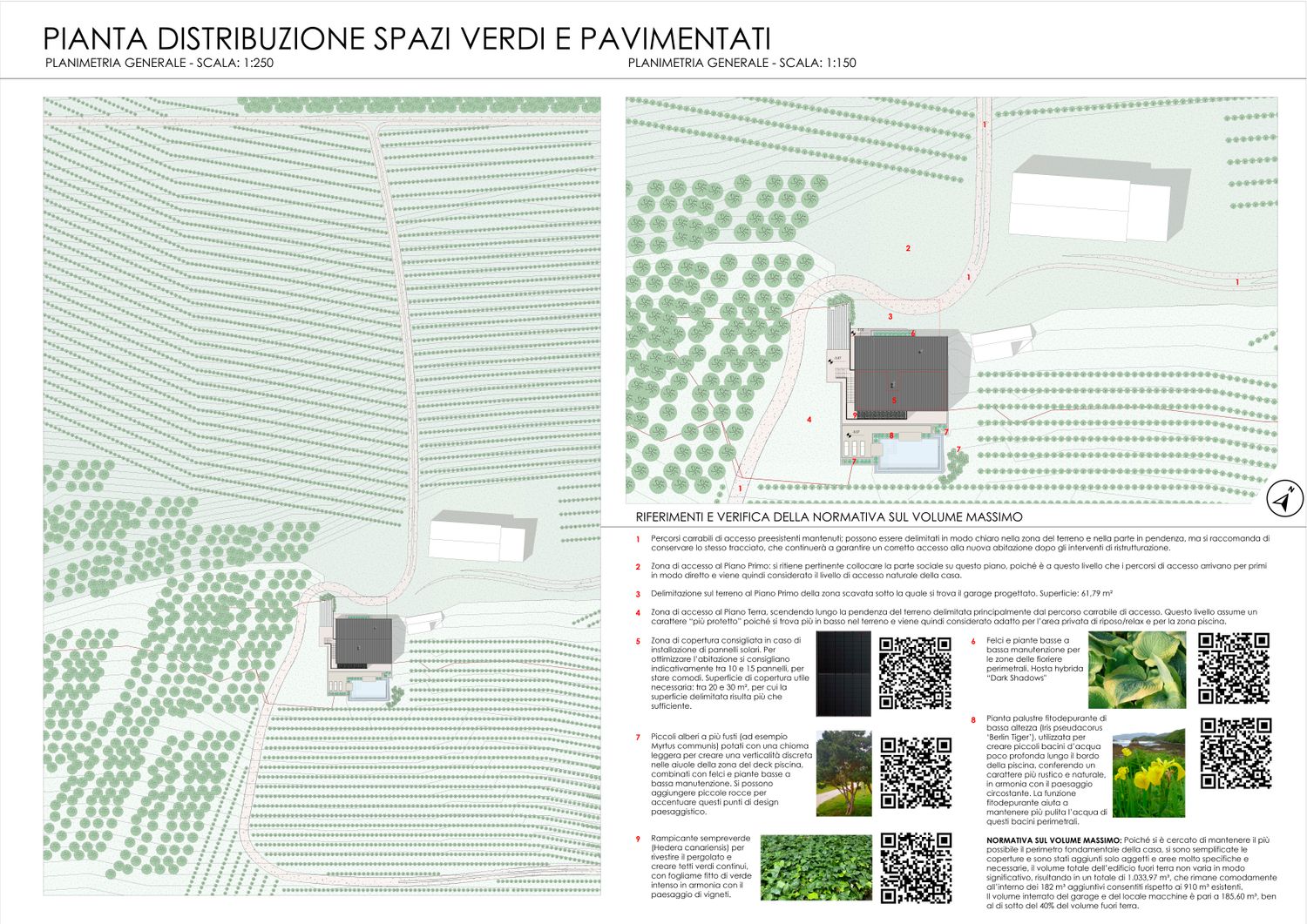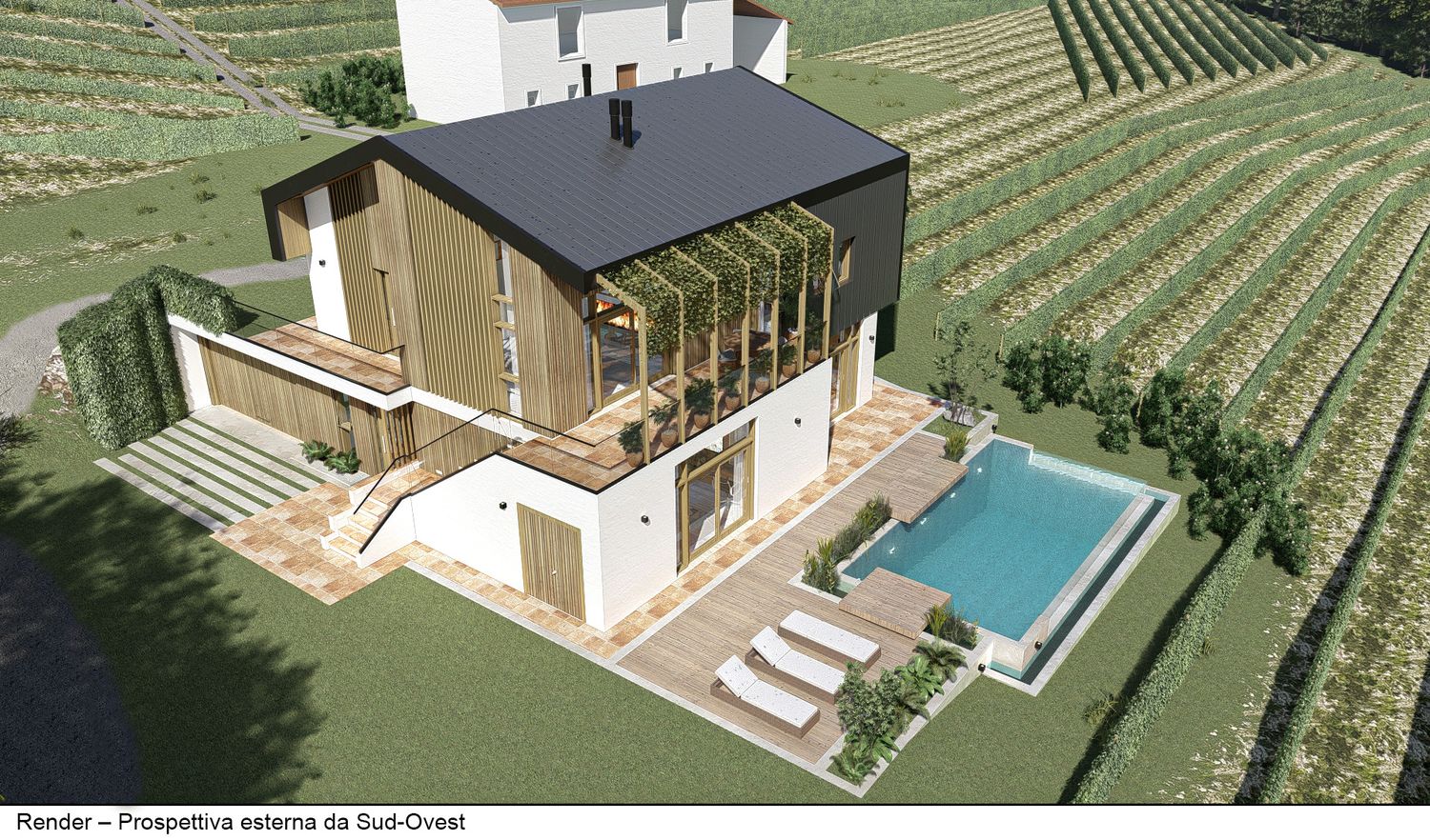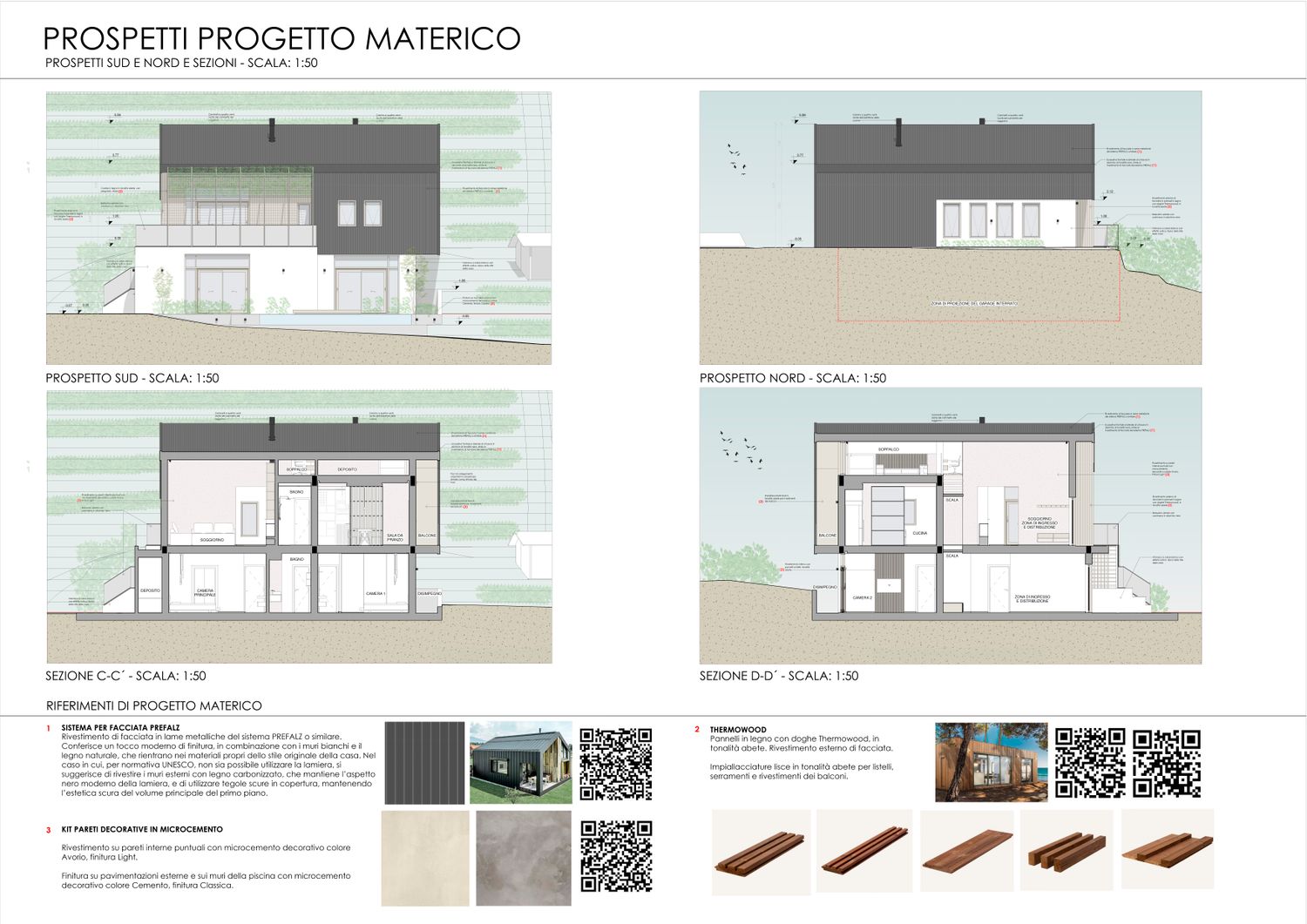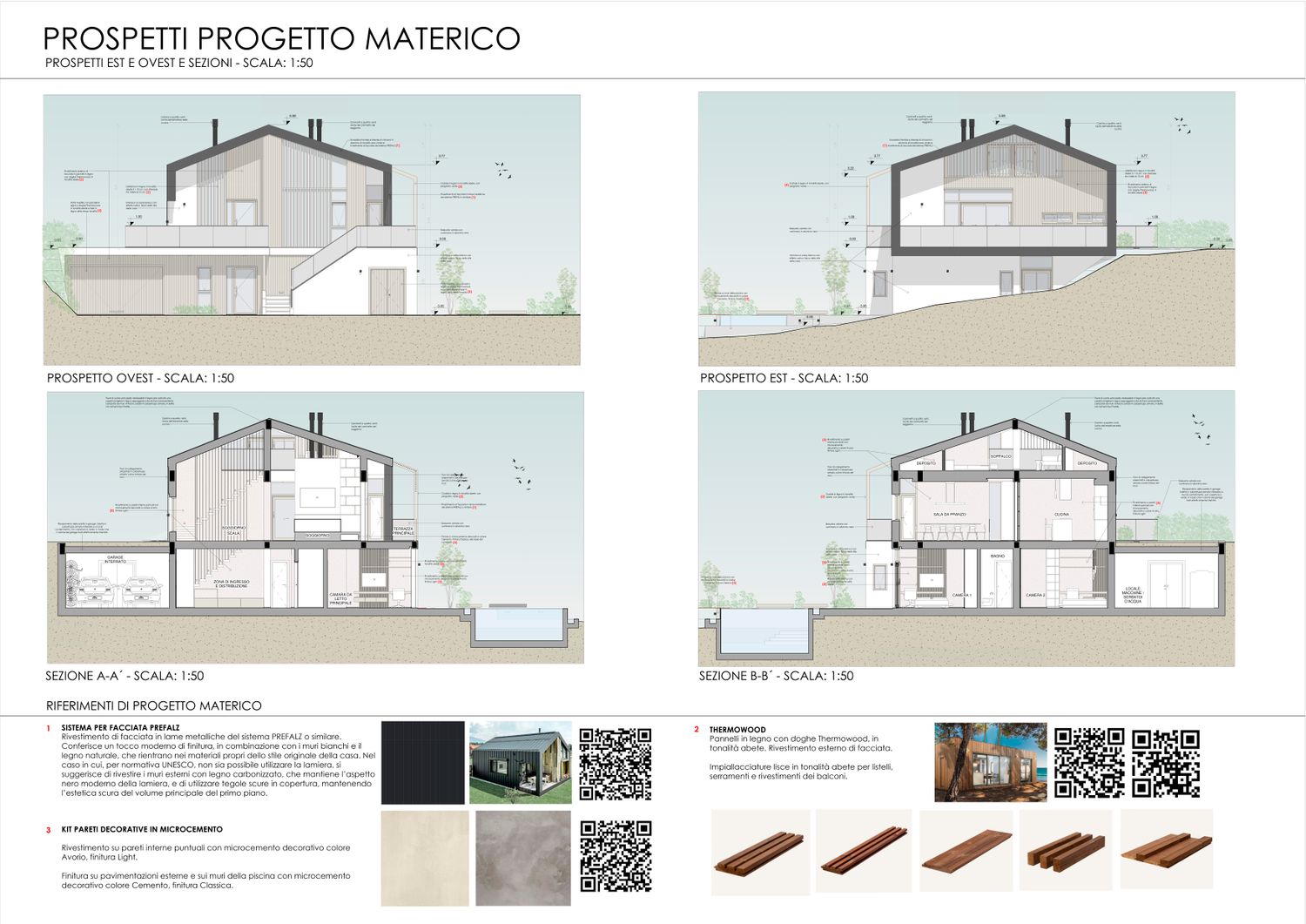 Per quanto riguarda i materiali, si conserva la base bianca e l’intonaco tradizionale a calce del volume originale, integrando un linguaggio moderno al livello superiore mediante lamiera nera tipo PREFALZ, legno naturale e listonati che modulano la percezione delle superfici vetrate. Nel caso strettamente necessario, a causa della normativa UNESCO, la lamiera può essere sostituita da legno carbonizzato e la copertura da tegole scure, mantenendo comunque l’estetica proposta. Il paesaggio rafforza l’integrazione con il contesto rurale: il pergolato è rivestito con rampicanti per creare tetti verdi continui, mentre la piscina incorpora zone d’acqua bassa con piante idonee, conferendo un carattere rustico-naturale e favorendo la depurazione dell’acqua.