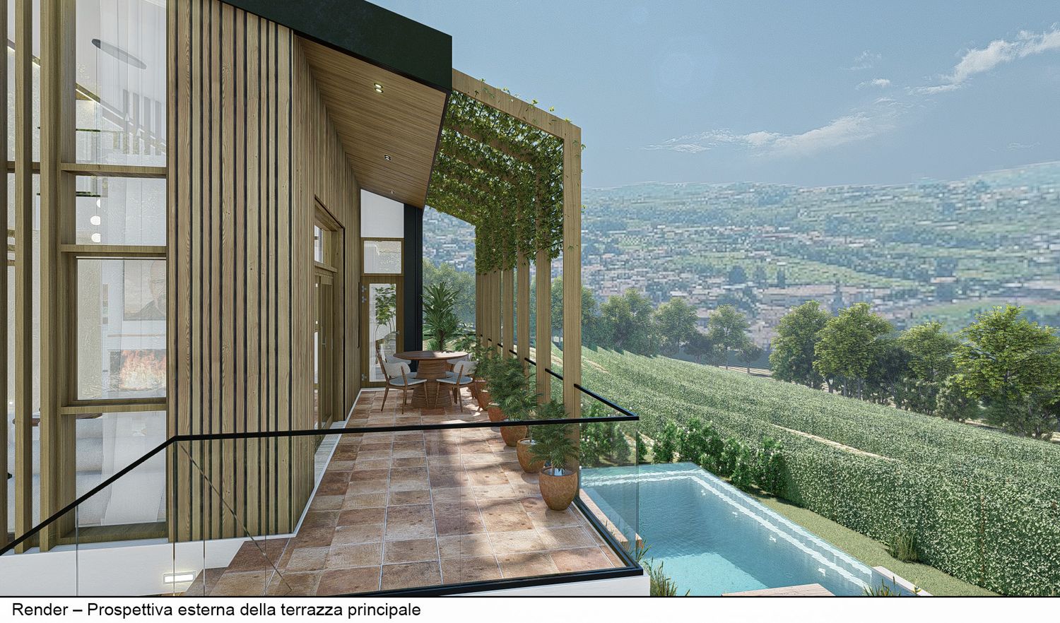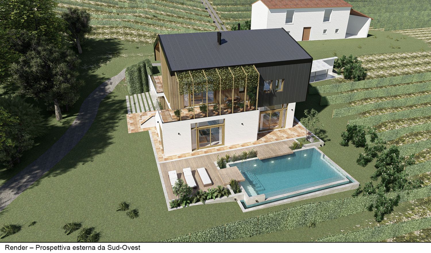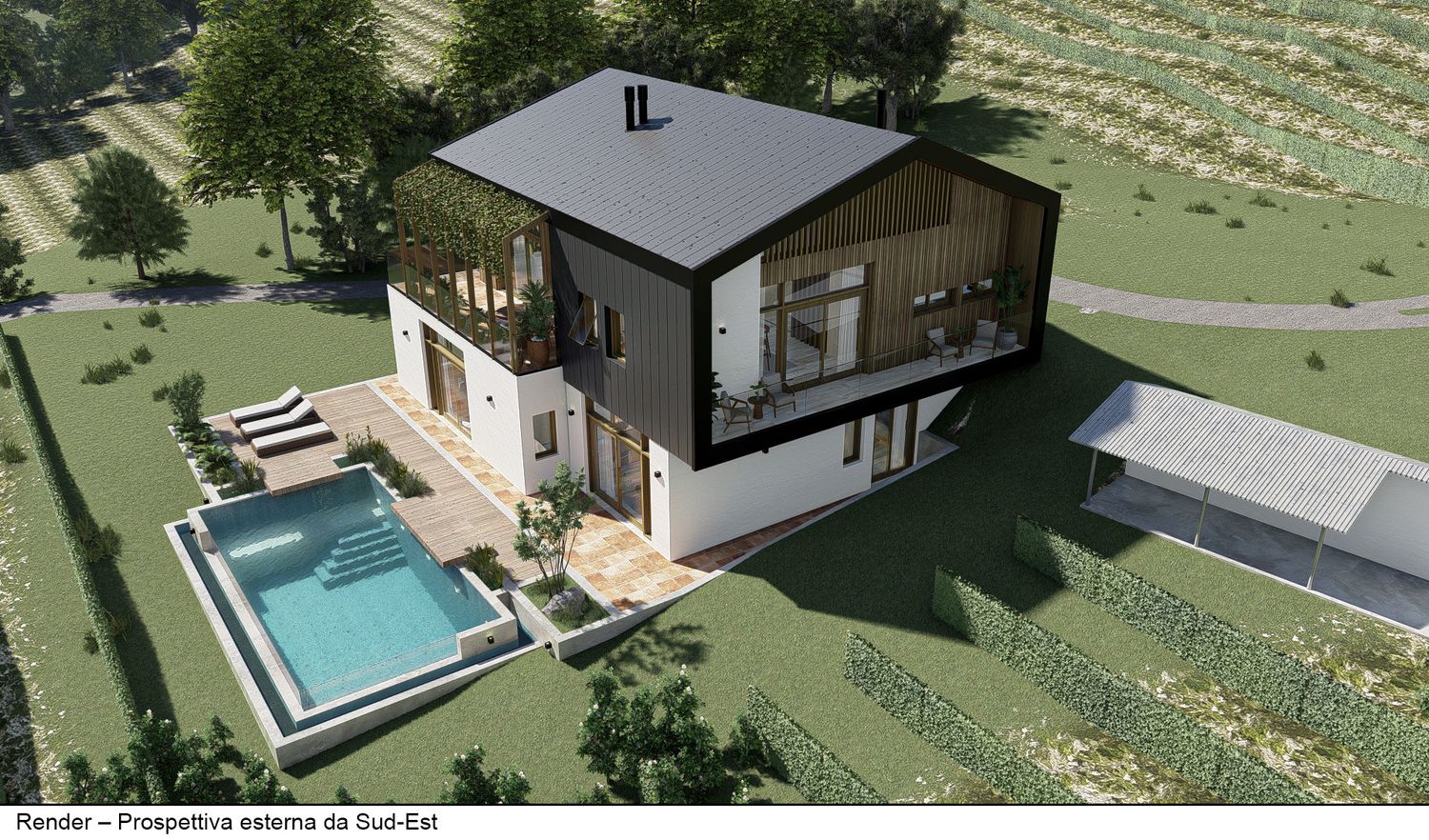 Per quanto riguarda i materiali, si conserva la base bianca e l’intonaco tradizionale a calce del volume originale, integrando un linguaggio moderno al livello superiore mediante lamiera nera tipo PREFALZ, legno naturale e listonati che modulano la percezione delle superfici vetrate. Nel caso strettamente necessario, a causa della normativa UNESCO, la lamiera può essere sostituita da legno carbonizzato e la copertura da tegole scure, mantenendo comunque l’estetica proposta. Il paesaggio rafforza l’integrazione con il contesto rurale: il pergolato è rivestito con rampicanti per creare tetti verdi continui, mentre la piscina incorpora zone d’acqua bassa con piante idonee, conferendo un carattere rustico-naturale e favorendo la depurazione dell’acqua.
