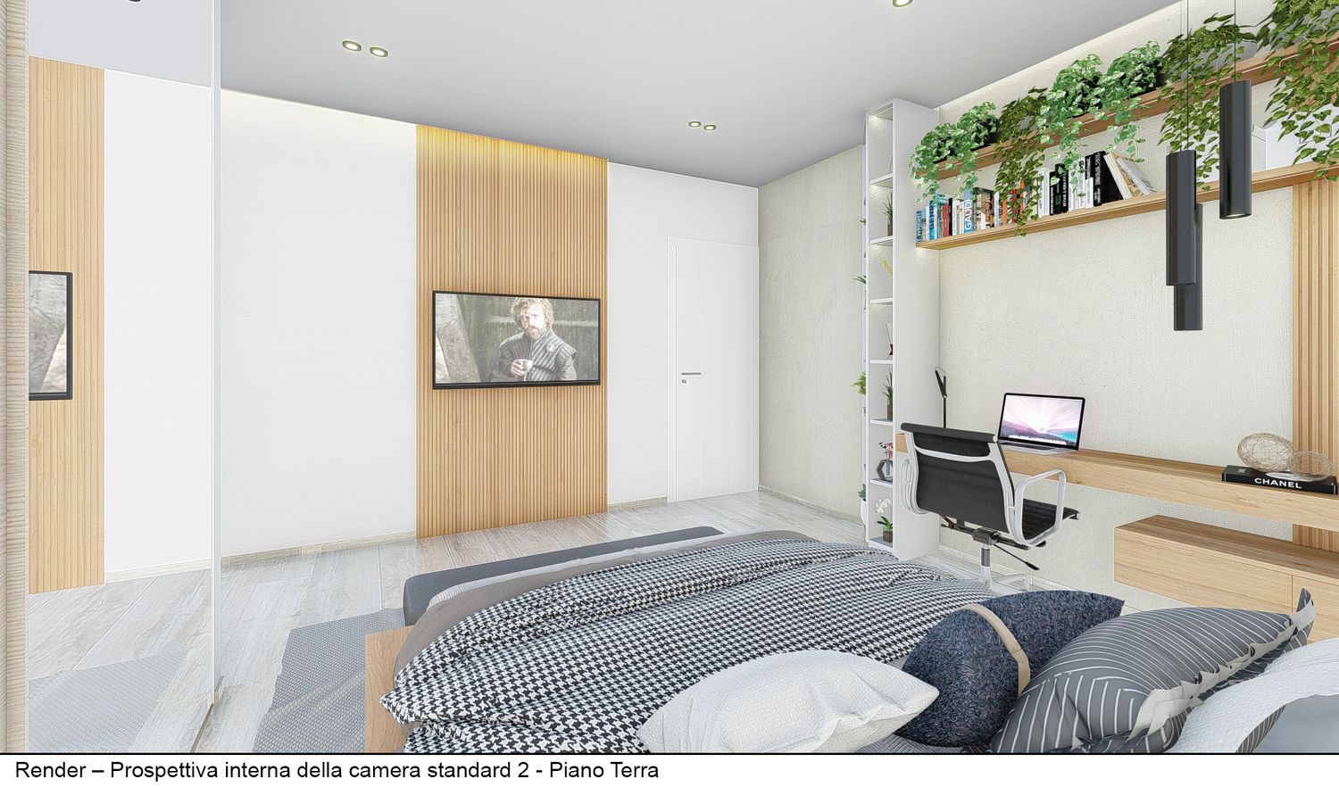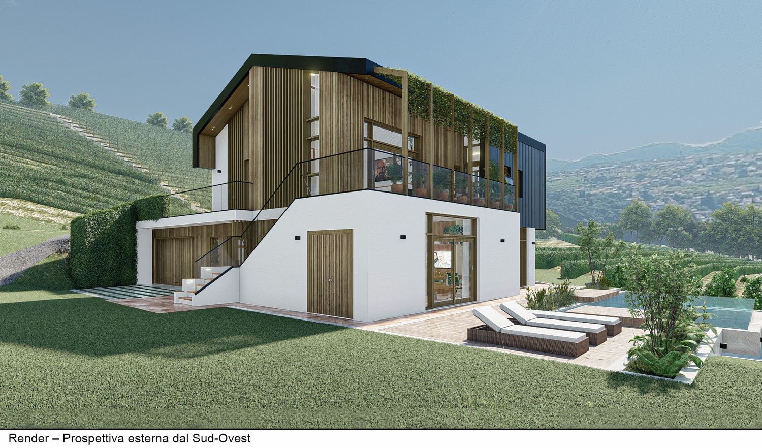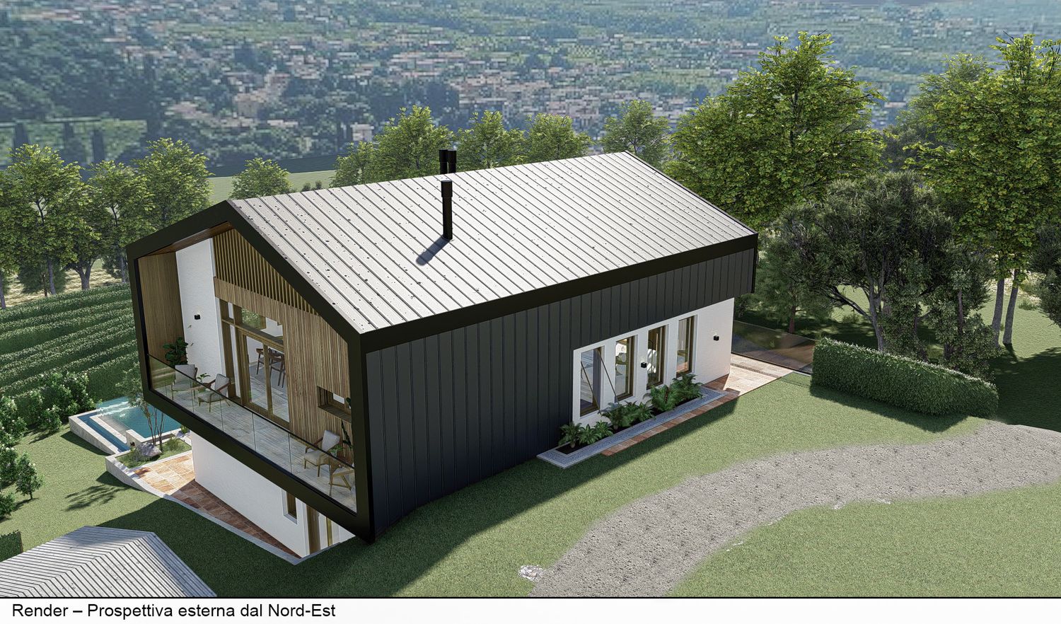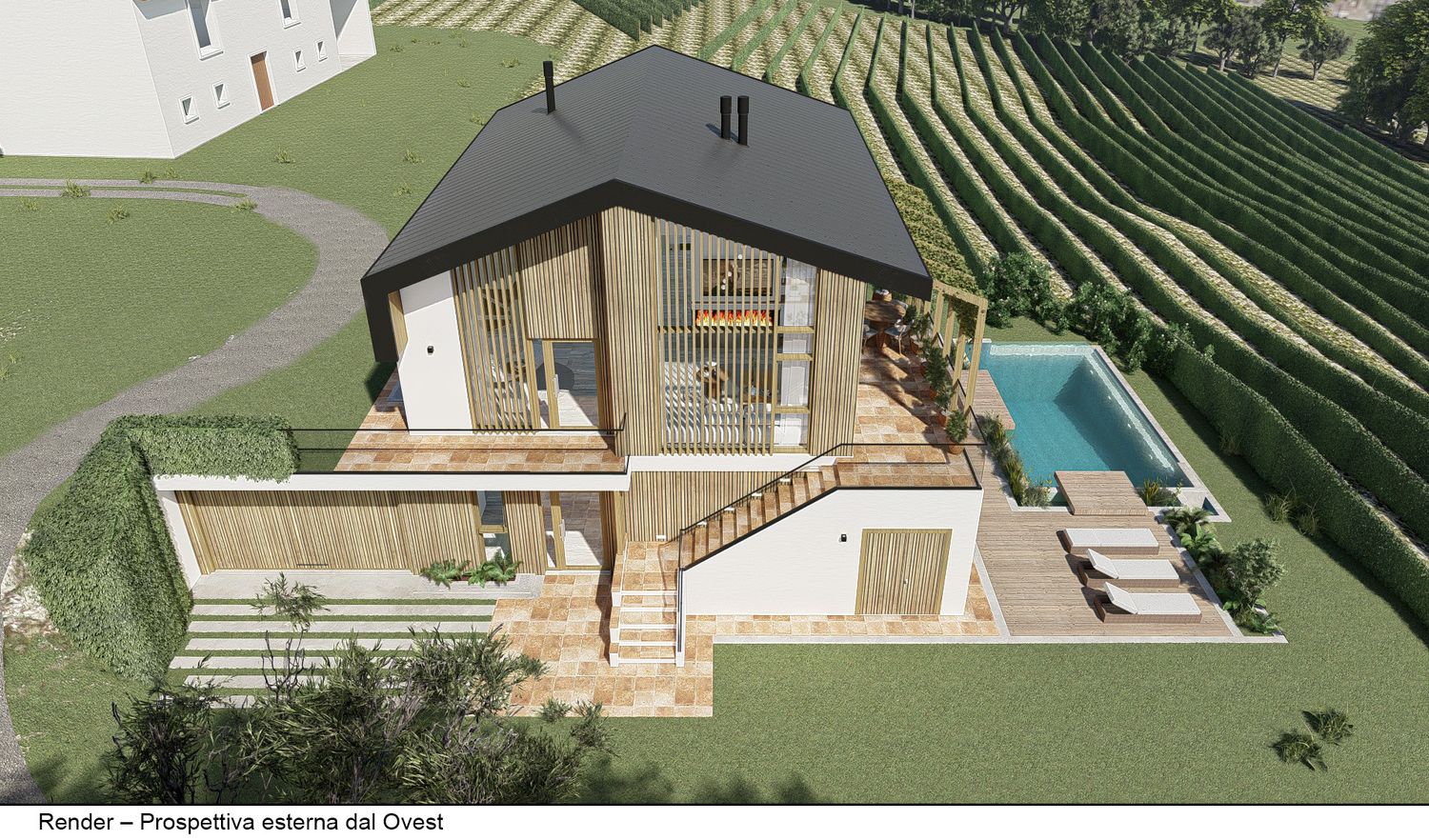 Per quanto riguarda i materiali, si conserva la base bianca e l’intonaco tradizionale a calce del volume originale, integrando un linguaggio moderno al livello superiore mediante lamiera nera tipo PREFALZ, legno naturale e listonati che modulano la percezione delle superfici vetrate. Nel caso strettamente necessario, a causa della normativa UNESCO, la lamiera può essere sostituita da legno carbonizzato e la copertura da tegole scure, mantenendo comunque l’estetica proposta. Il paesaggio rafforza l’integrazione con il contesto rurale: il pergolato è rivestito con rampicanti per creare tetti verdi continui, mentre la piscina incorpora zone d’acqua bassa con piante idonee, conferendo un carattere rustico-naturale e favorendo la depurazione dell’acqua.