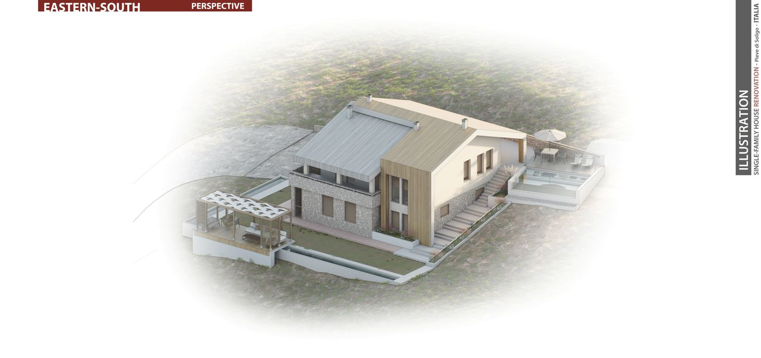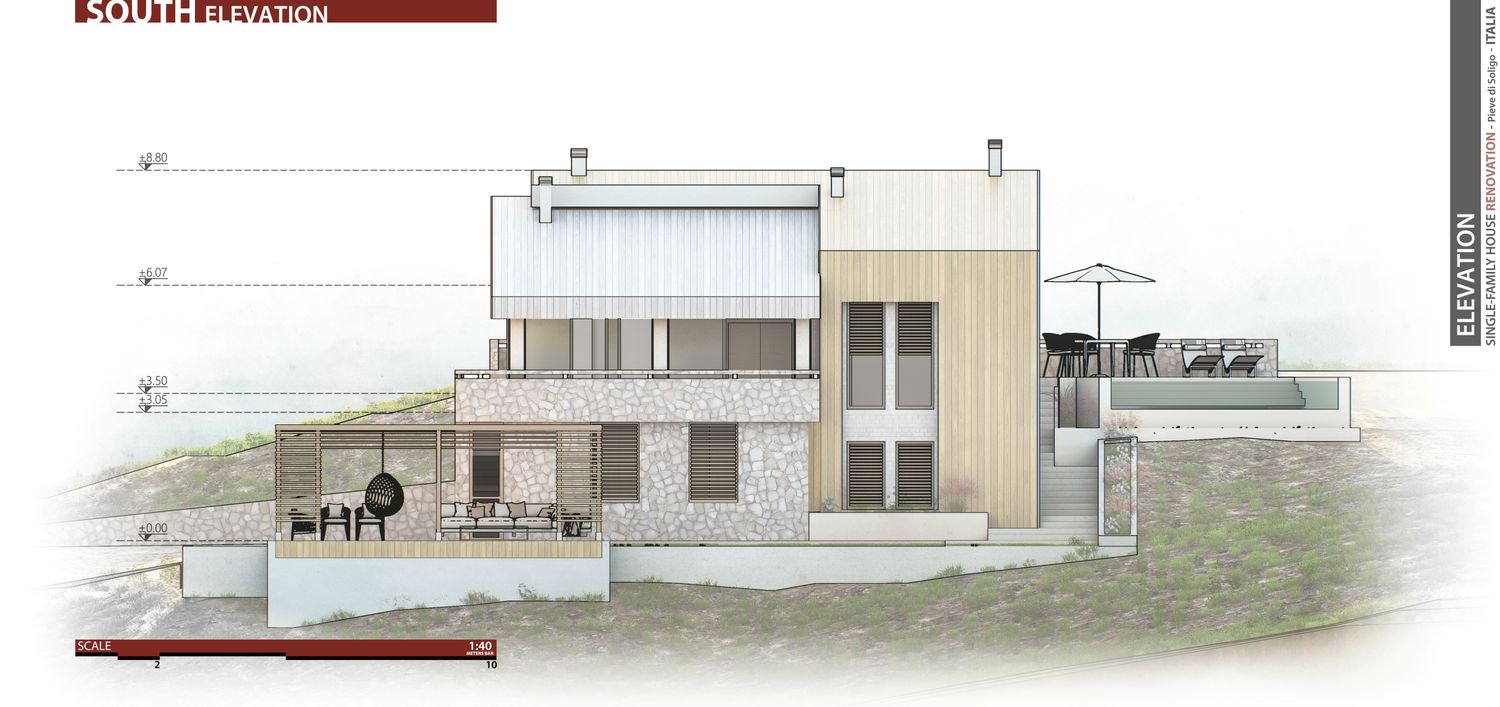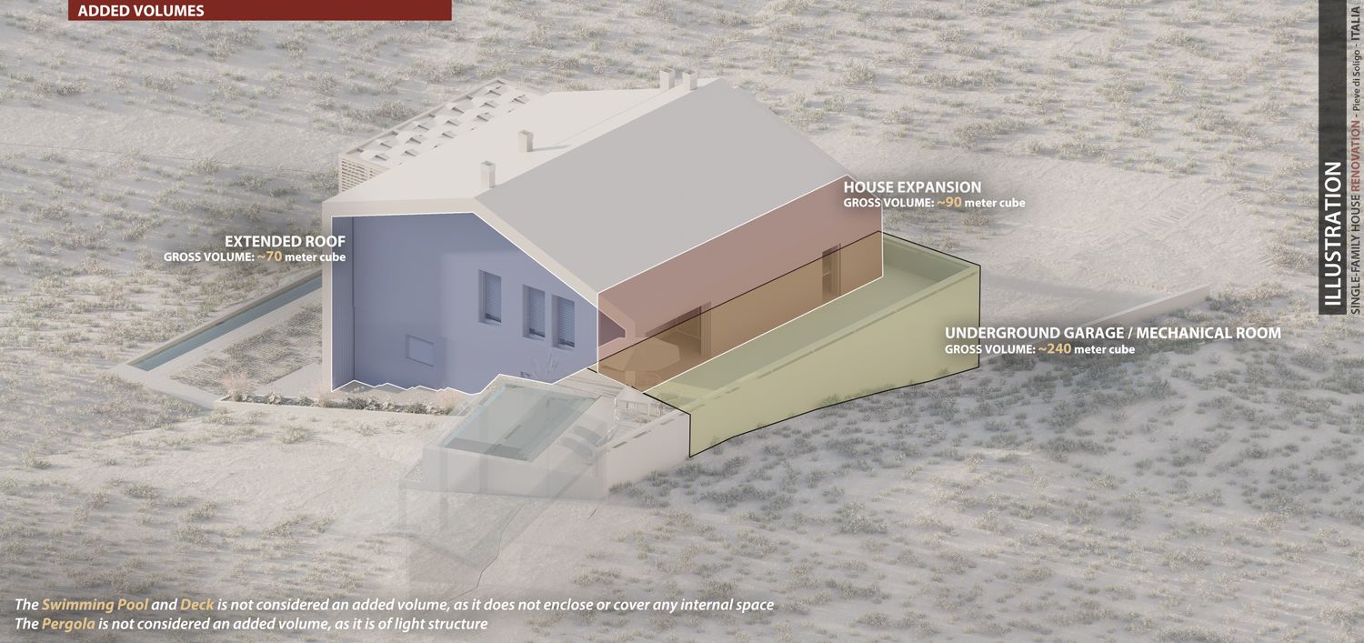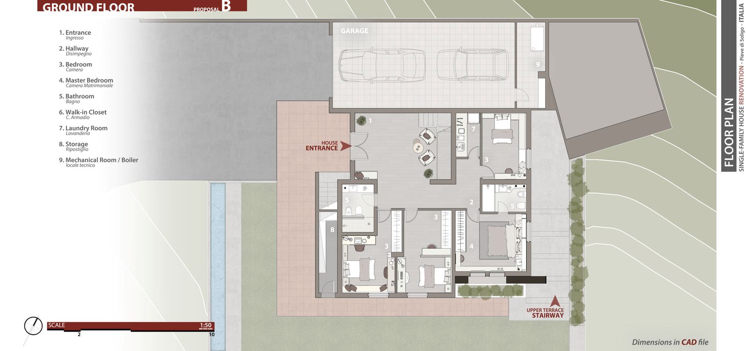 Regarding the interior layout, two ground-floor options are provided: one accommodating three bedrooms and another configurates four. The mechanical and boiler rooms are positioned within the garage area, giving room for the interior space to accommodate a small storage / service room serving the lower relaxation area. An additional volume is introduced on the upper floor, serving as a transitional zone between the house, the pool, and the upper terrace. This volume is designed also to accommodate a small study room.