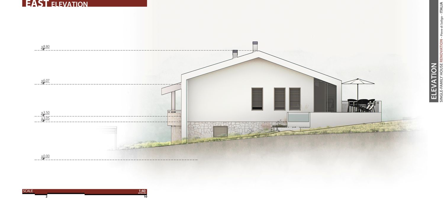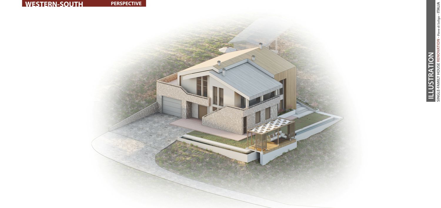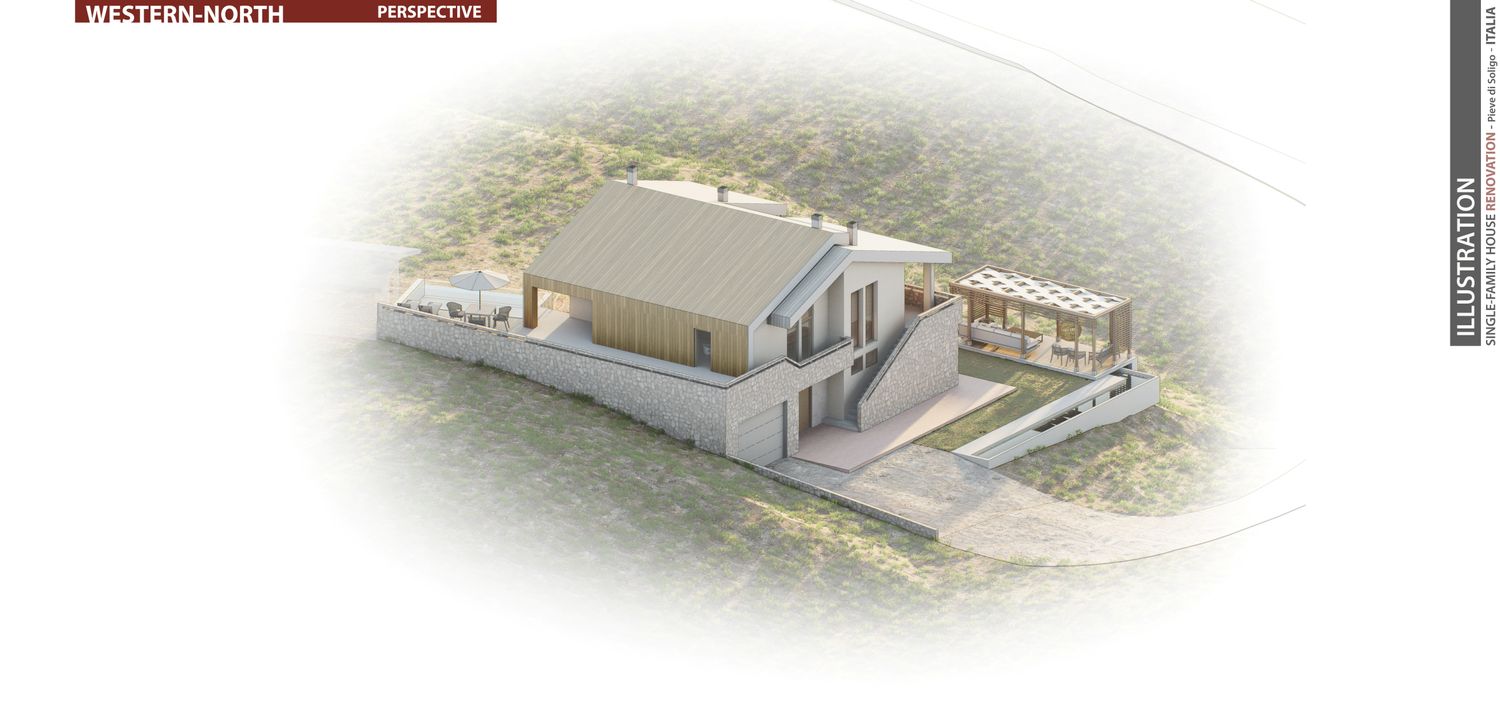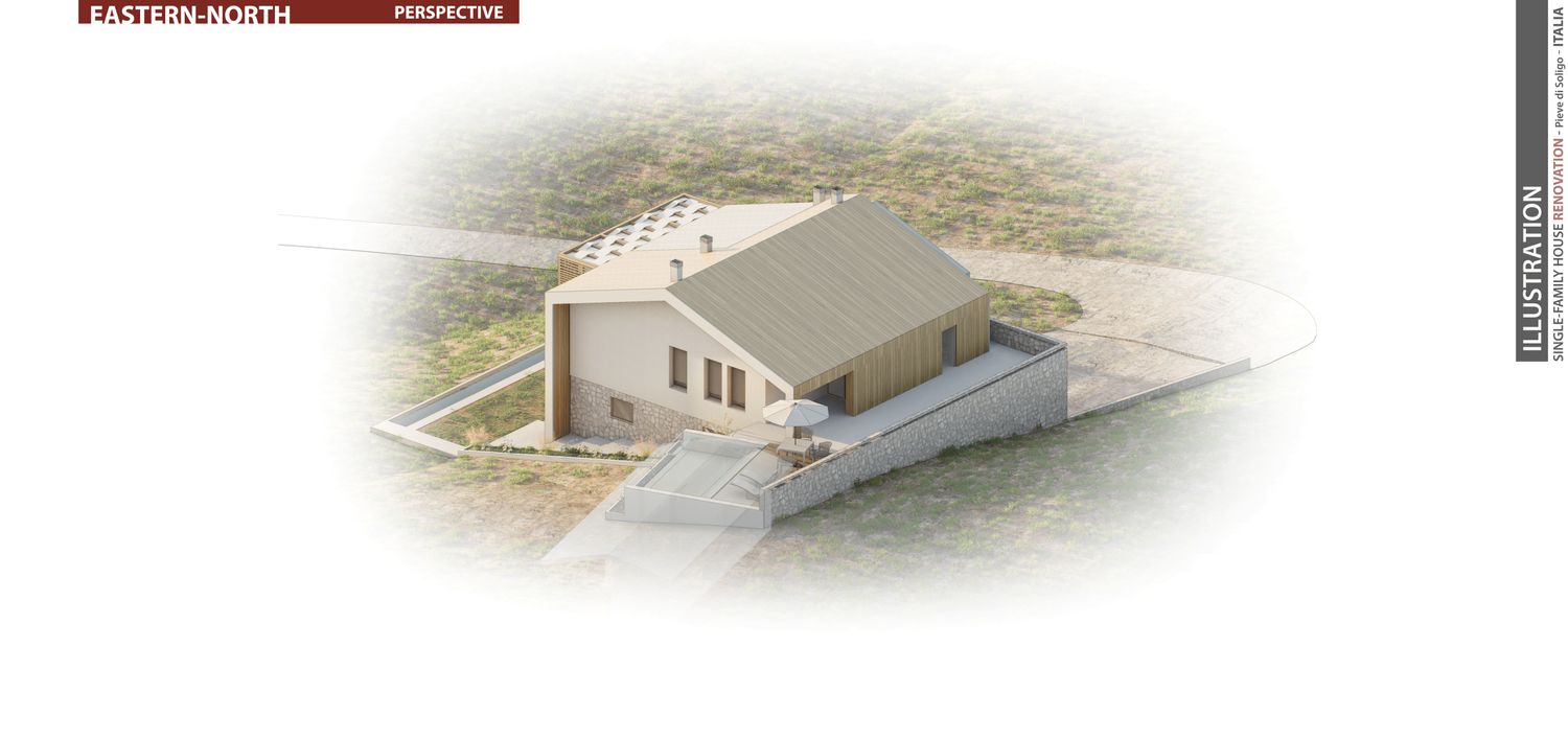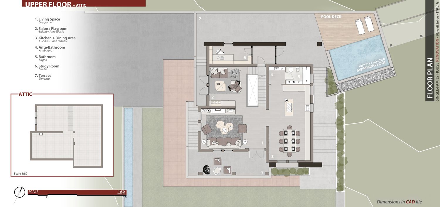 Regarding the interior layout, two ground-floor options are provided: one accommodating three bedrooms and another configurates four. The mechanical and boiler rooms are positioned within the garage area, giving room for the interior space to accommodate a small storage / service room serving the lower relaxation area. An additional volume is introduced on the upper floor, serving as a transitional zone between the house, the pool, and the upper terrace. This volume is designed also to accommodate a small study room.