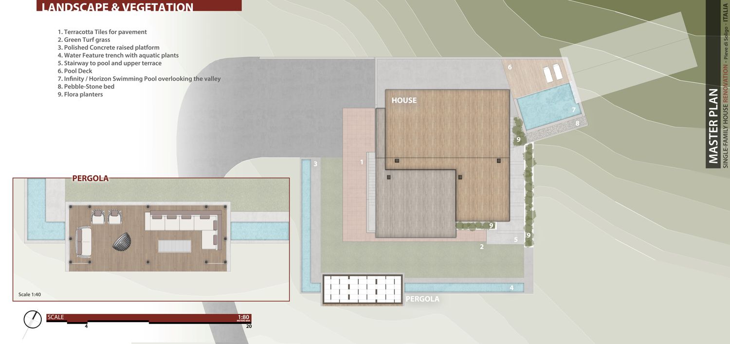 The landscape design follows a simple and refined concept. The lower relaxation area (Terrace) is set on a raised platform that is predominantly of green grass turf. It is lined with a linear water-feature trench intended to support aquatic planting. Above, another raised platform acts as a bridge and accommodates the seating pergola. The lower terrace connects to the upper terrace via a stepped stairway where the pool deck and swimming pool are located. The swimming pool is elevated on its own platform and designed as an infinity (horizon) pool, subtly inclined towards the east and overlooking the valley down, enhancing visual continuity with the landscape.
