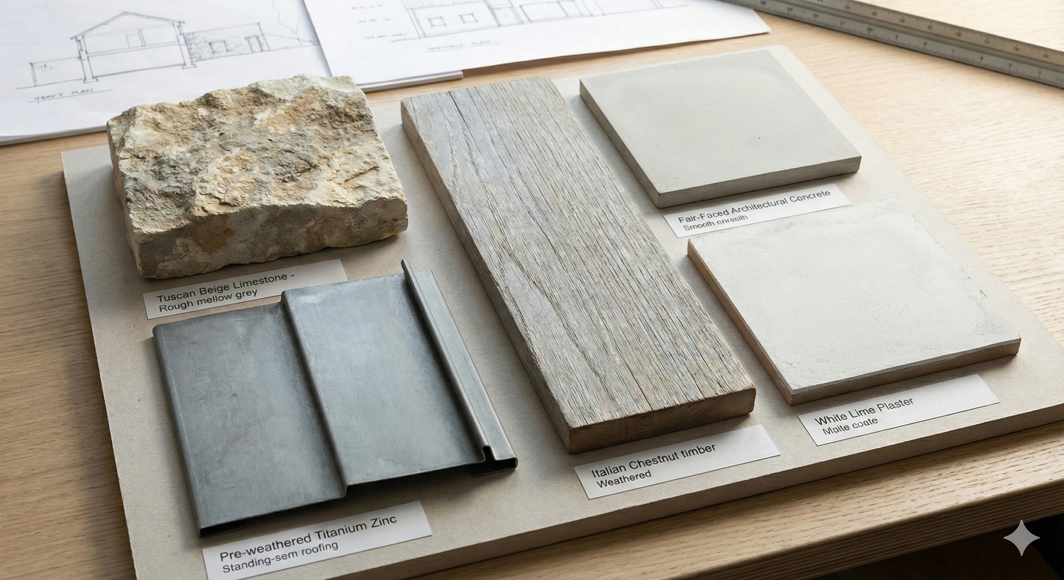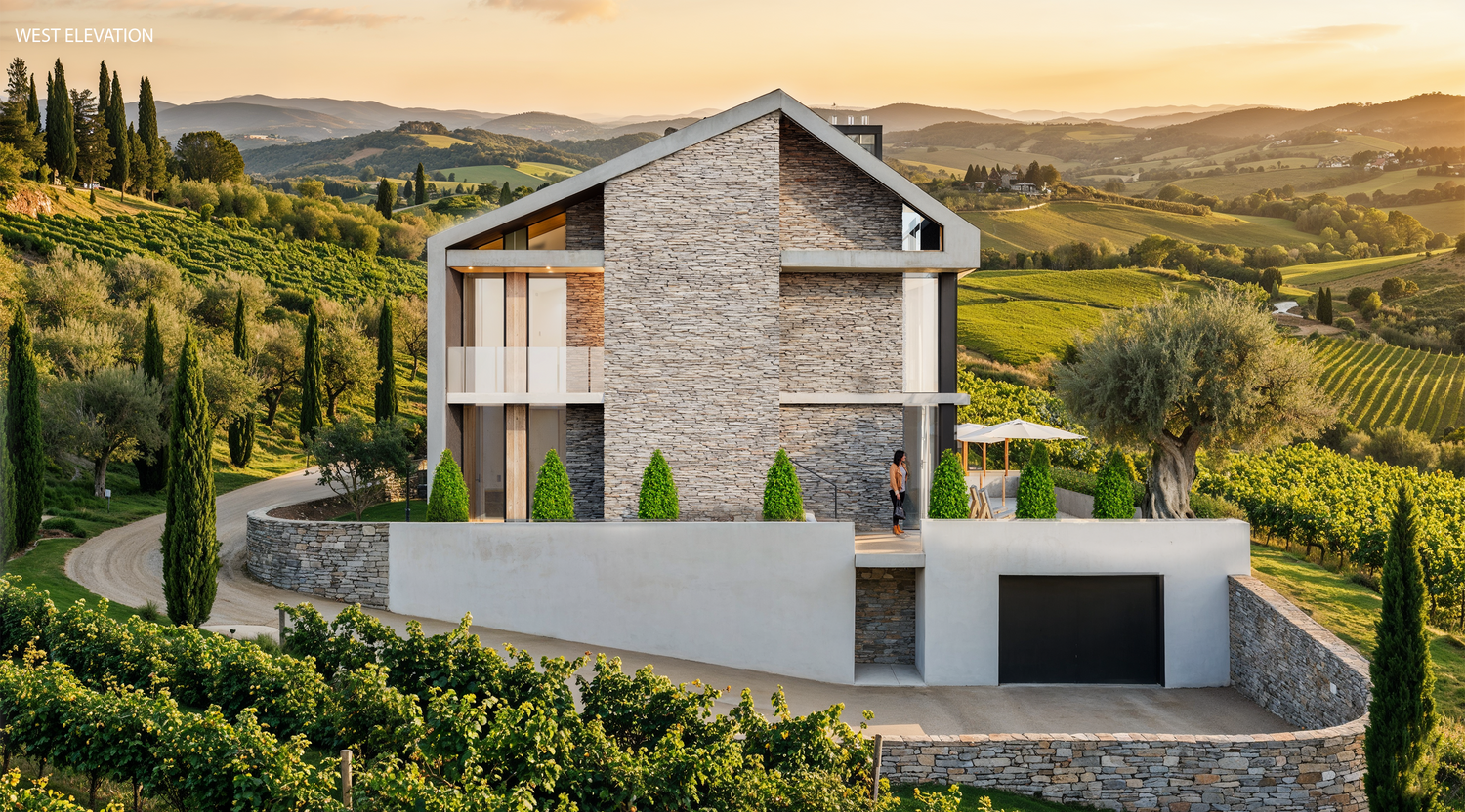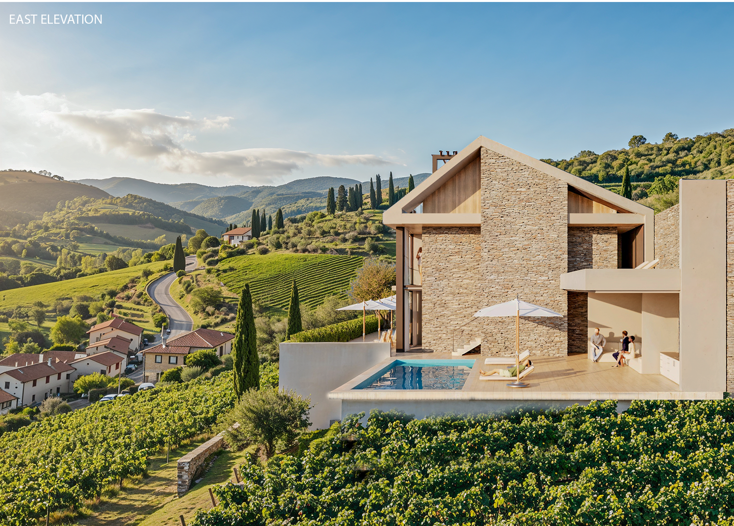 Material selections emphasise natural finishes sourced as closely as possible to the character of the Italian hills, reinforcing a refined yet grounded architectural identity.