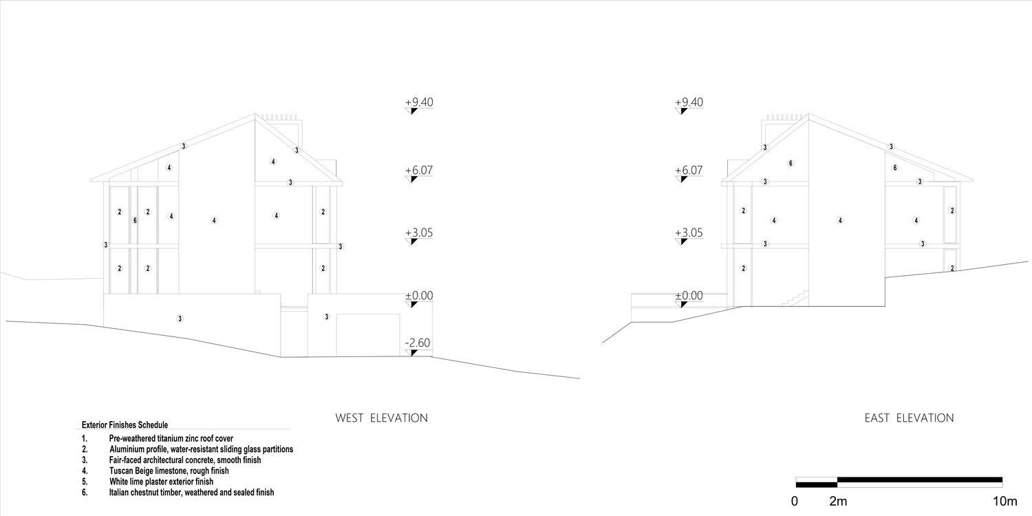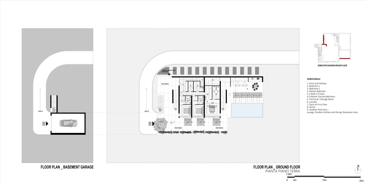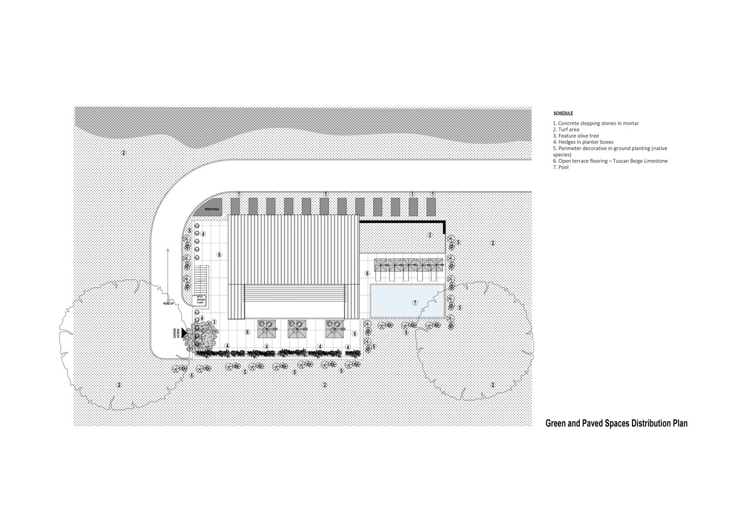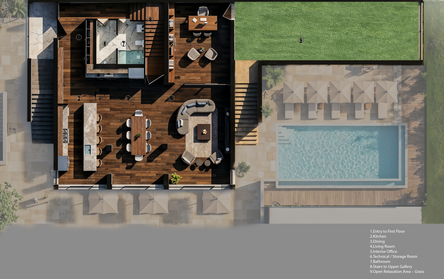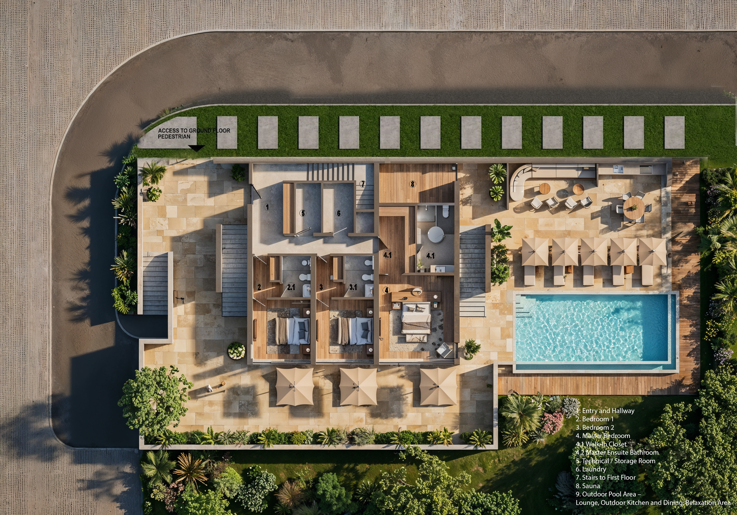 On the eastern side, the pool zone is positioned for both privacy and optimal sunlight, supported by the architectural arrangement of the house. A direct connection to a ground-floor sauna further enhances the private wellness sequence. The garage sits on the level below, linked by stairs to the open ground-floor terrace. Vertical circulation on both sides of the house ensures intuitive movement between floors and reinforces spatial clarity.