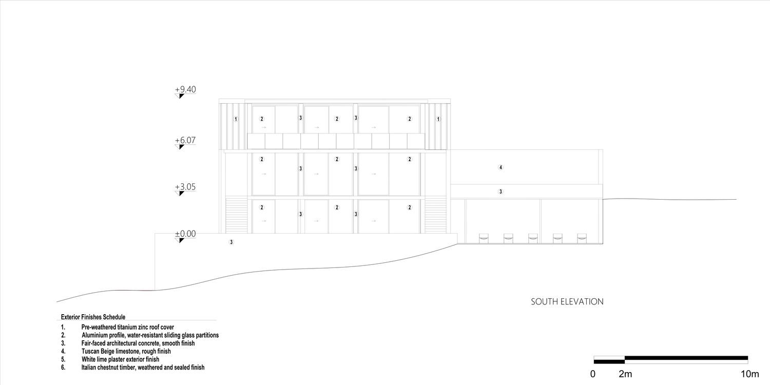 The ground floor accommodates three bedrooms with direct southern exposure, while the first floor is configured as a large, continuous living, dining, and kitchen domain oriented to the landscape. Above, a generous second-floor terrace is introduced, connecting to an interior library that frames long southern views.