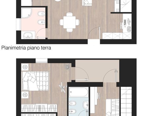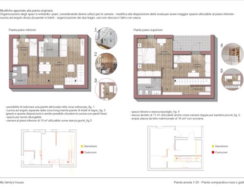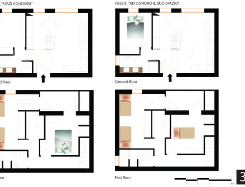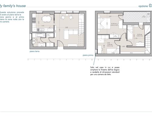 1- Ricavare 3 stanze + bagno al piano superiore o una matrimoniale (anche piccola) al piano inferiore; nel secondo caso utilizzerei la stanza ricavata come sala TV nel breve periodo, ma nel soggiorno dovrei avere gli spazi per posizionare tutto una volta trasformata in camera matrimoniale.