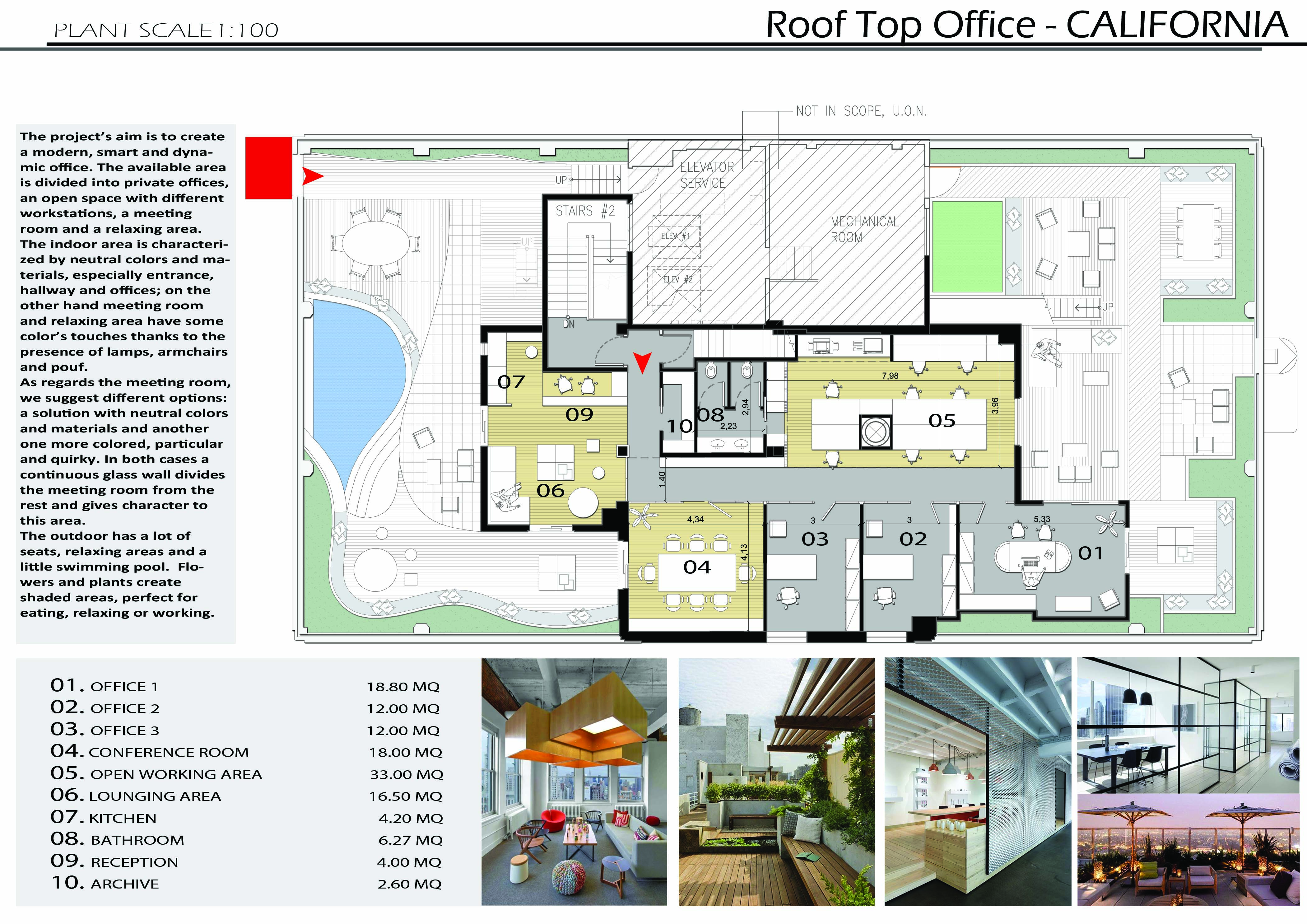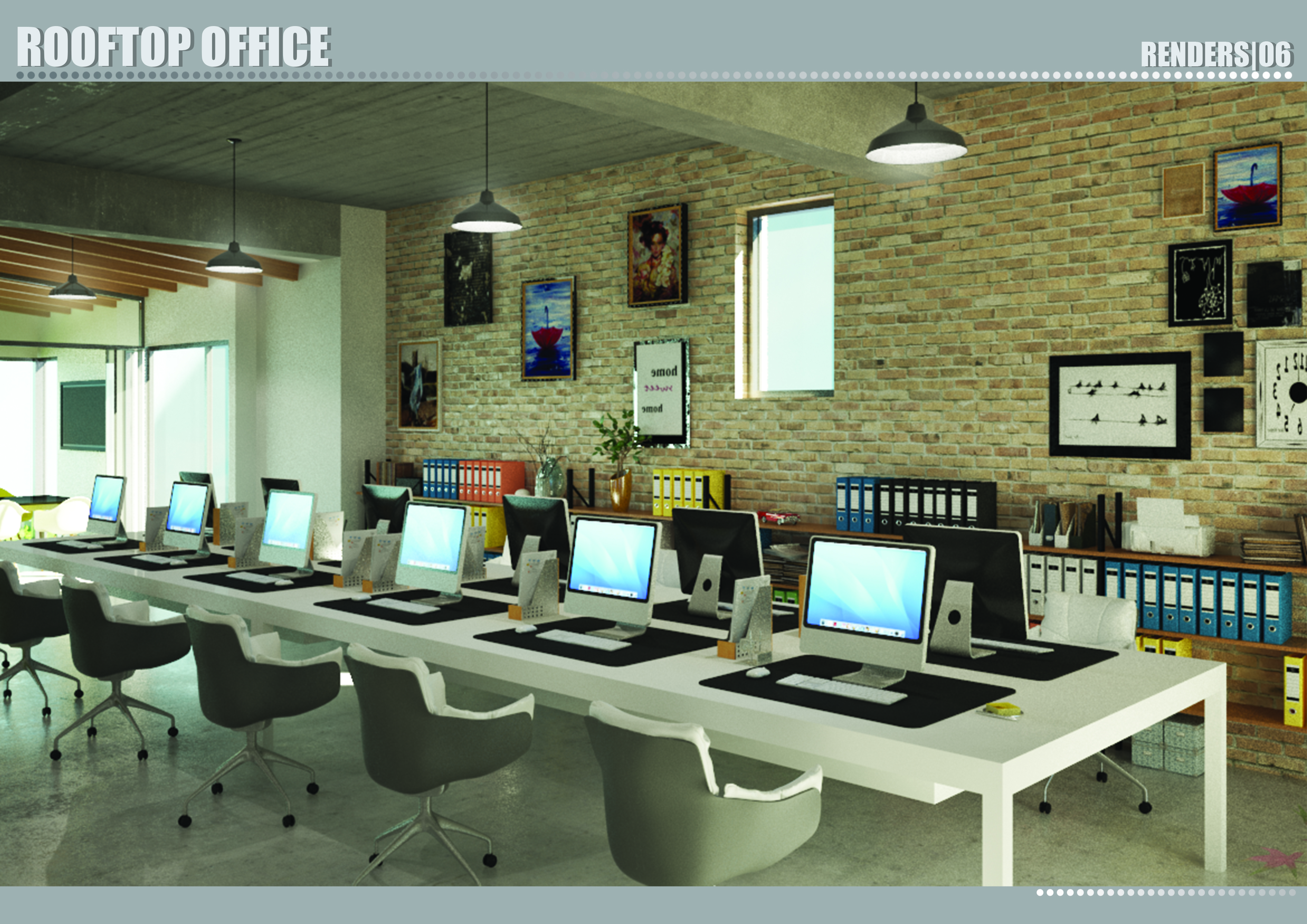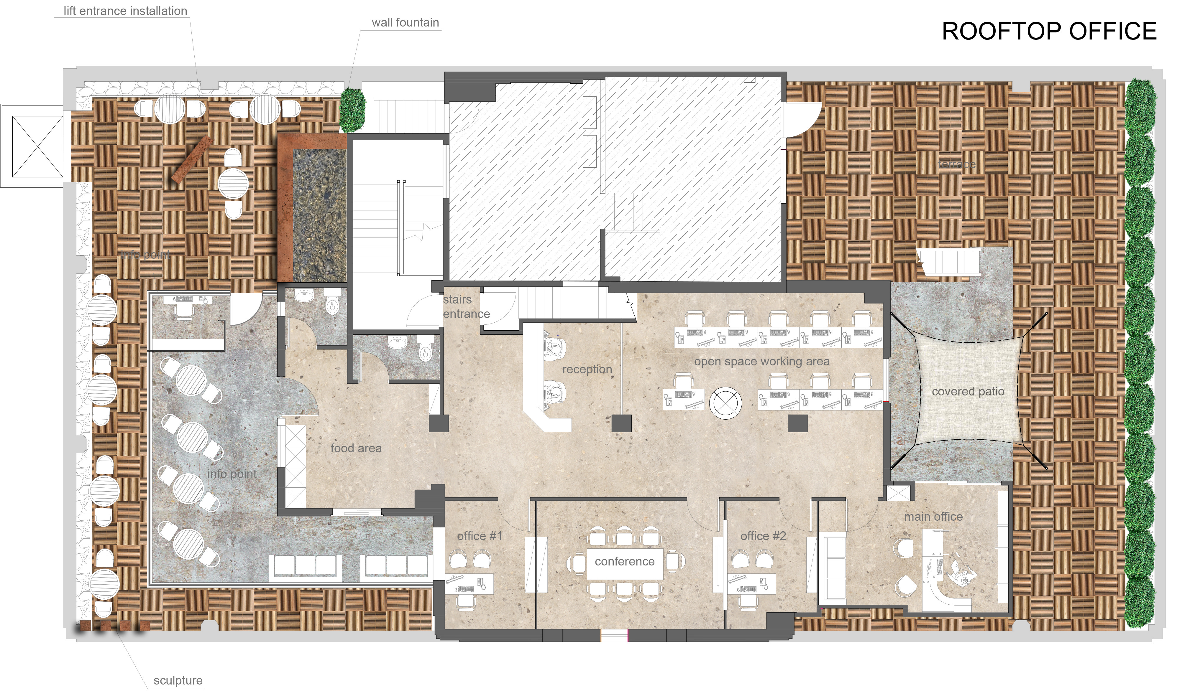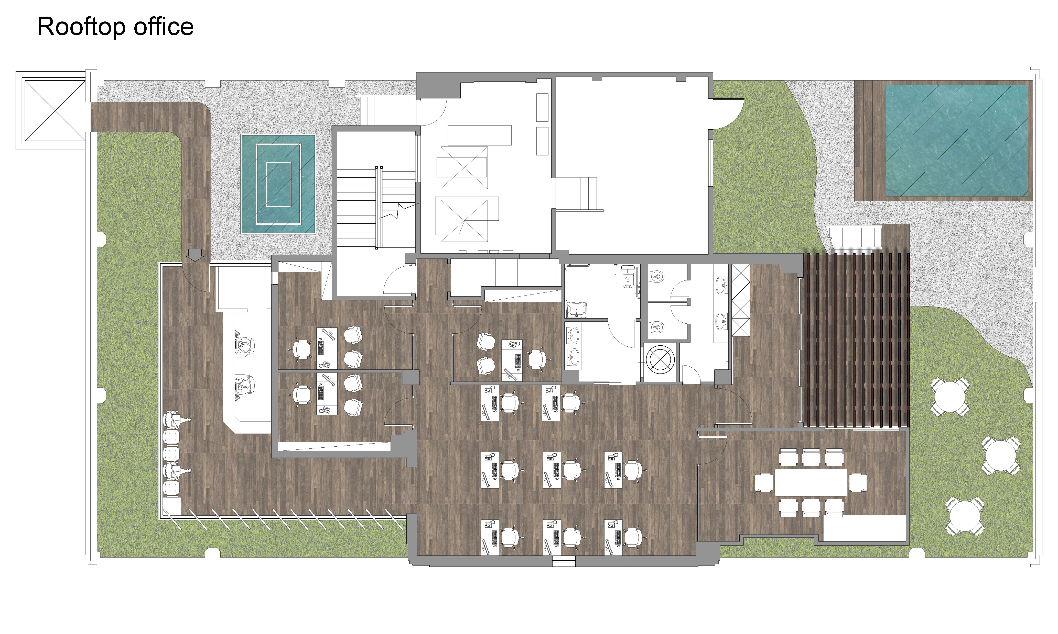 We'd like you to be creative with the outdoor rooftop area. We'd like it to be wooden deck flooring, and some tented/shaded areas, and plenty of room for seating and working outdoors. We are considering a fountain as well. All outdoor furniture should be weather-proof.