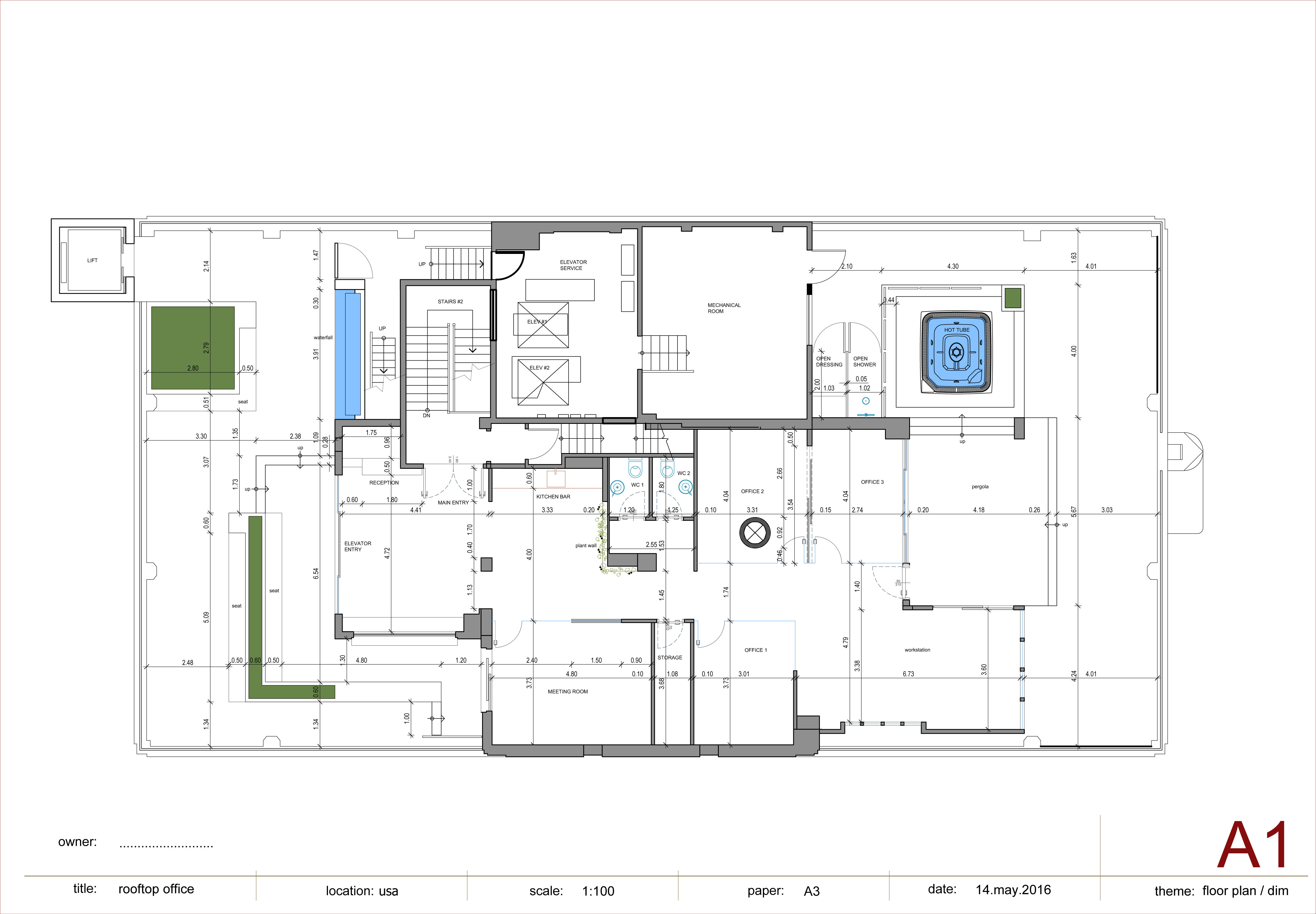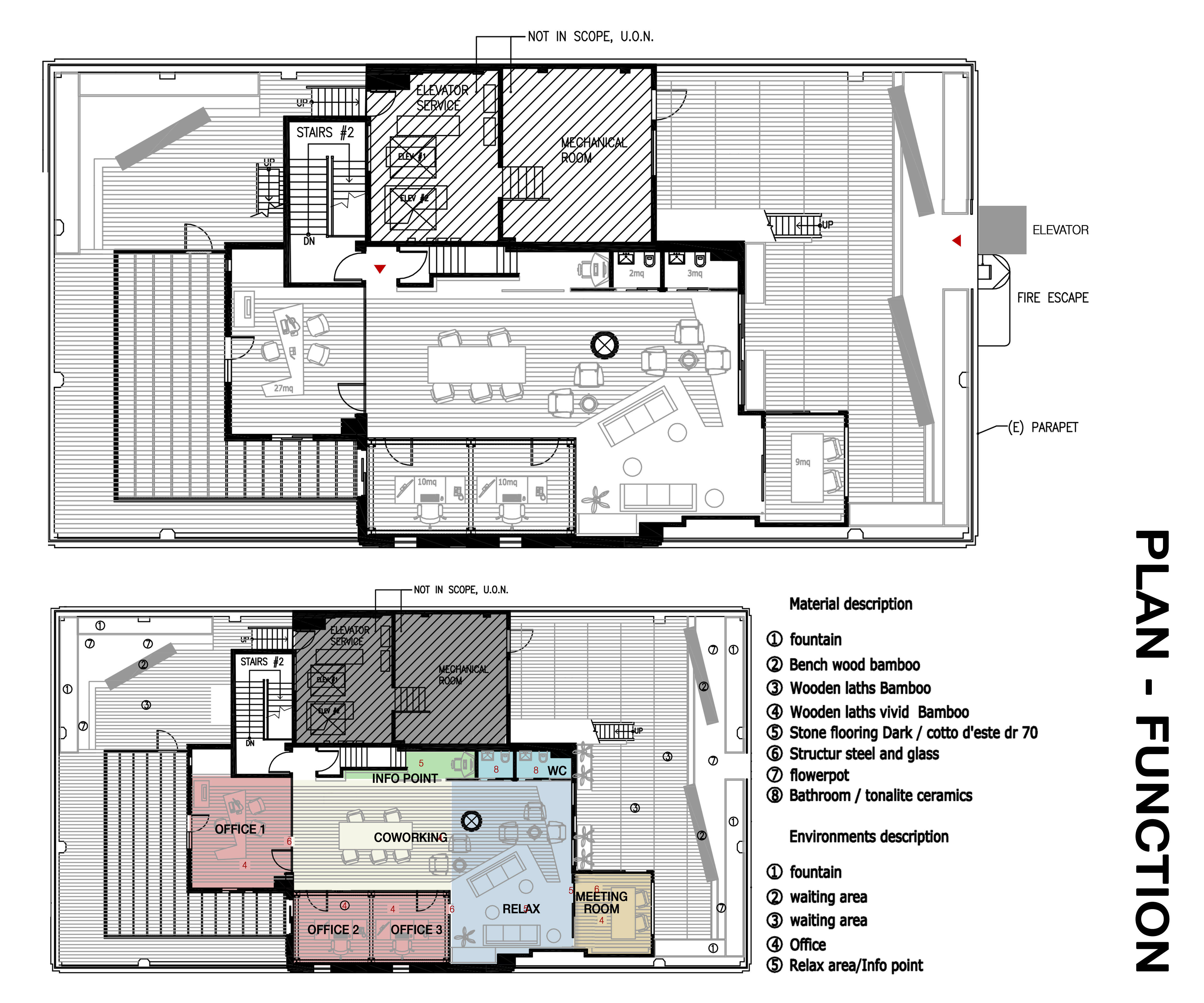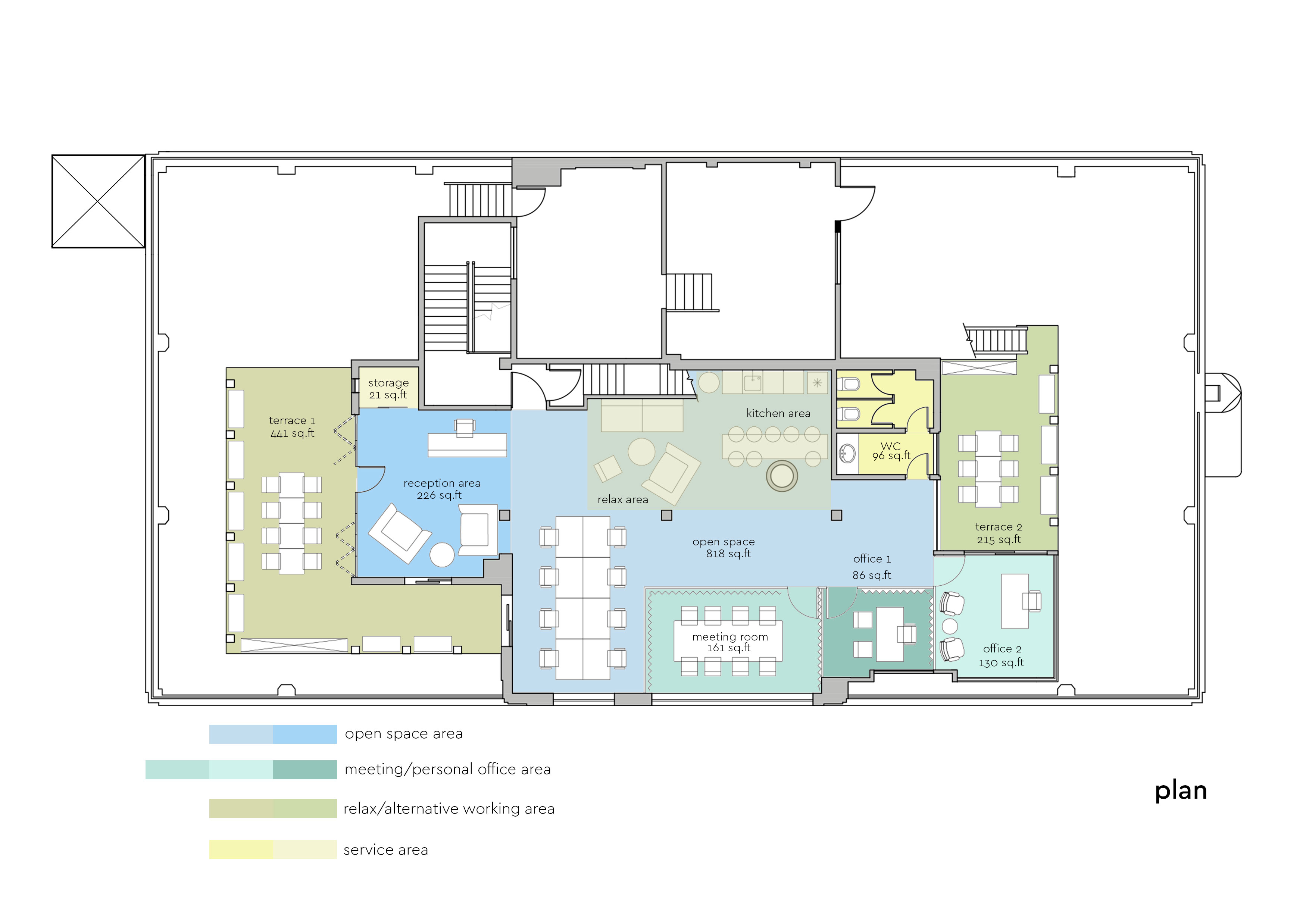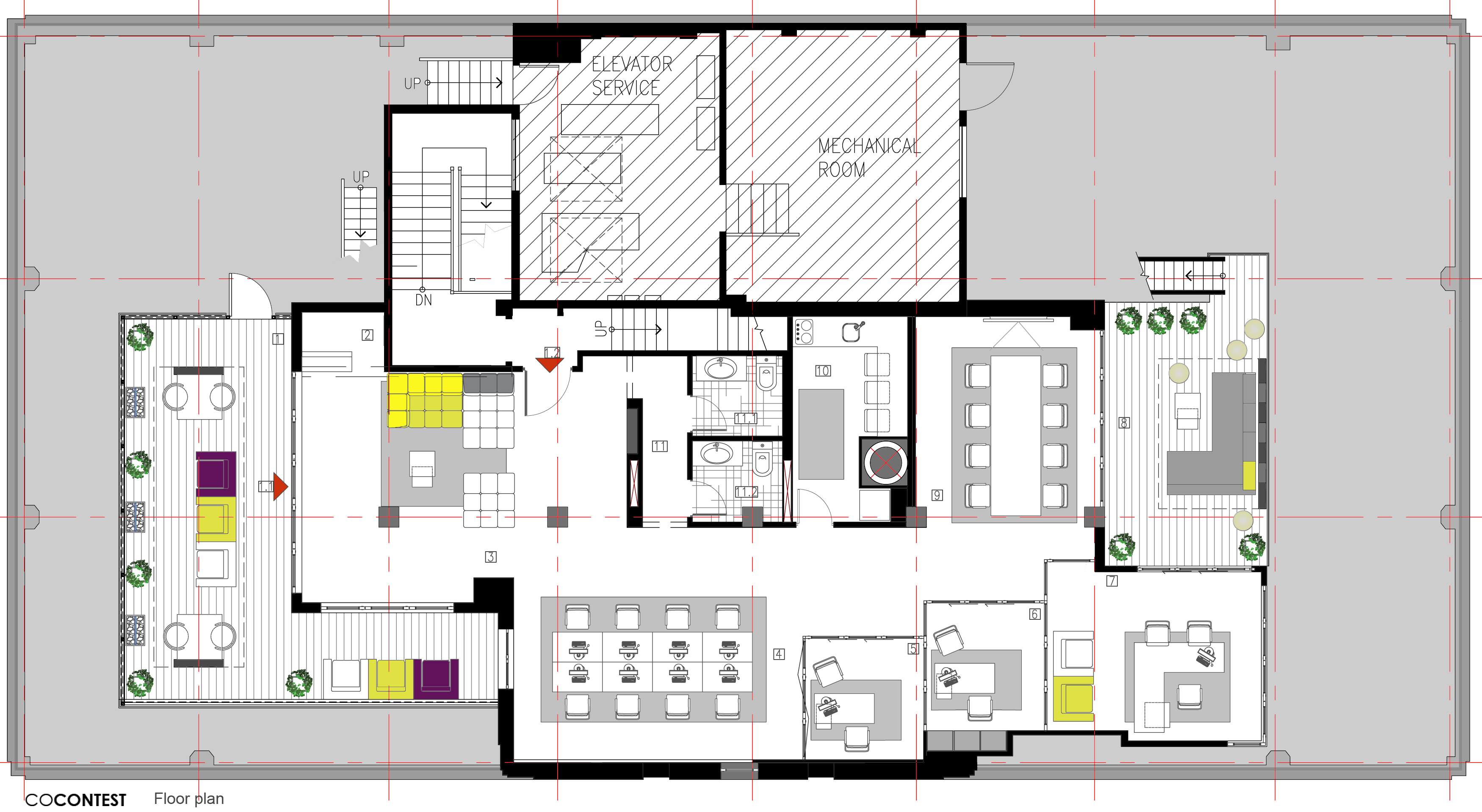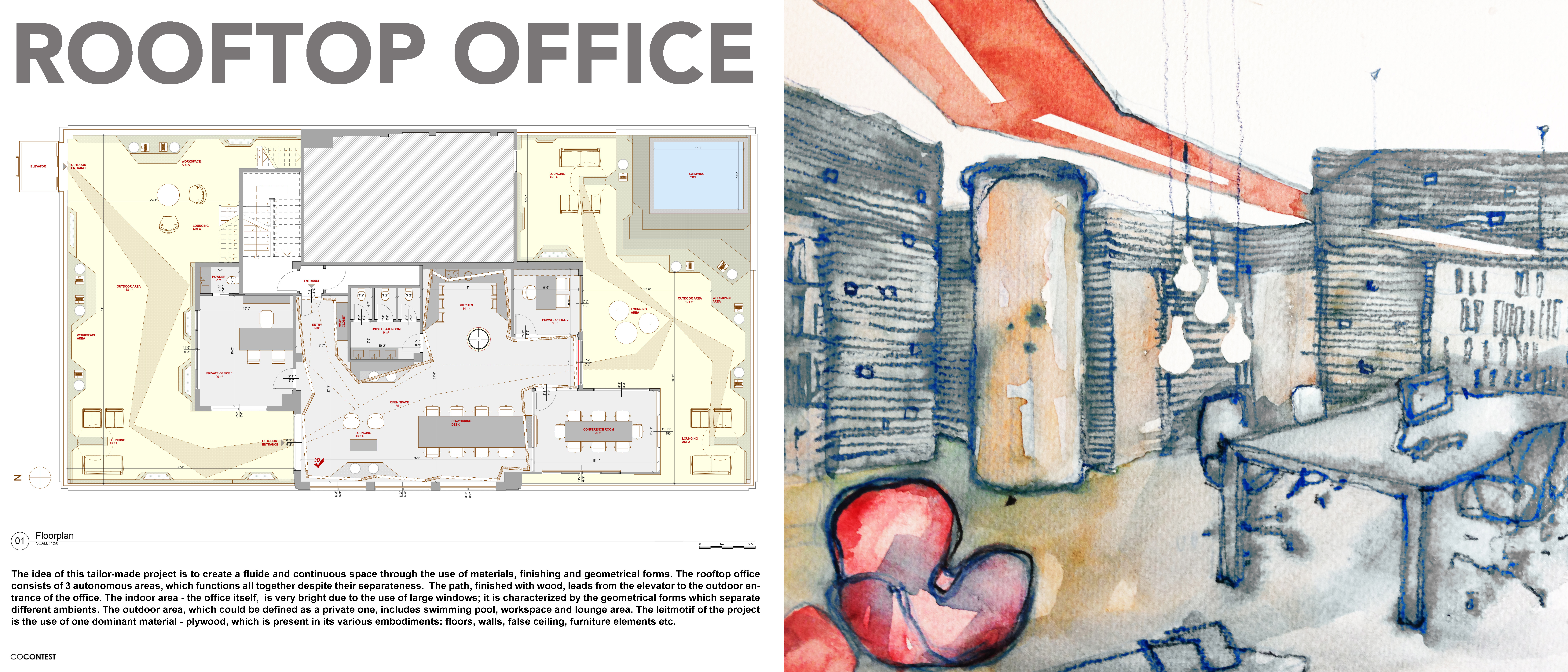 We'd like you to be creative with the outdoor rooftop area. We'd like it to be wooden deck flooring, and some tented/shaded areas, and plenty of room for seating and working outdoors. We are considering a fountain as well. All outdoor furniture should be weather-proof.