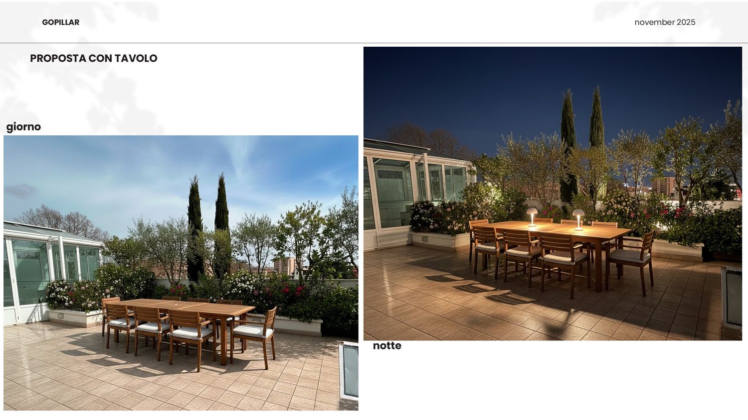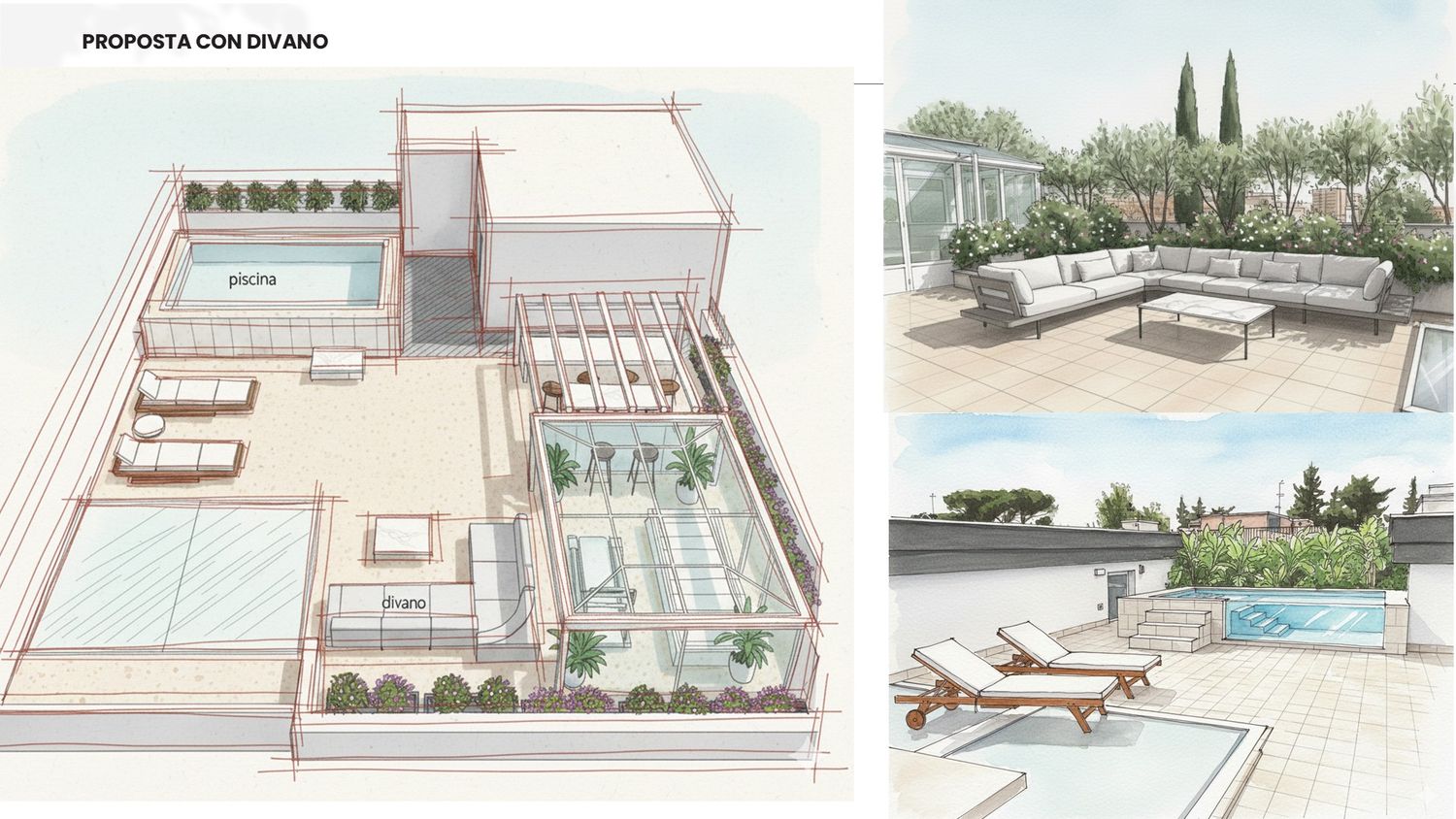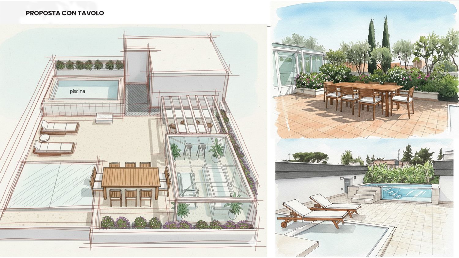 Sono lieta di presentarle il progetto di riqualificazione del suo terrazzo, trasformandolo in un'oasi urbana polifunzionale che massimizza l'uso dello spazio e il comfort in ogni stagione. L'intervento è stato studiato per creare diverse zone dedicate al relax, all'attività fisica e alla socialità, mantenendo un'estetica moderna e pulita, in armonia con l'ambiente circostante.