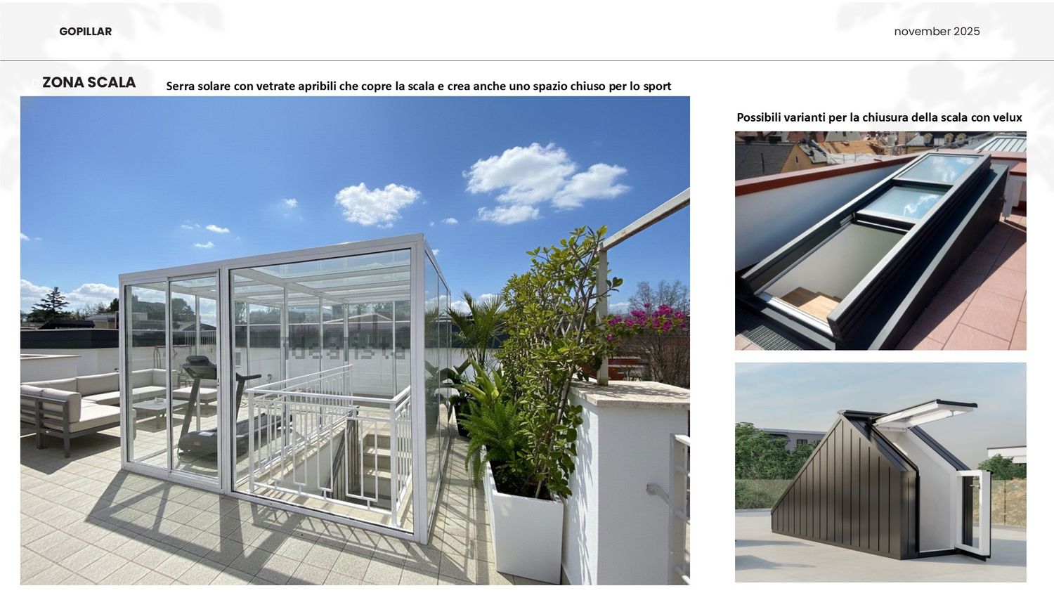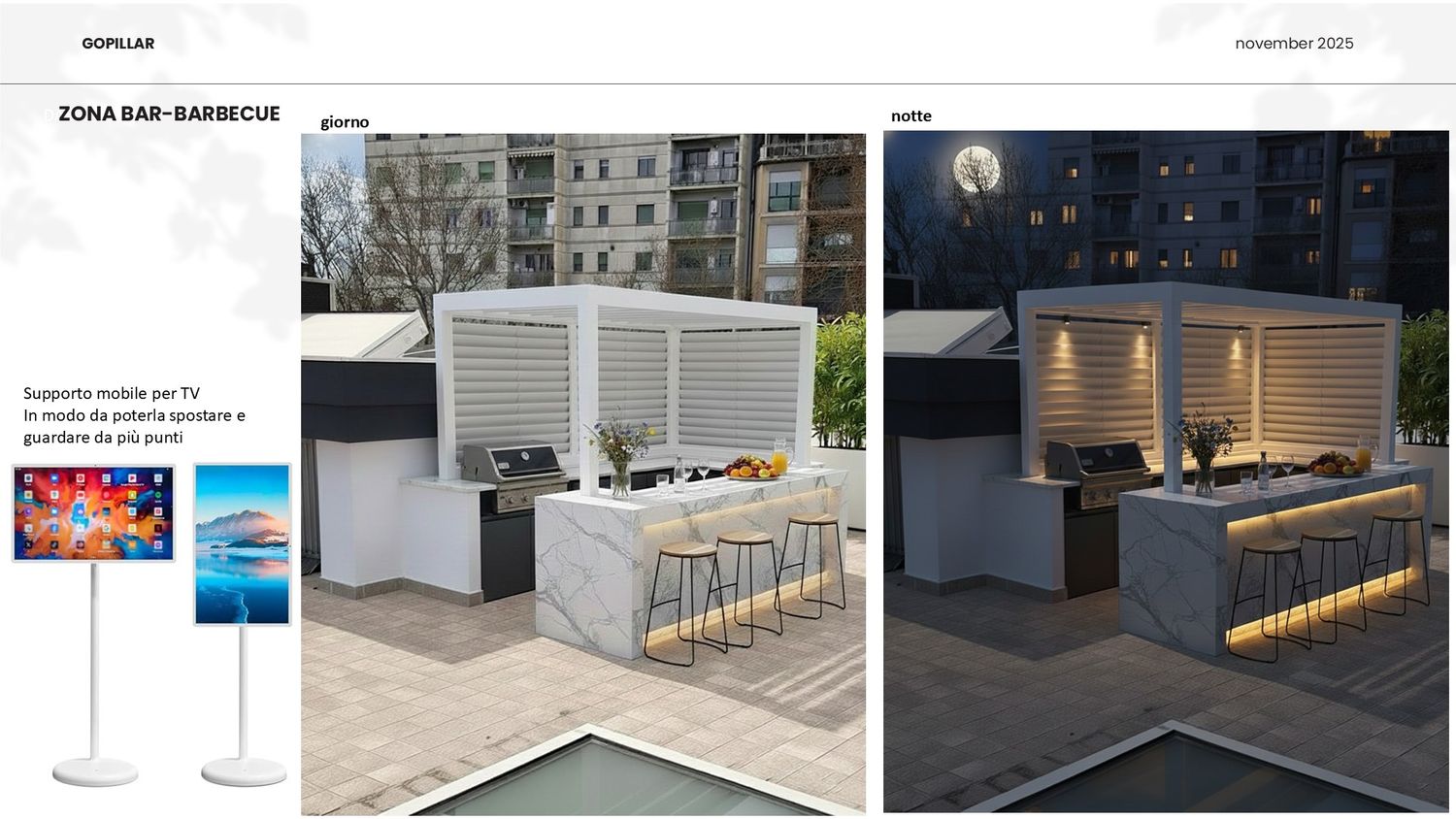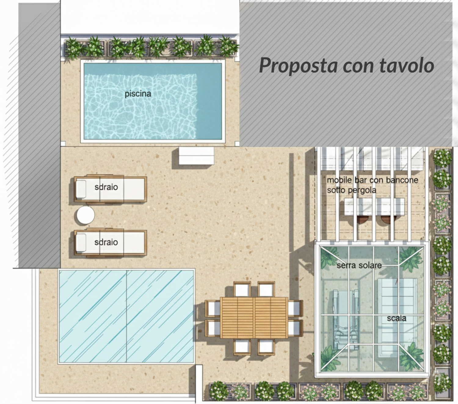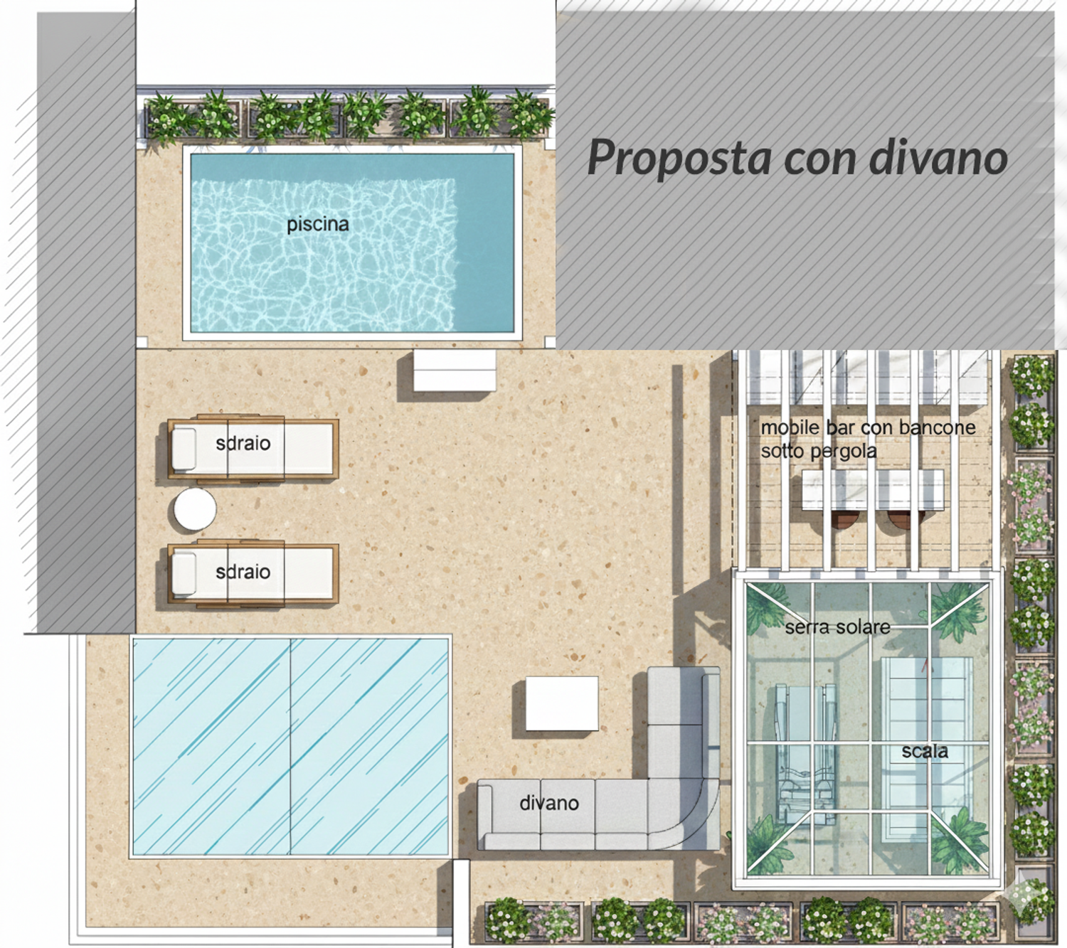 Sono lieta di presentarle il progetto di riqualificazione del suo terrazzo, trasformandolo in un'oasi urbana polifunzionale che massimizza l'uso dello spazio e il comfort in ogni stagione. L'intervento è stato studiato per creare diverse zone dedicate al relax, all'attività fisica e alla socialità, mantenendo un'estetica moderna e pulita, in armonia con l'ambiente circostante.