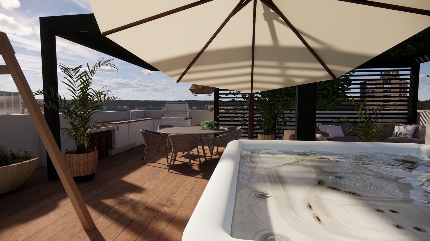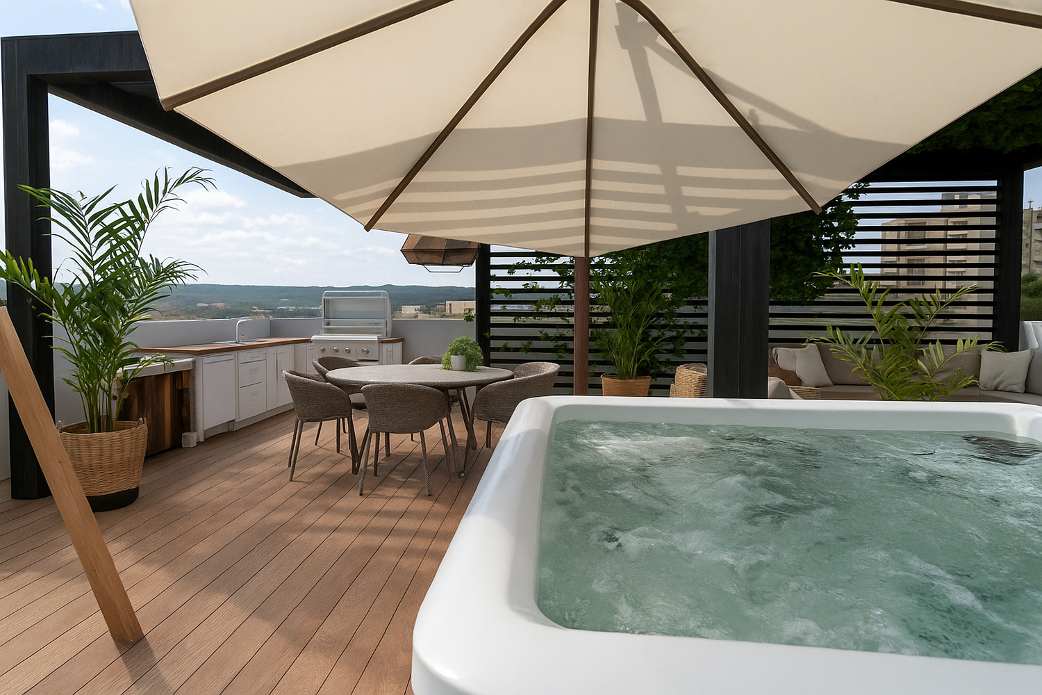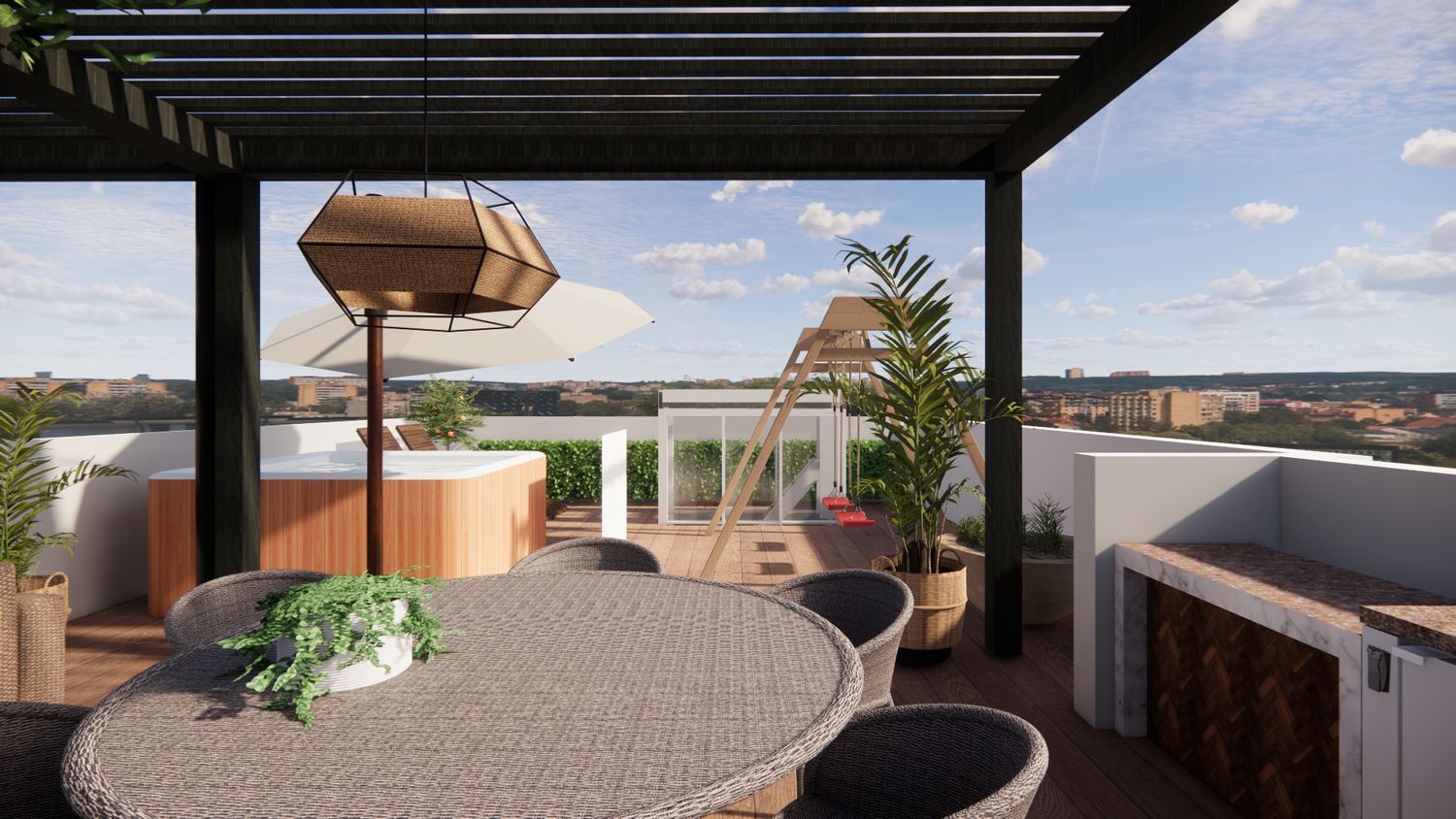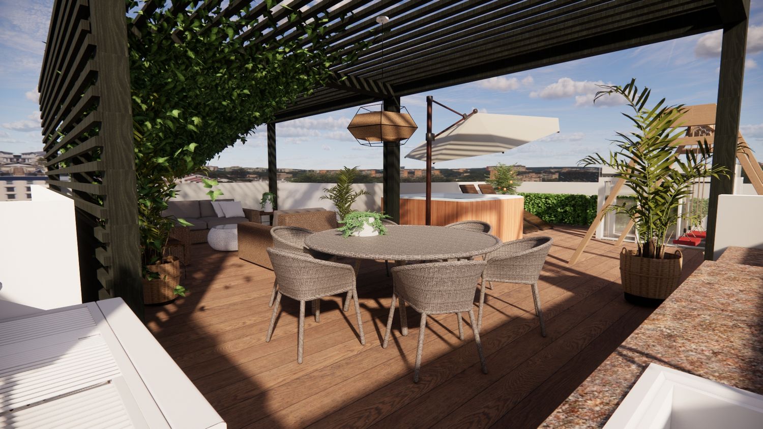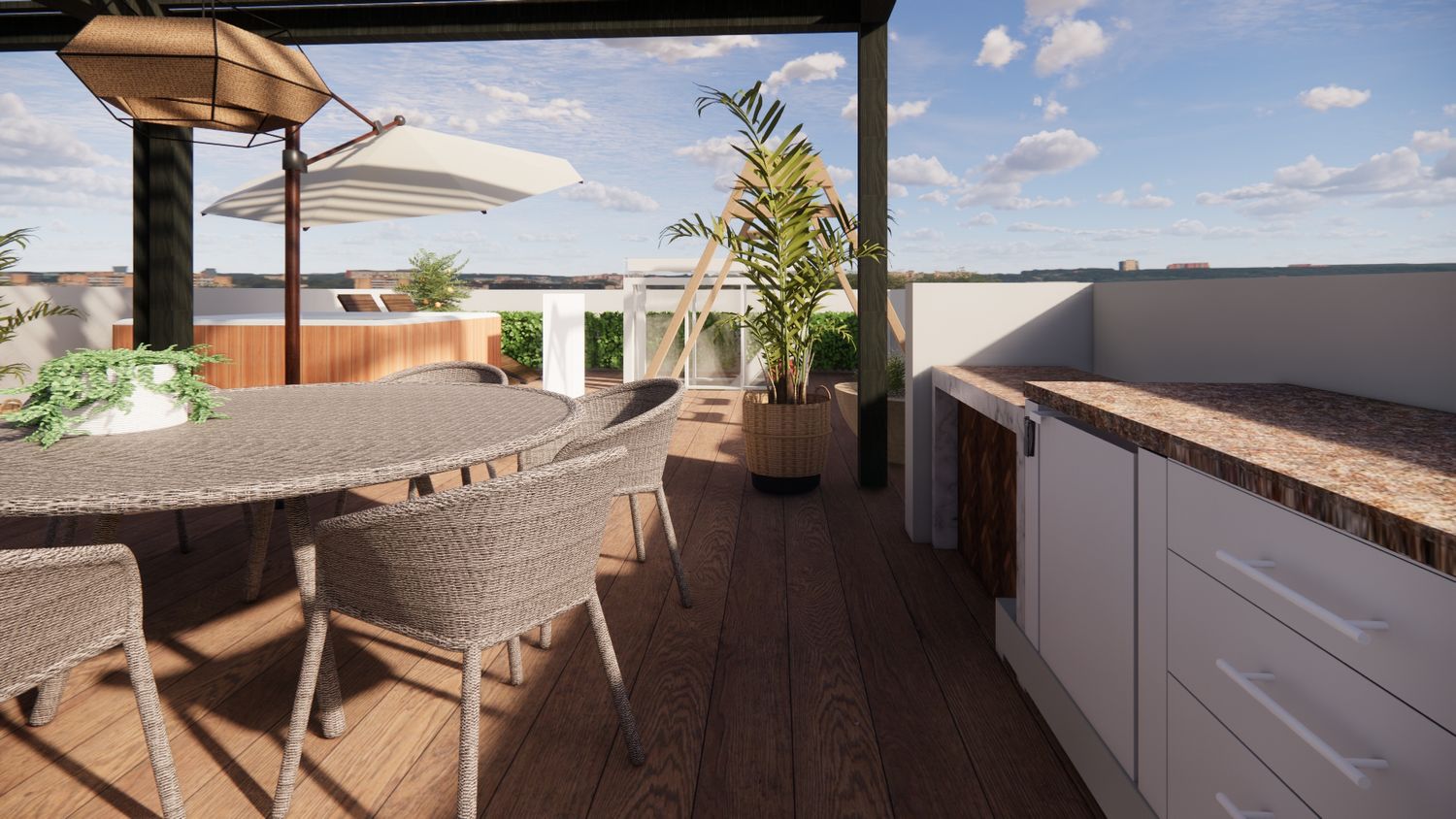 The main terrace has been designed with a jacuzzi, hanging swing, lounge seating, barbecue unit and service cabinetry, preserving spatial continuity with the urban view.