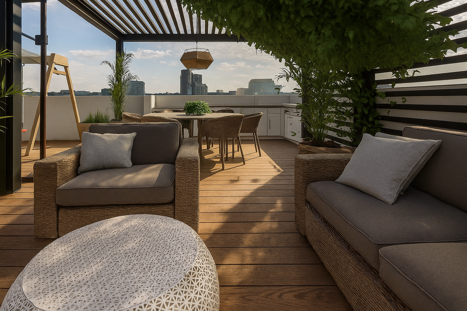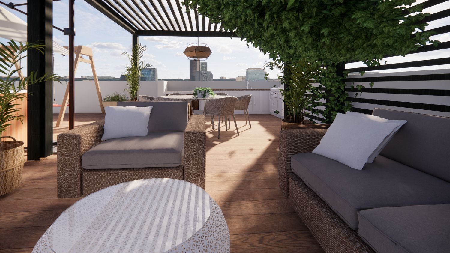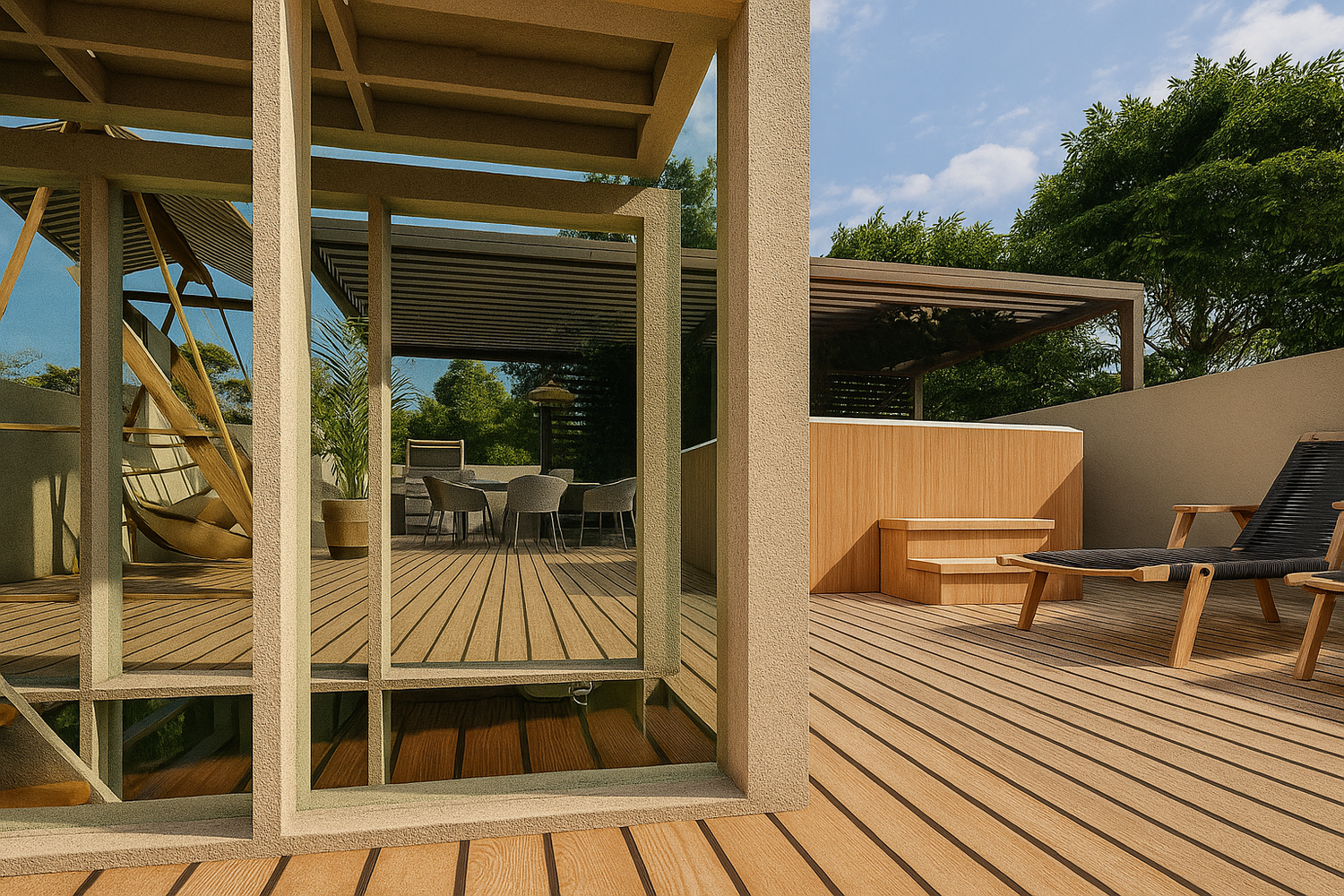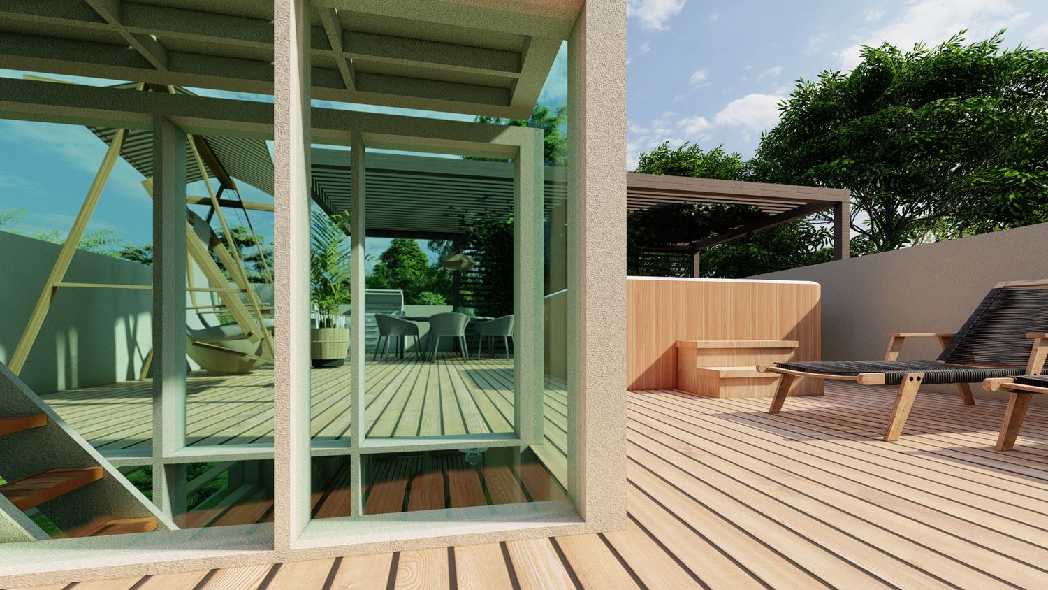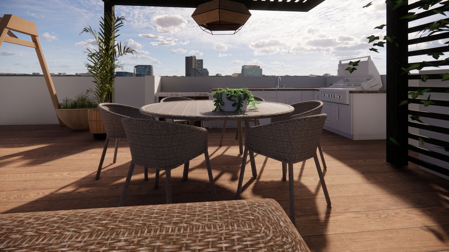 The main terrace has been designed with a jacuzzi, hanging swing, lounge seating, barbecue unit and service cabinetry, preserving spatial continuity with the urban view.