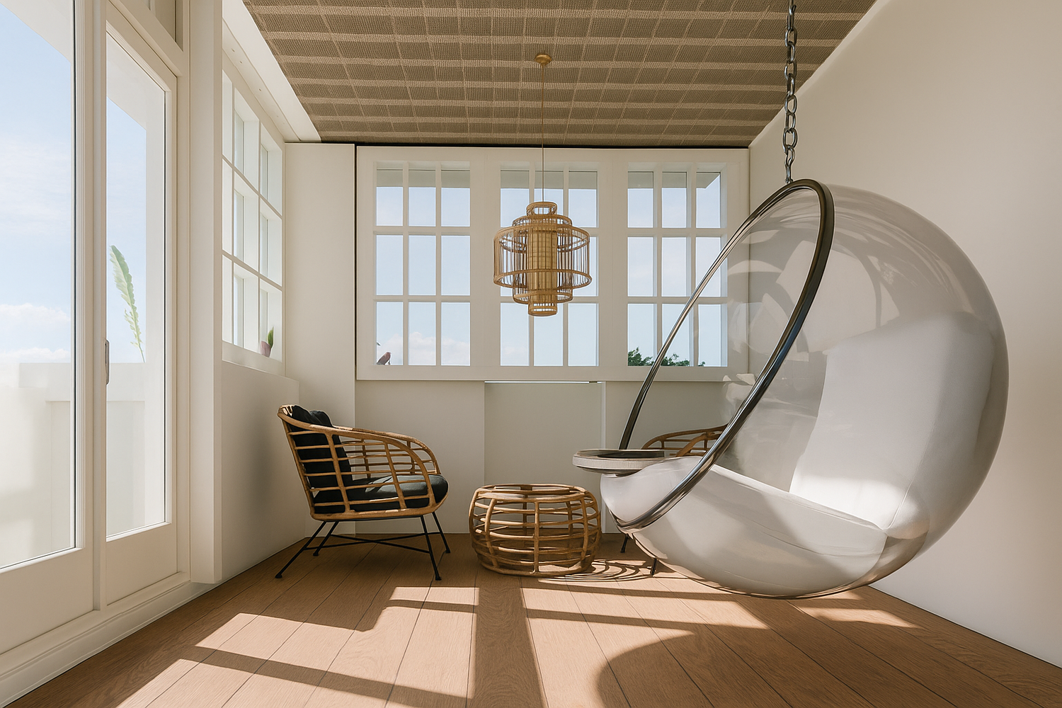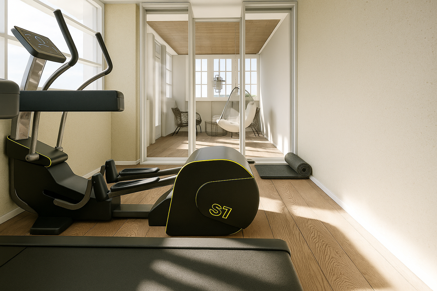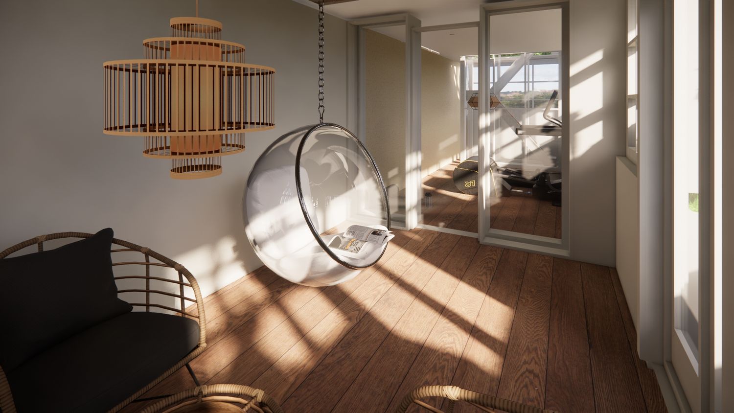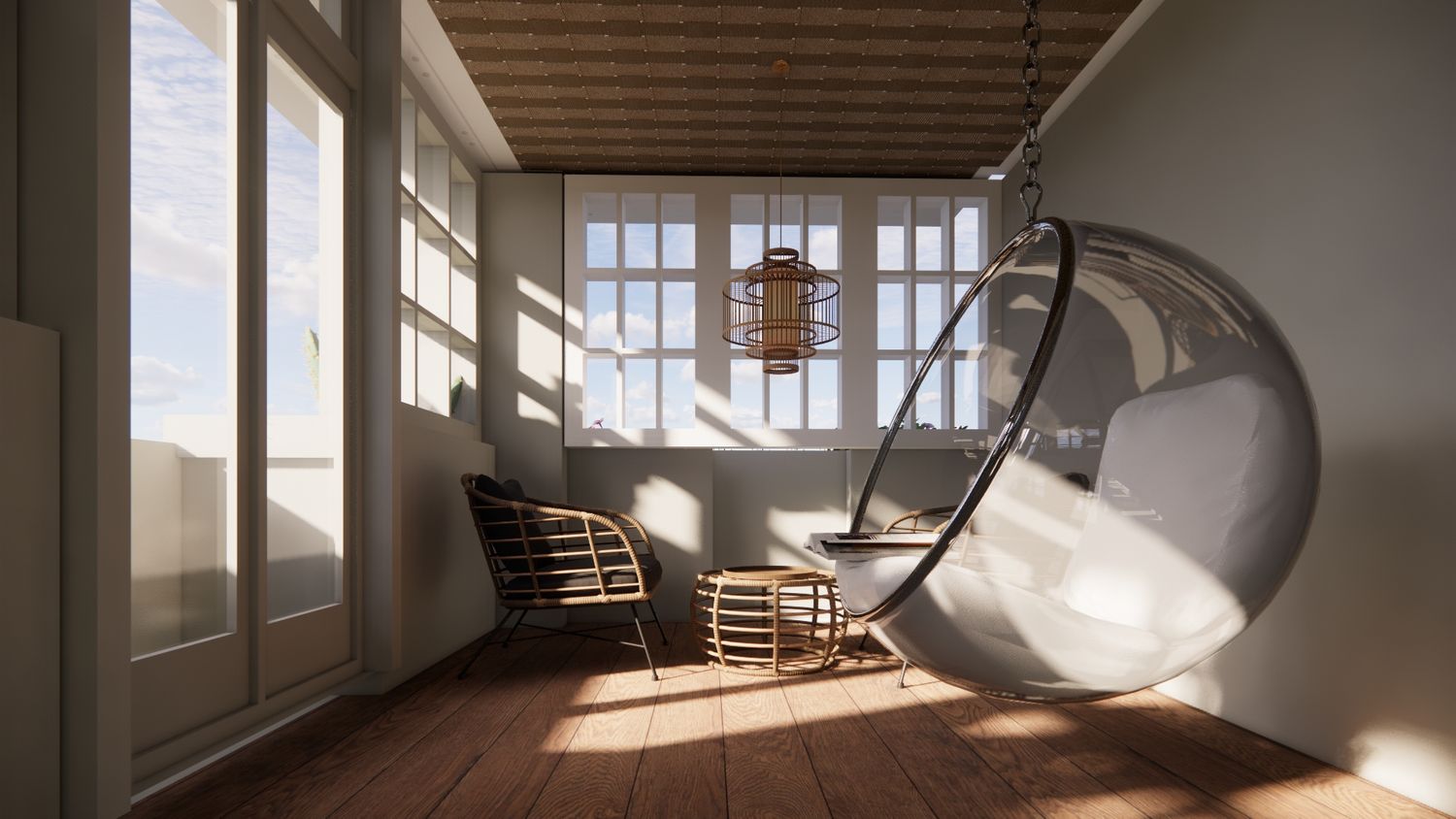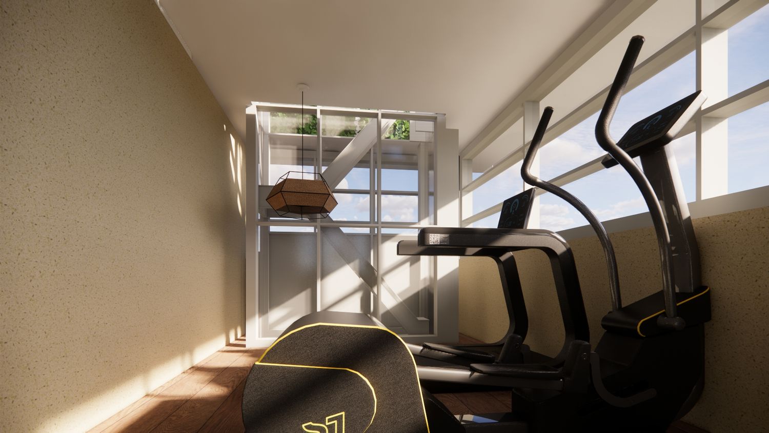 The balcony has been organized as a covered gym area with an integrated reading nook.