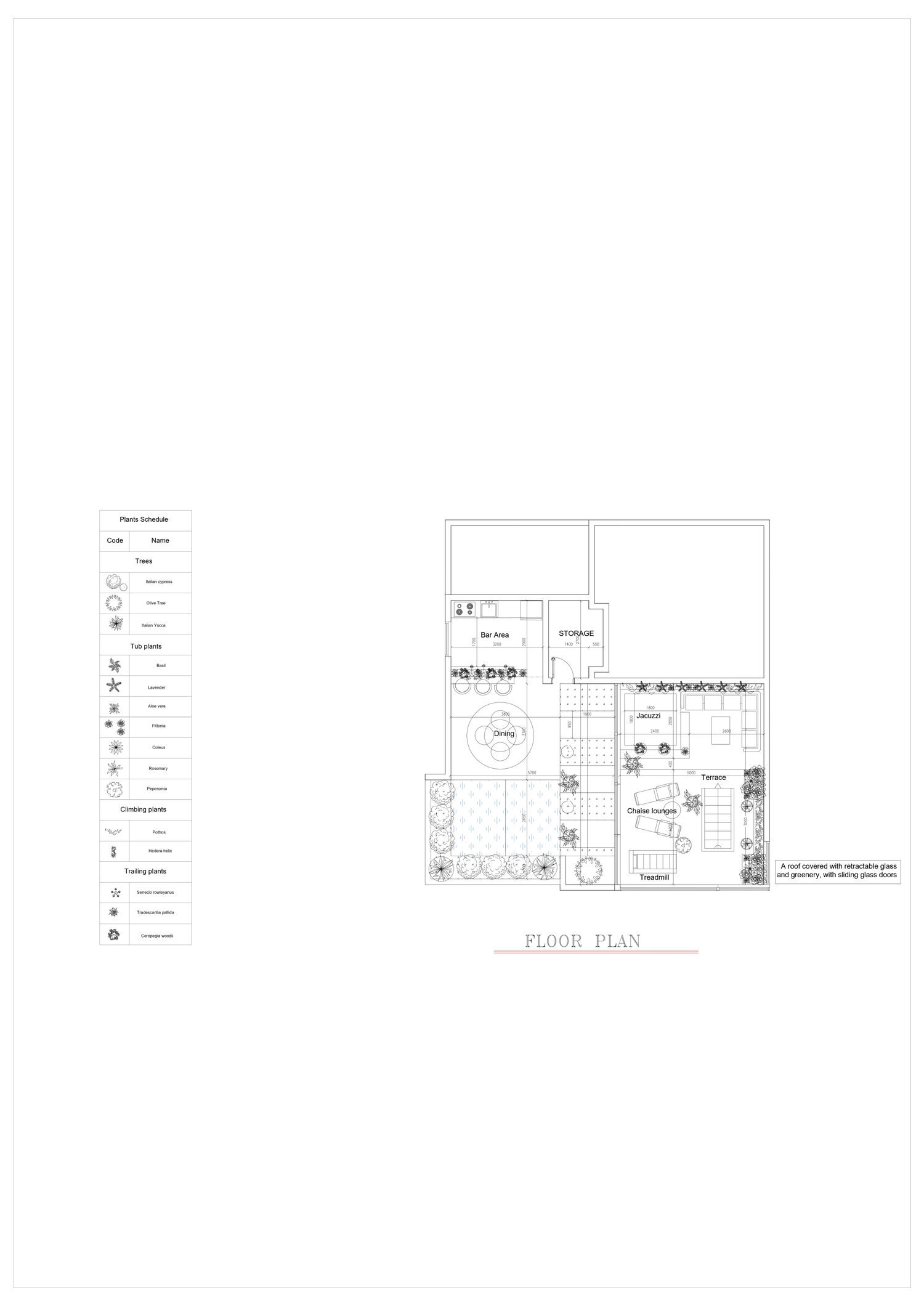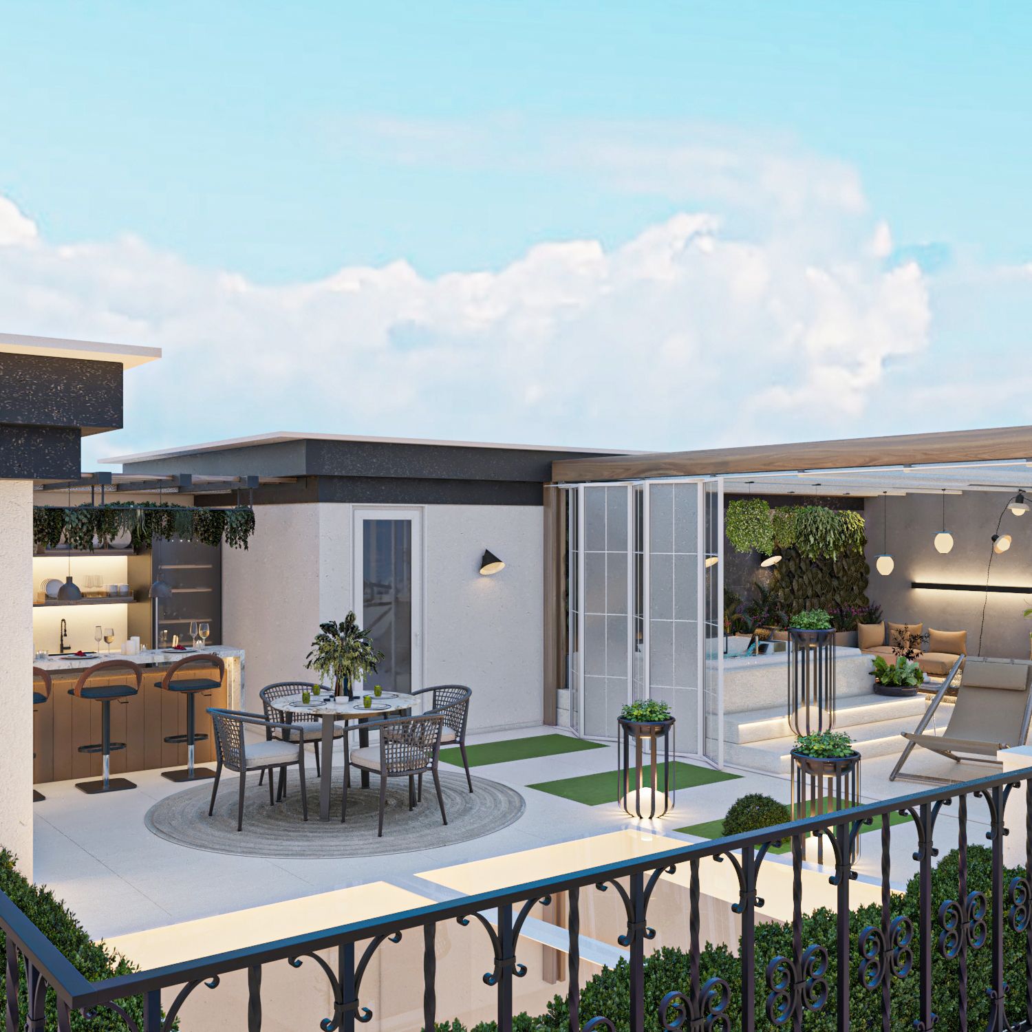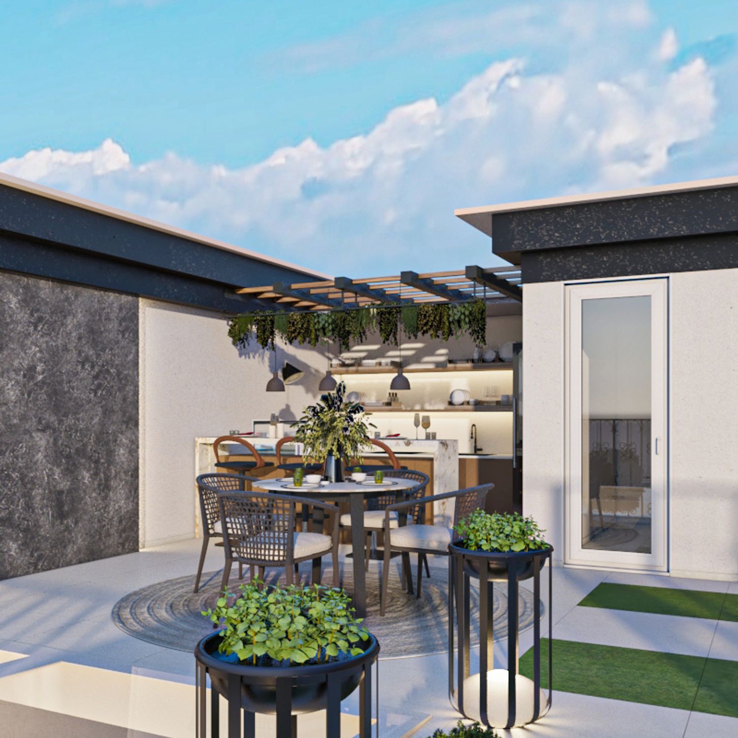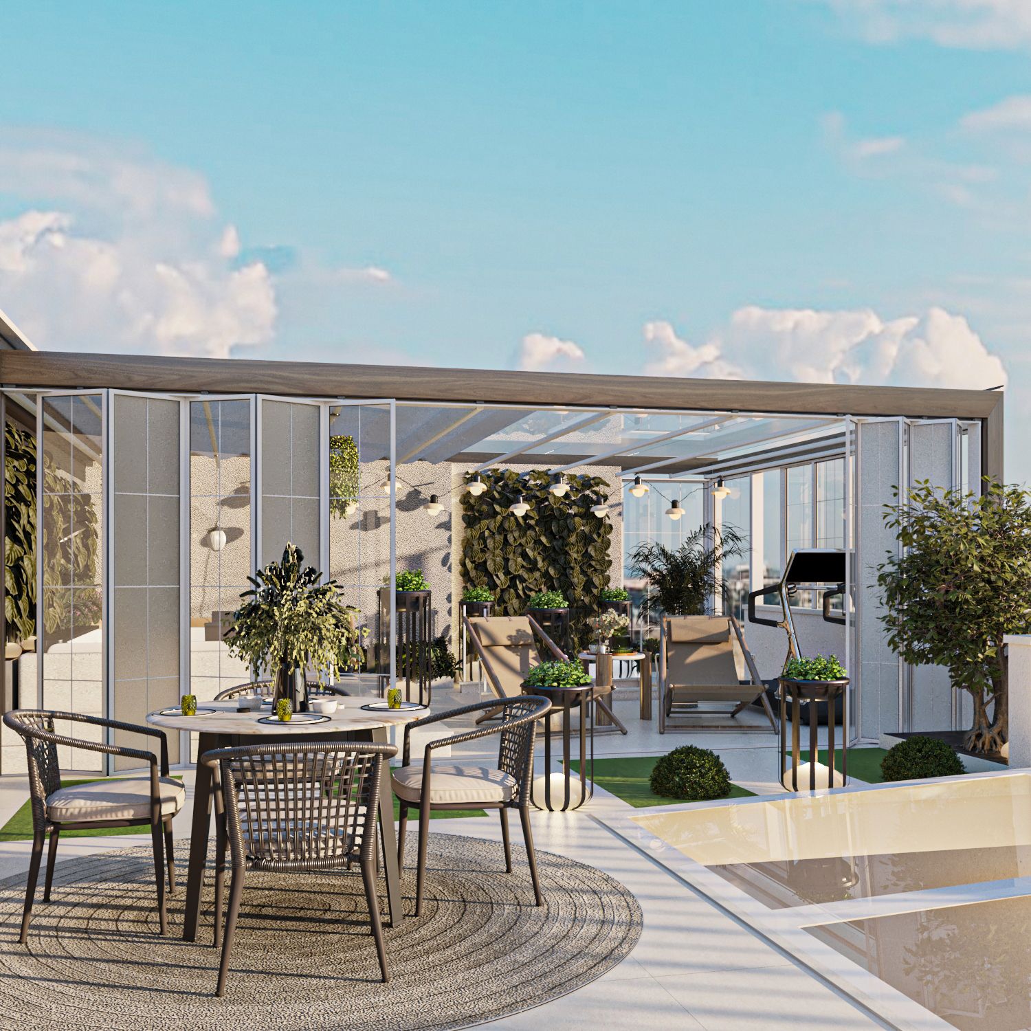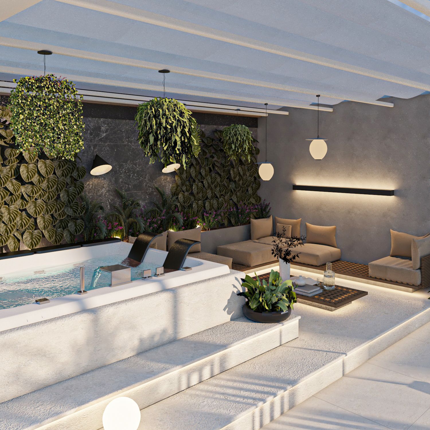 Questo progetto riguarda tutto il trovare il perfetto equilibrio tra comfort, bellezza naturale e identità culturale. È suddiviso in due zone complementari: Area Chiusa: Situata proprio accanto alla scala, questa sezione accogliente presenta un solarium con un tetto di vetro automatico e tende retrattili, oltre a facciate in vetro apribili. Qui puoi controllare facilmente la luce e la ventilazione! Include: • Un'area salotto familiare confortevole, completa di una jacuzzi e una zona relax con un lettino e un tapis roulant. • Le piante sono disposte con cura in tutto lo spazio, migliorando l'atmosfera e fornendo privacy. Troverai varietà rampicanti, vegetazione cascante e piante in vaso vibranti che danno vita allo spazio.