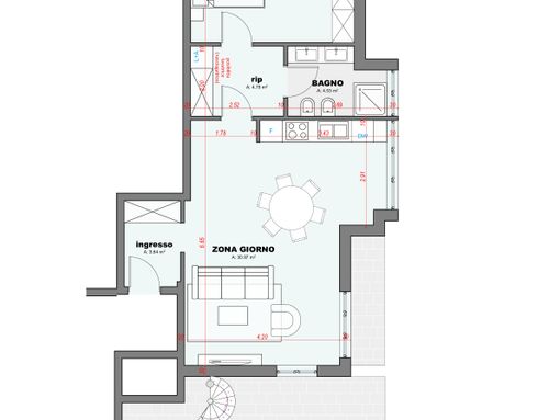 Vorremmo ottenere il maggior spazio possibile nella zona giorno, che la cucina a vista non risulti troppo invadente e un bagno comunque con la finestra. Come informazione la colonna di scarico è indicata vicino al terrazzo di servizio in quanto il bagno attuale era stato riposizionato in lavori precedenti.
