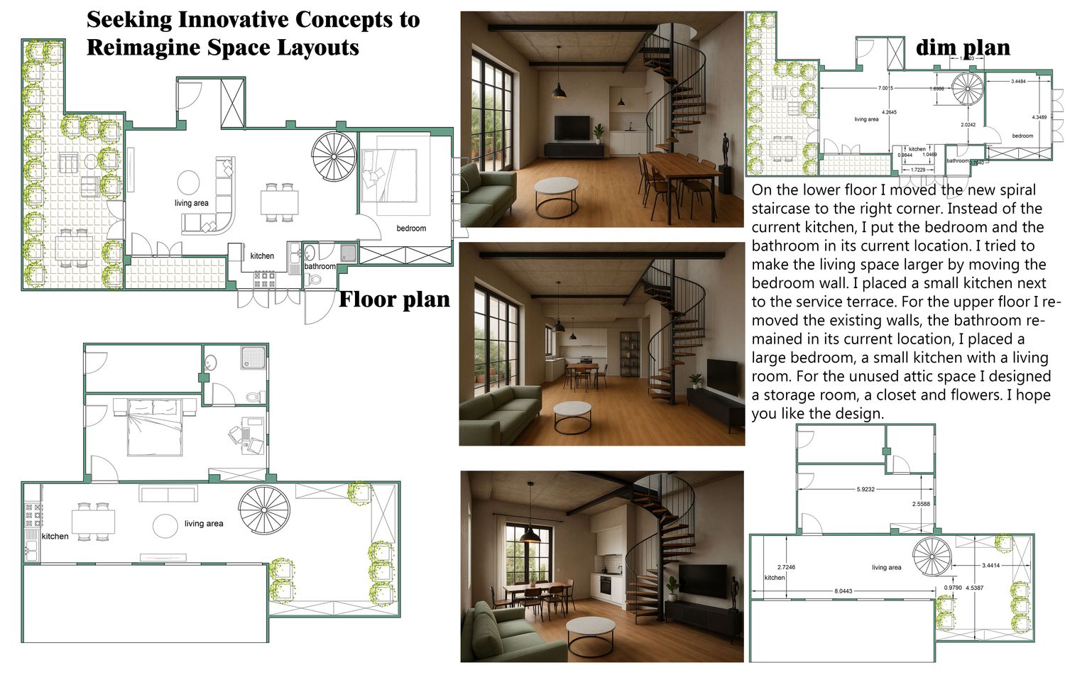 On the lower floor I moved the new spiral staircase to the right corner. Instead of the current kitchen, I put the bedroom and the bathroom in its current location. I tried to make the living space larger by moving the bedroom wall. I placed a small kitchen next to the service terrace. For the upper floor I removed the existing walls, the bathroom remained in its current location, I placed a large bedroom, a small kitchen with a living room. For the unused attic space I designed a storage room, a closet and flowers. I hope you like the design.