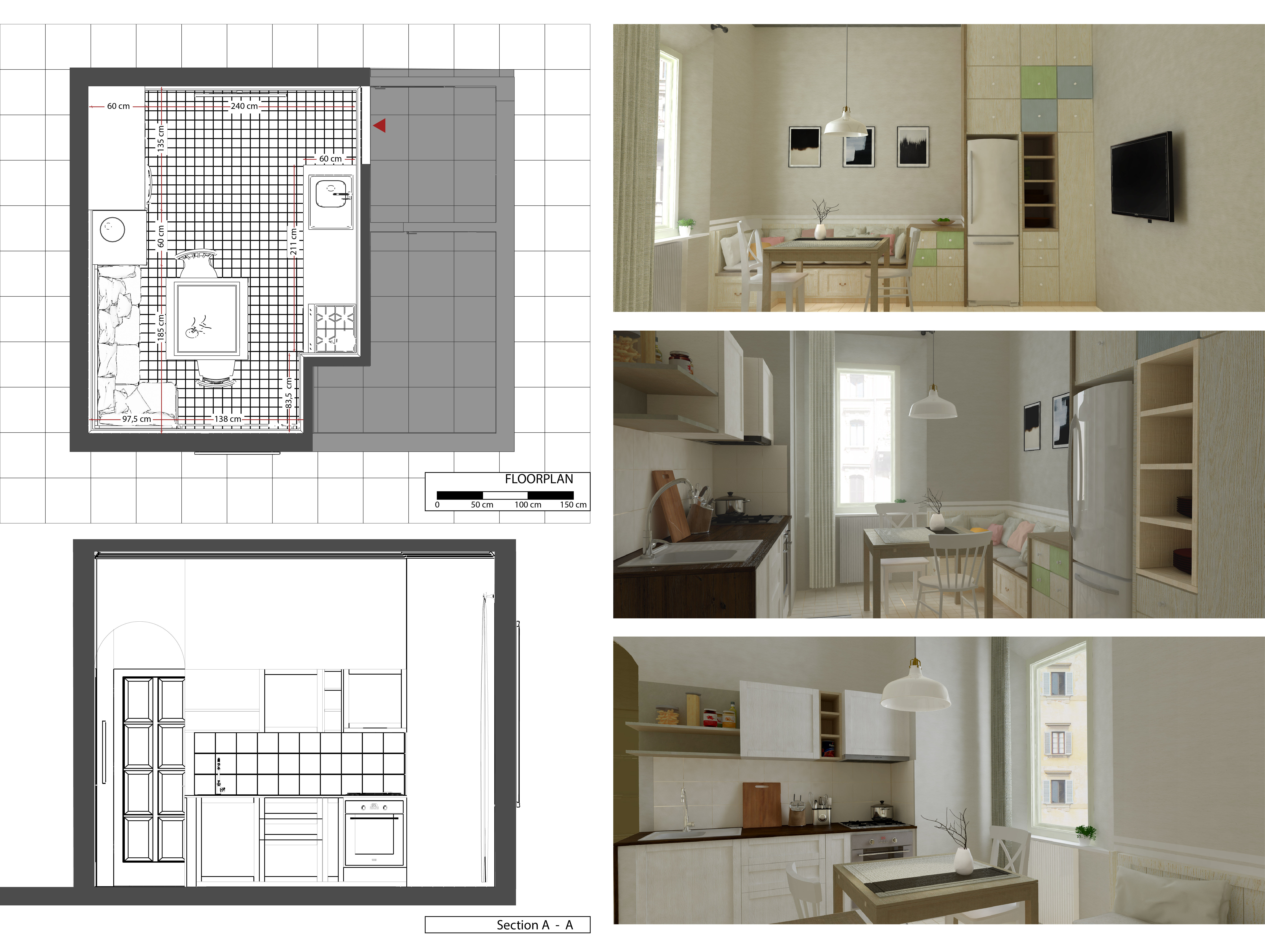 Small kitchen/dining/living space without changing floor and kitchen tiles (maybe just painting or paneling kitchen tiles or painting one wall) and getting a white based and natural/raw woody industrial/scandinavian/vintage feel. Trying to exploit the height of 320 cm with cost effective solutions and trying to get some storage space without overfurnishing because of the small space. Maybe with a tiny sofa for two and dining table for two/four people. Too much for a small space? Of course all the existing furniture will be replaced. Many Thanks.