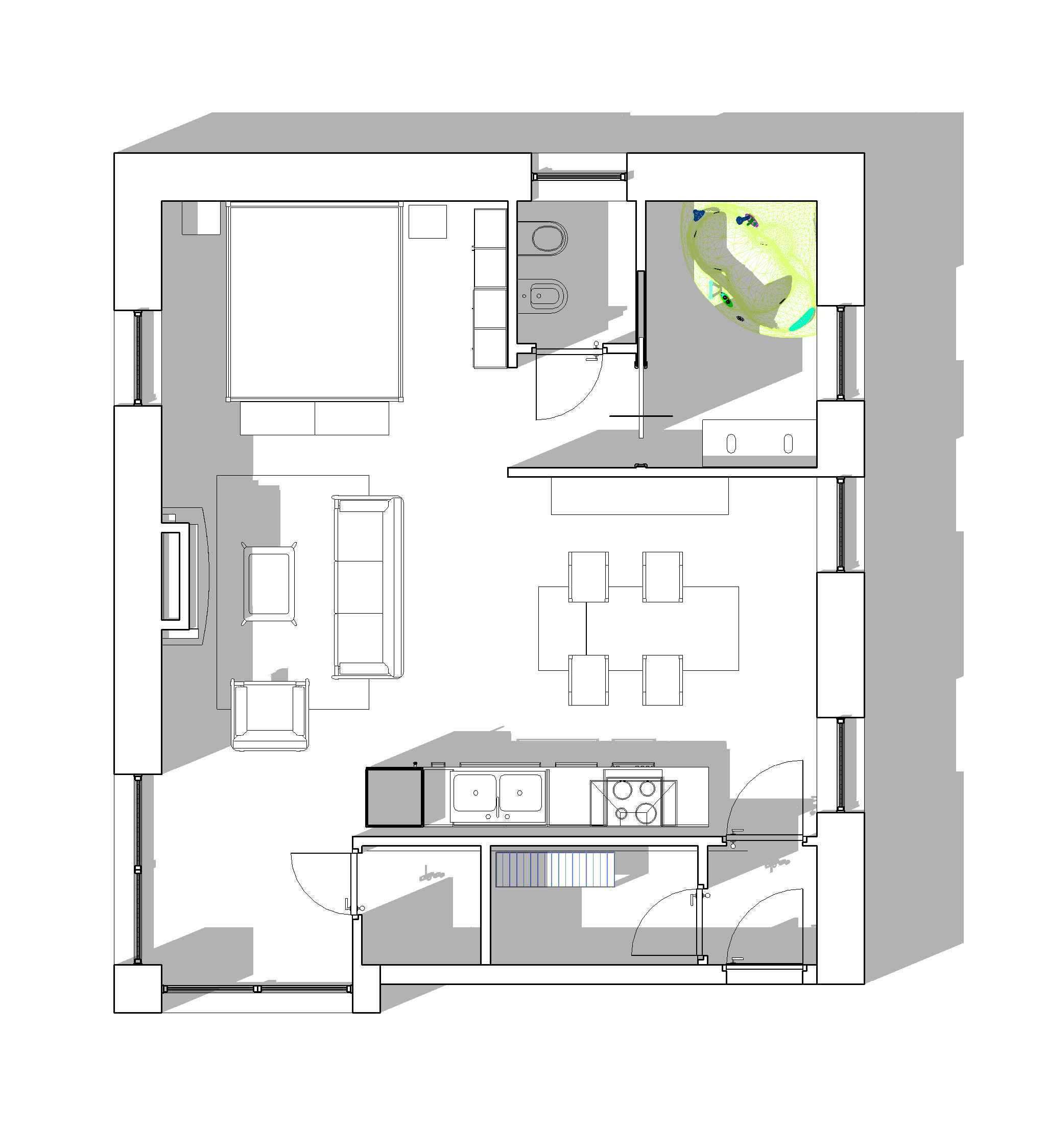 va inoltre previsto uno spazio con tavolino per poter consumare la colazione (breakfast) che potrà essere servita dall'albergo (room service) il tutto con uno stile open space. Piccolo locale inserito nell'arredamento con possibilità di ricoverare durante la stagione invernale, sci/snowboard, scarponi da sci, con apposito asciugascarponi e durante la stagione estiva attrezzatura da trekking, Bici da corsa , mountaibike.
