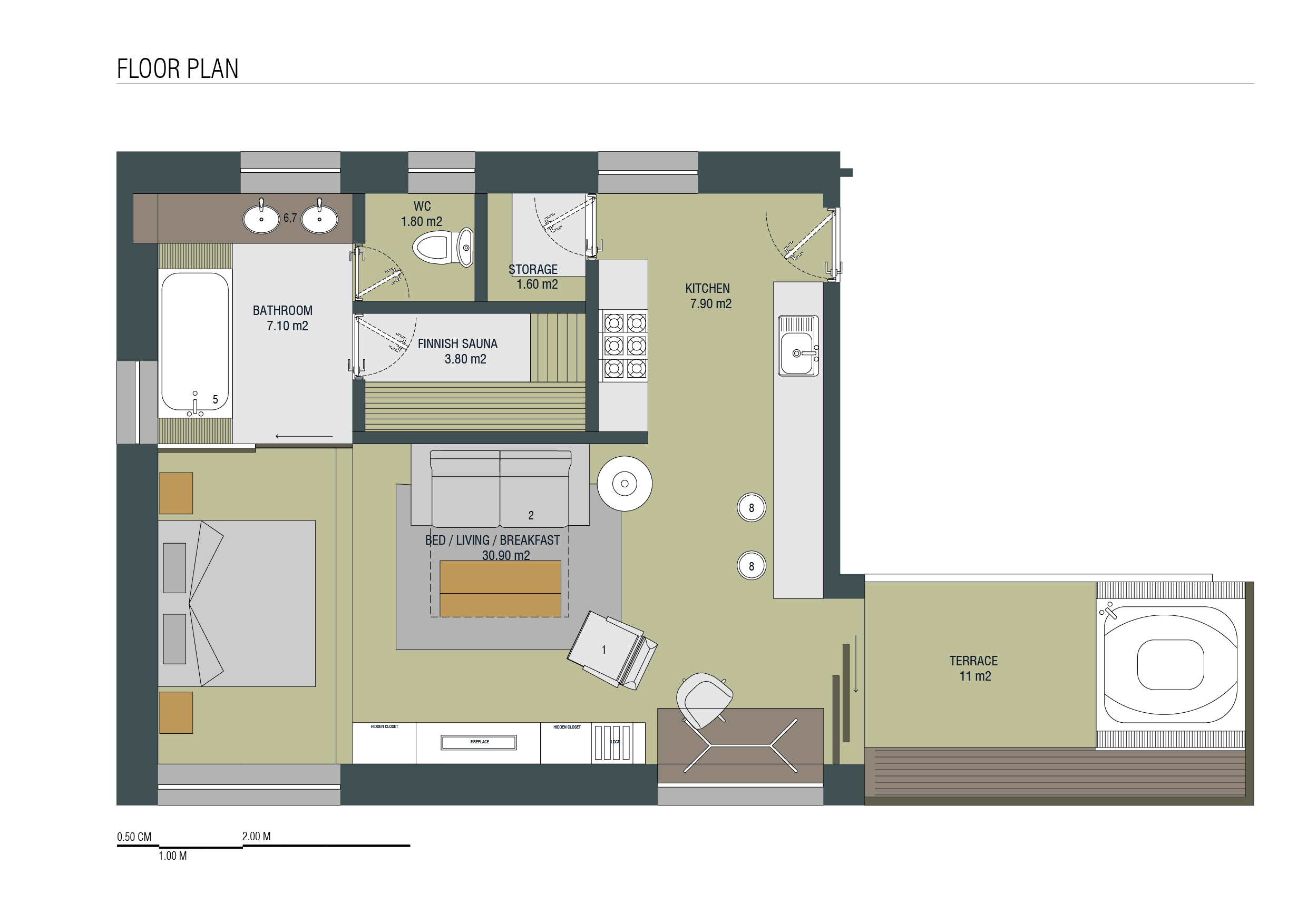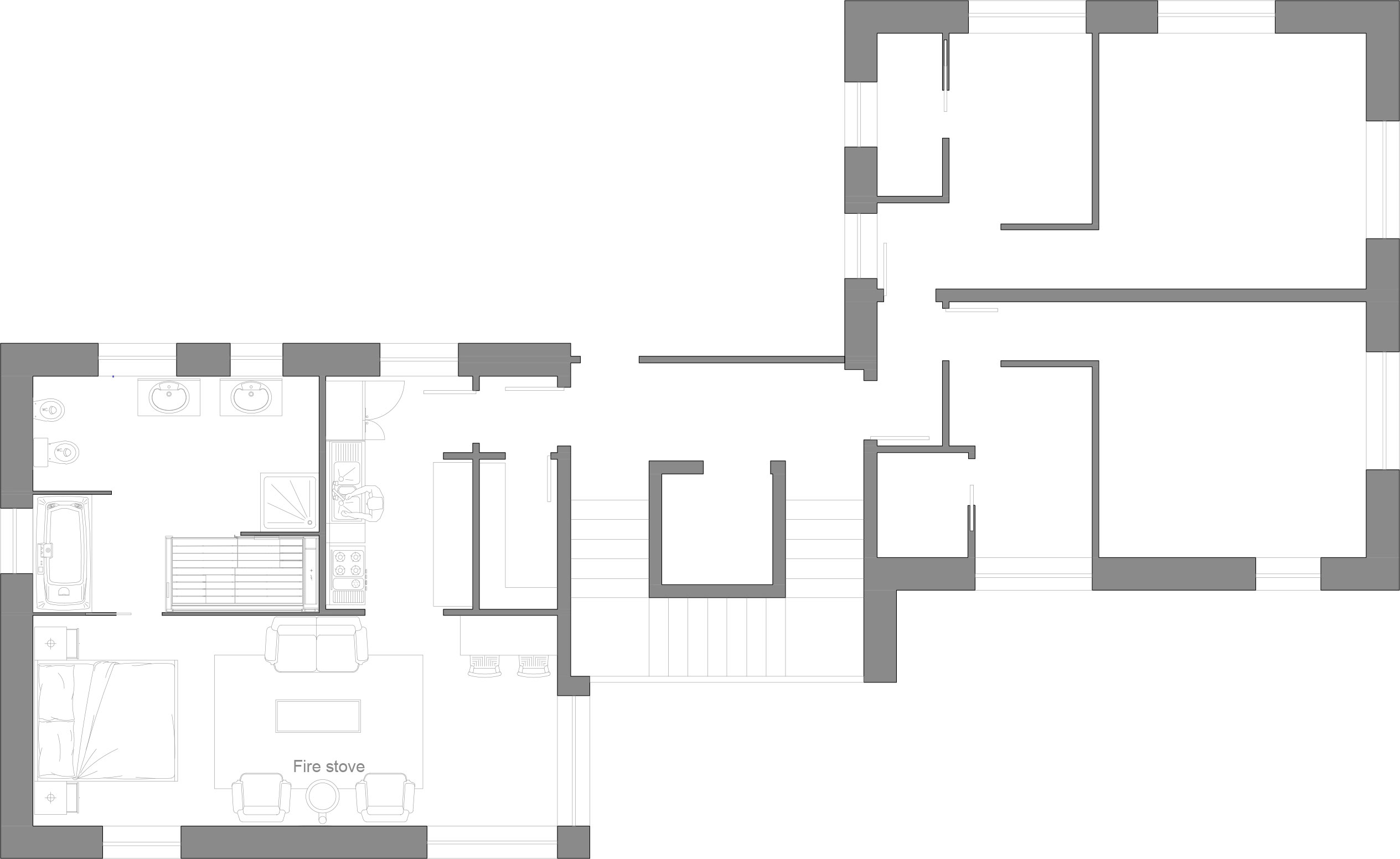 La suite per due persone (con possibilità di 2 letti aggiuntivi per ragazzi) dovrà prevedere naturalmente oltre al letto matrimoniale, servizi igenici (doppio lavandino), vasca, sauna, riscaldamento a pavimento, stufa a legna/pellets,piccola ma ben equipaggiata cucina, frigor, divano o poltrone