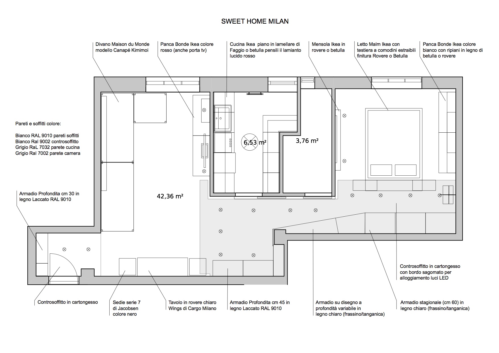 Ho un budget medio, quindi sono interessato a comprare i mobili all'IKEA, Cargo & High-Tech, divano poltrone, Leroy Merlin e altri negozi qui a Milano. Quello che mi serve è un layout della casa per intero, molte immagini/rendering degli spazi e dei dettagli, una lista completa con codici e prezzi dei mobili/oggetti usati (è possibile utilizzare anche le vendite al dettaglio on-line) con il modello e la marca. Lo schema dei colori per le pareti e i codici dei colori proposti, se si utilizzano colori diversi per i diversi ambienti.