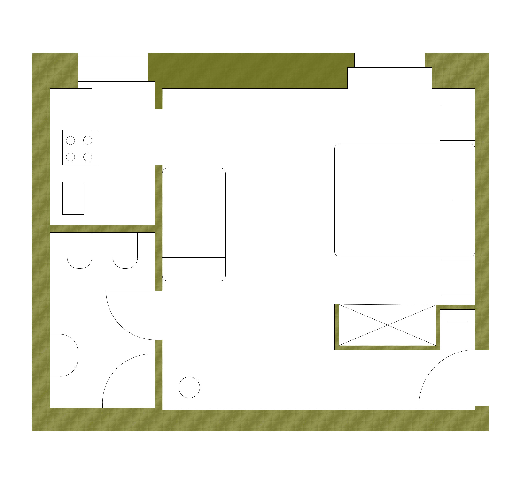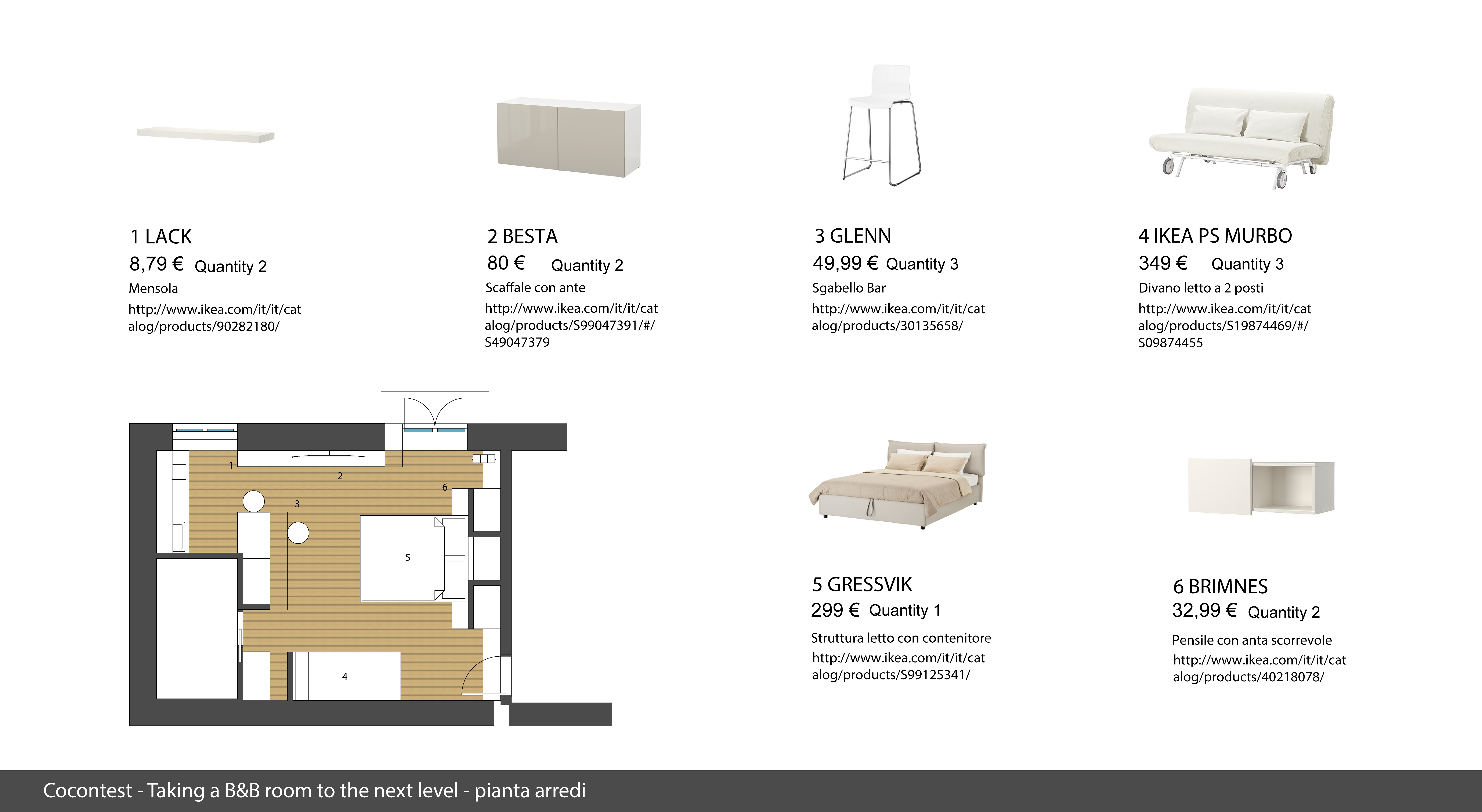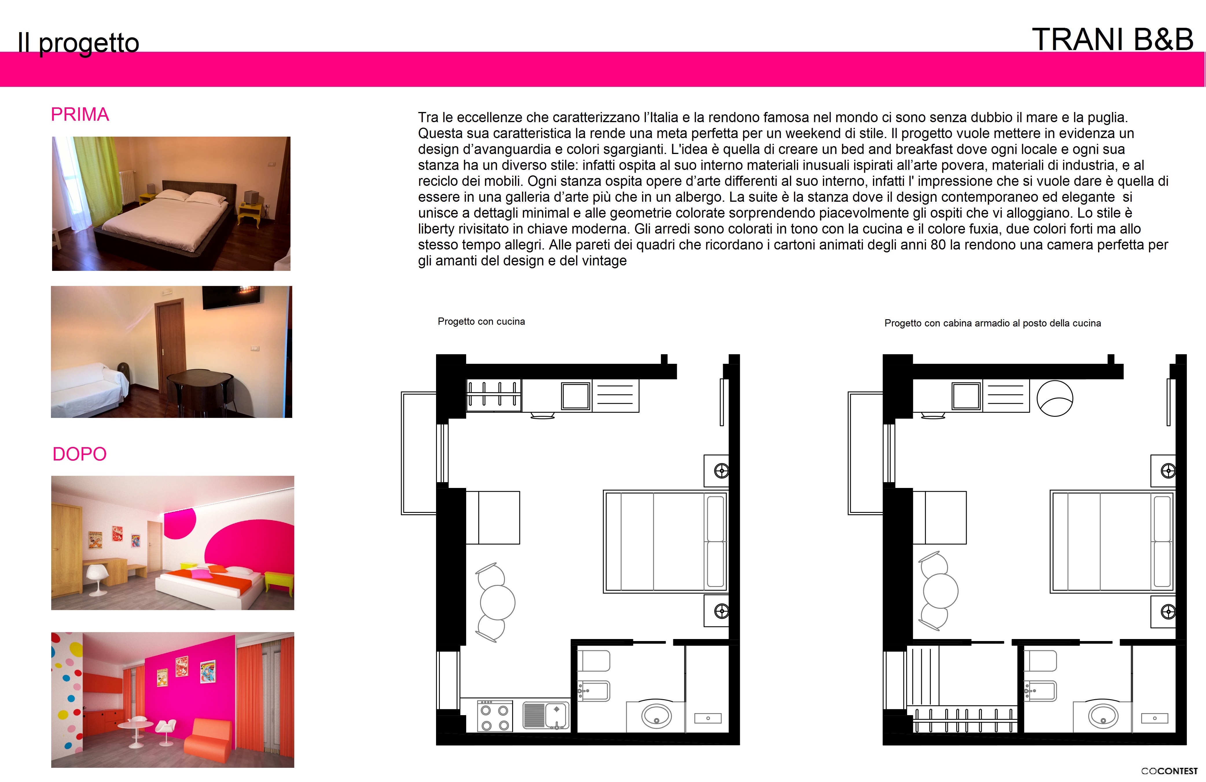 All'interno della stanza ci devono essere: letto matrimoniale (160x200 ho gia' il matersasso) con comodini. Divano letto o soluzione terzo letto. Angolo colazione, con minifrigo, macchina caffe', tazze etc. Attualmente il problema piu' grande e' dove sistemare l'armadio, vorrei una soluzione per un armadio 2 ante massimo o qualcosa di moderno che vada bene per sogiorni non piu' lunghi di 1 settimana solitamente.