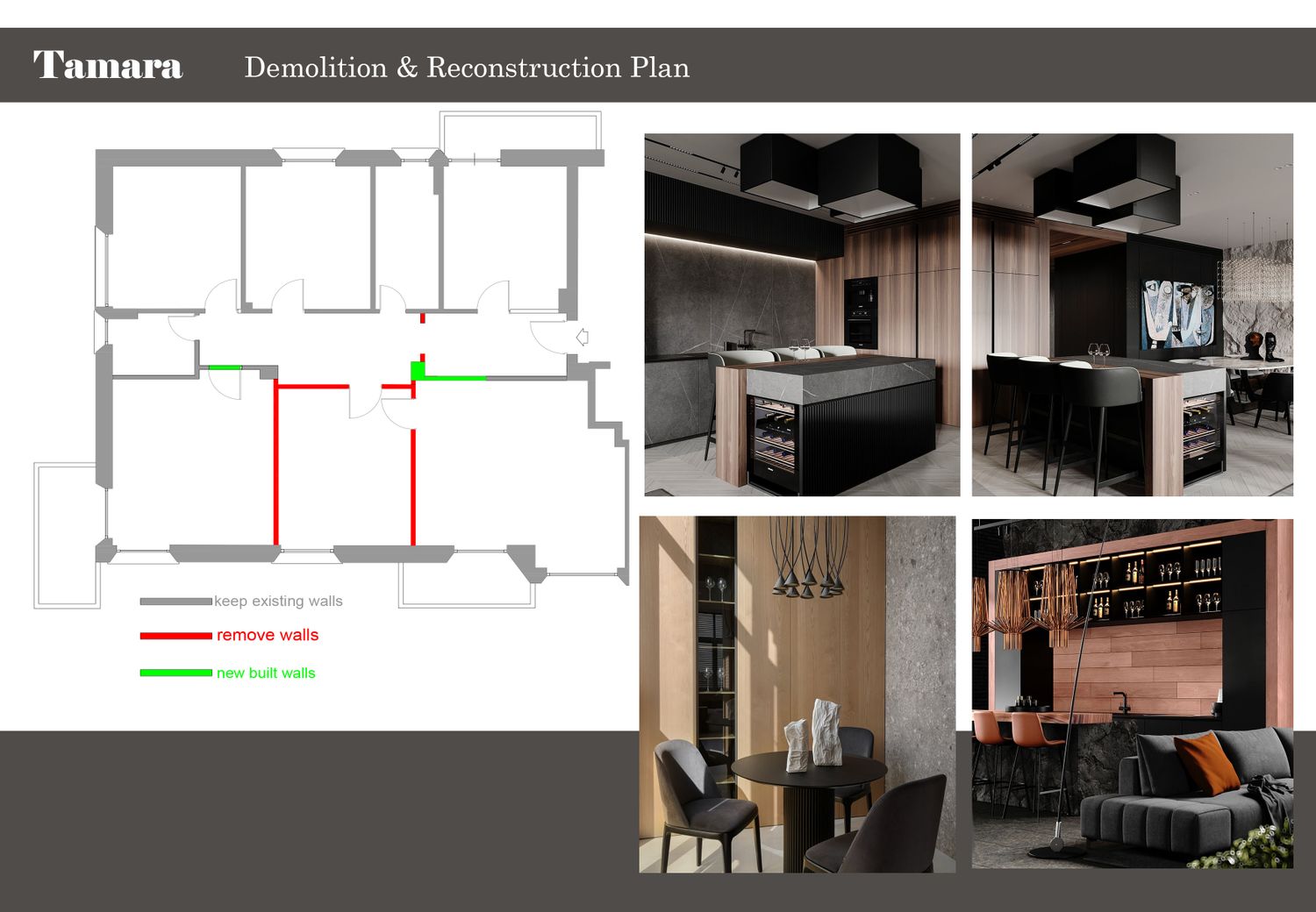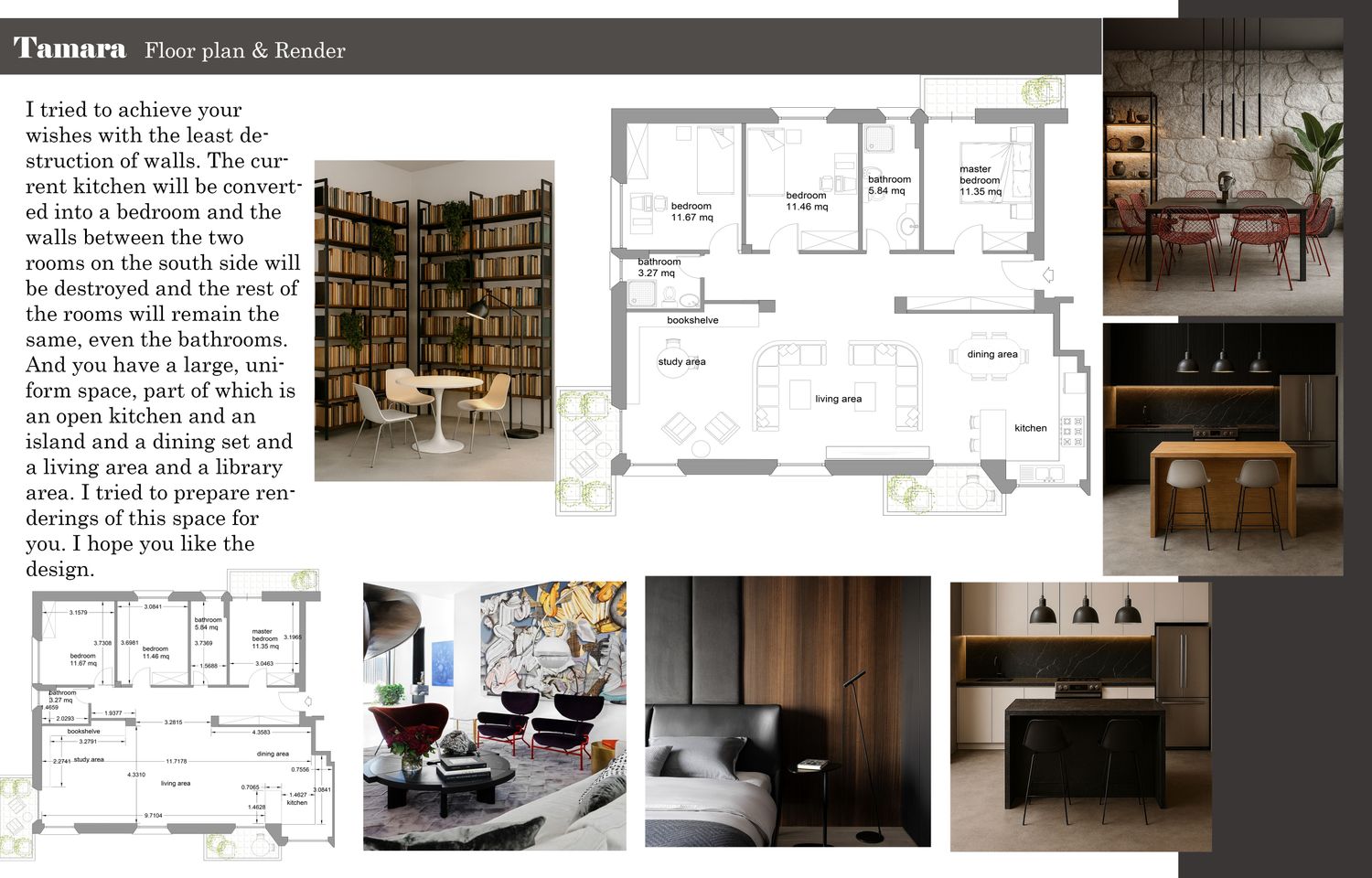 I tried to achieve your wishes with the least destruction of walls. The current kitchen will be converted into a bedroom and the walls between the two rooms on the south side will be destroyed and the rest of the rooms will remain the same, even the bathrooms. And you have a large, uniform space, part of which is an open kitchen and an island and a dining set and a living area and a library area. I tried to prepare renderings of this space for you. I hope you like the design.
