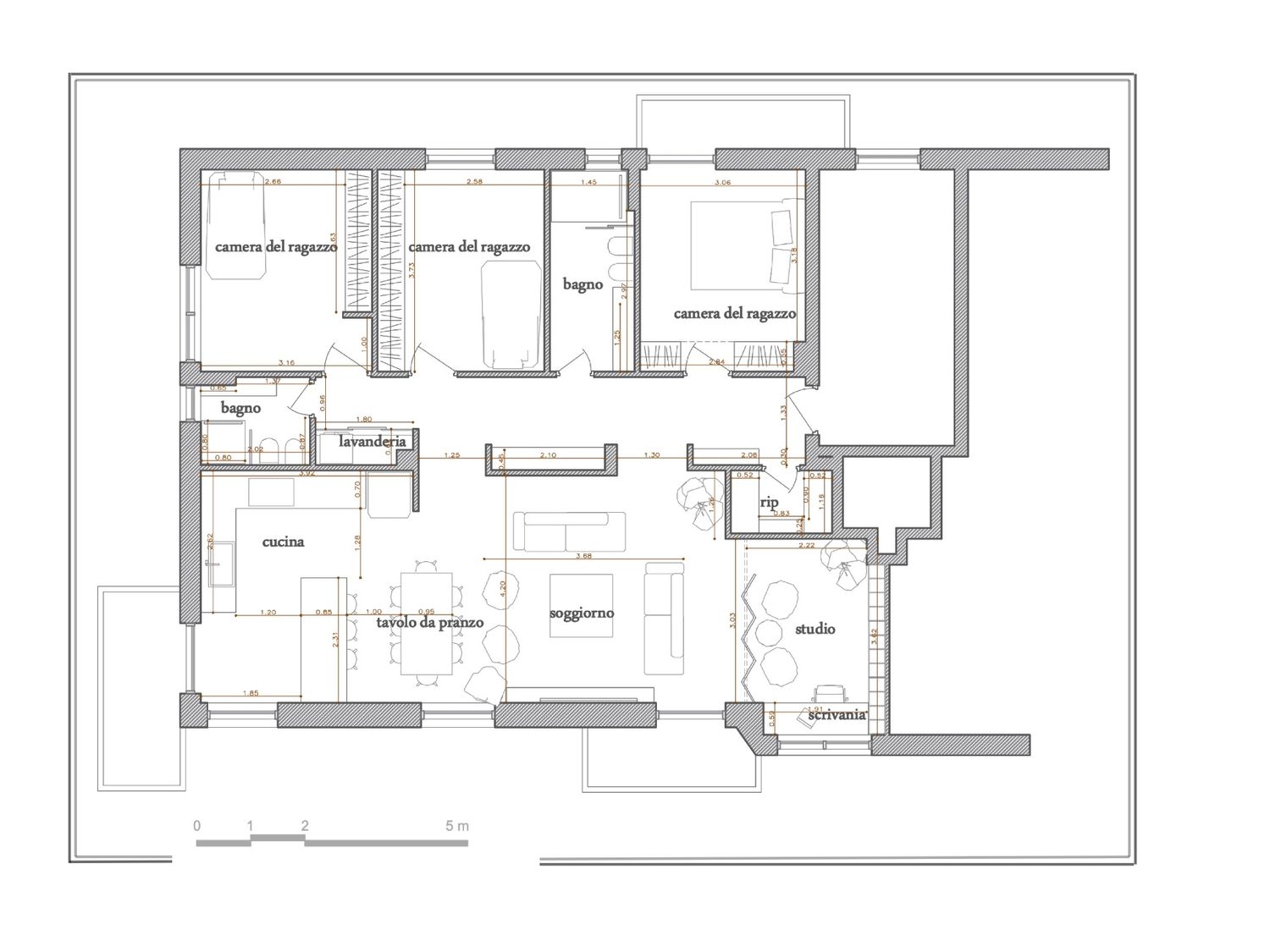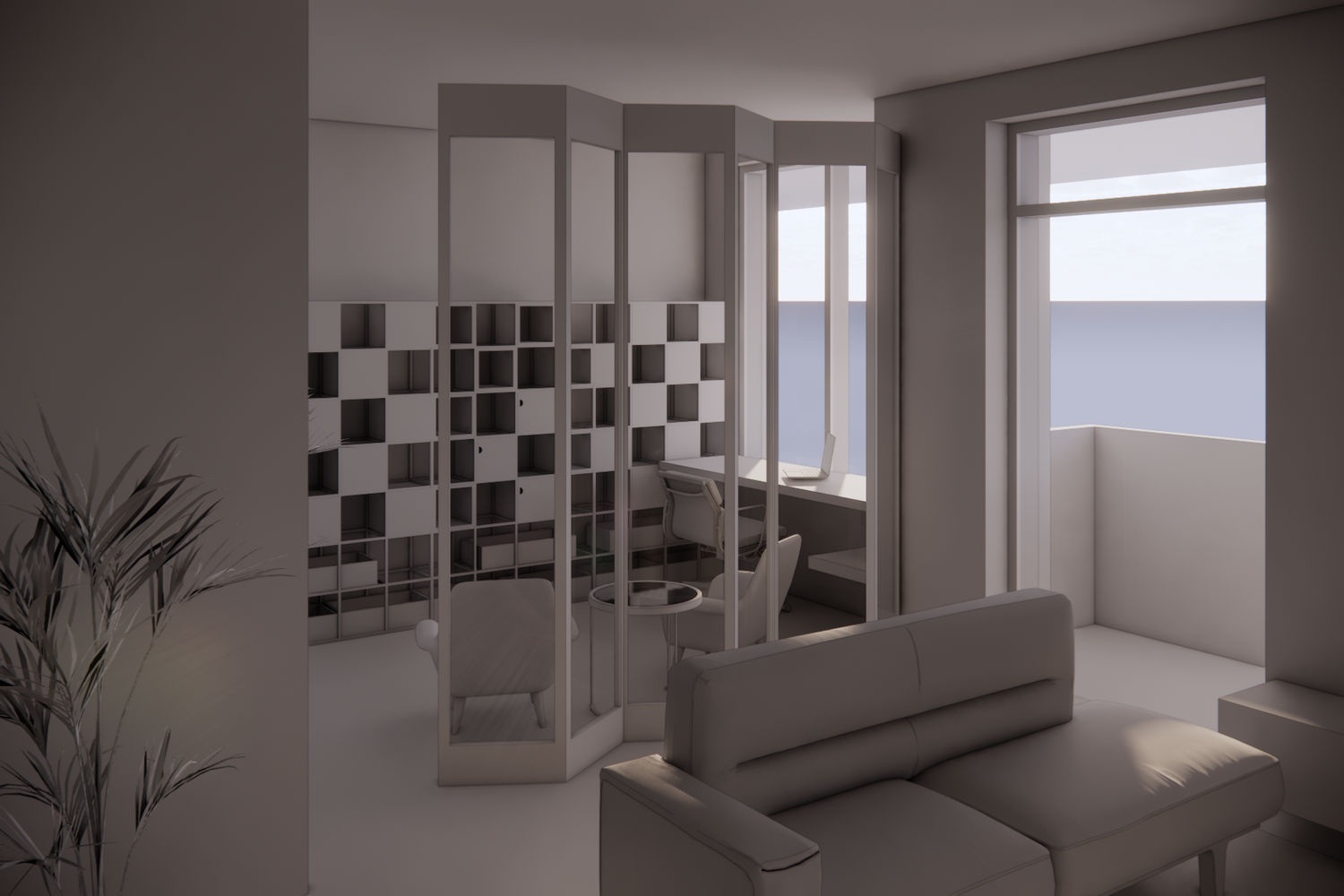 I tried to make the least amount of changes so that demolition costs stay at a minimum while achieving better efficiency. My proposal for your plan is this design, where I was able to create a storage room for you and also arrange the library and workspace so they remain connected with living room . With accordion glass doors, you’ll be able to separate the library from the living room, or keep them as one continuous space.