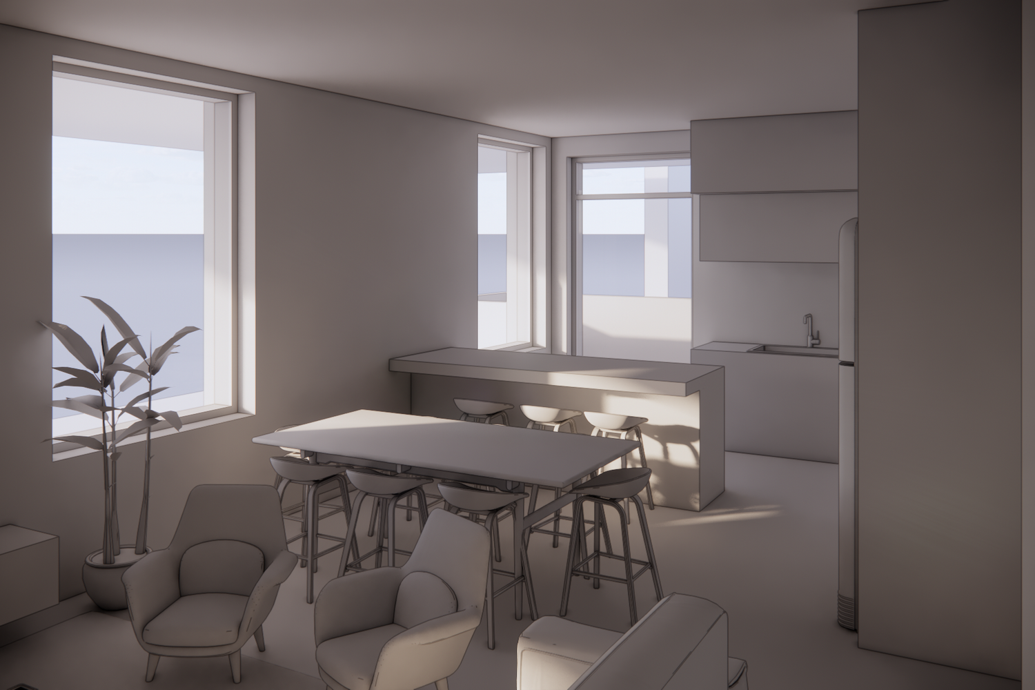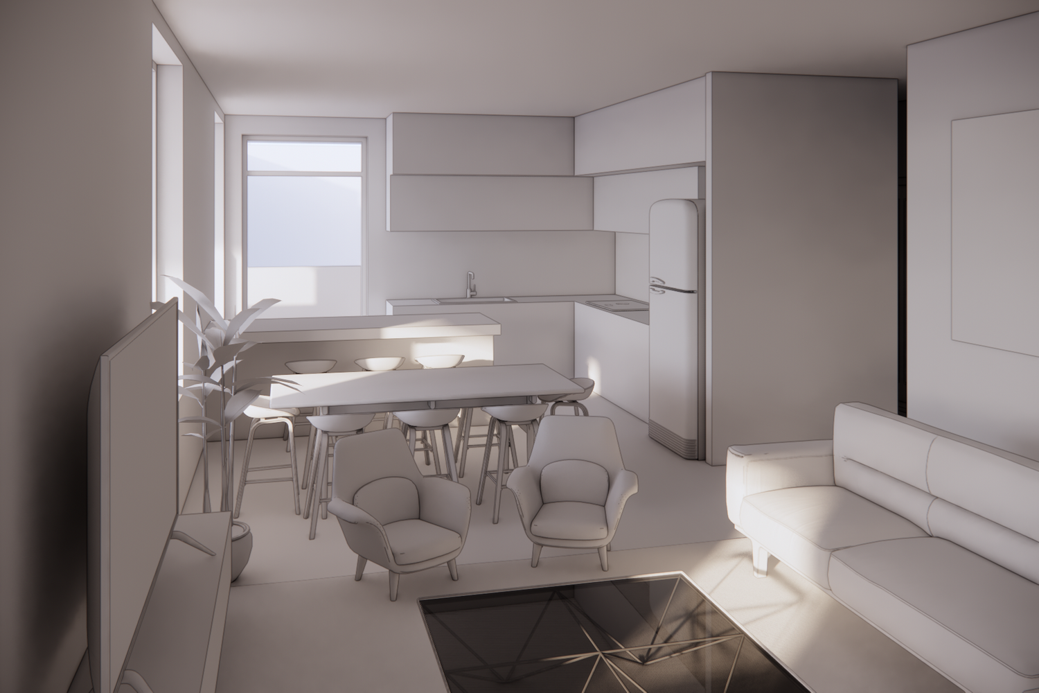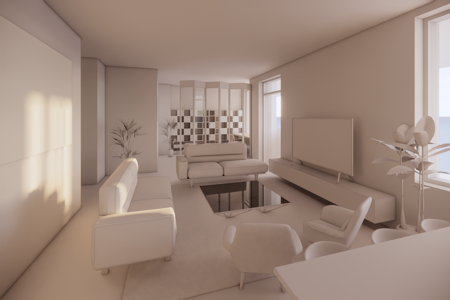 Since the bathrooms remained in place, the best location for the kitchen is on the southwest side of the plan. In this improved design, the bathrooms are upgraded and the spaces are better organized to ensure optimal performance. I also included a dedicated area for the washing machine that can serve as a laundry room, accessible through sliding doors.