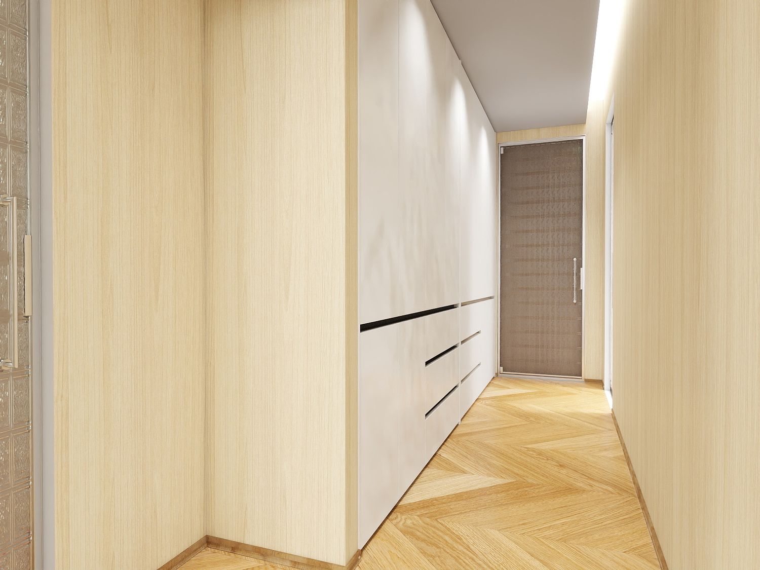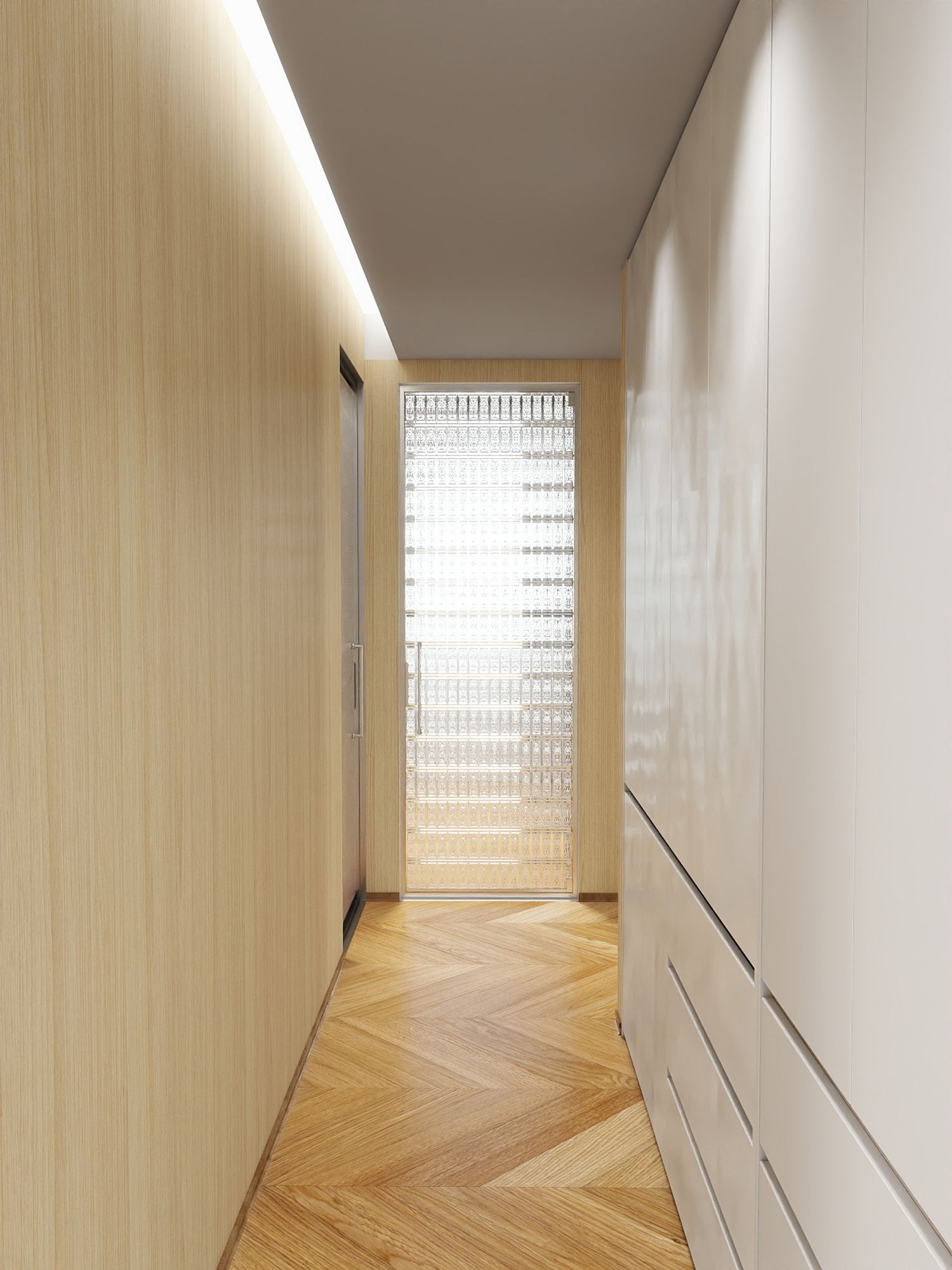 Sono previsti armadi filo muro e porte traslucide per le camere, così da favorire la diffusione della luce naturale.