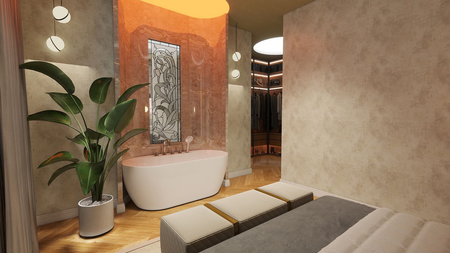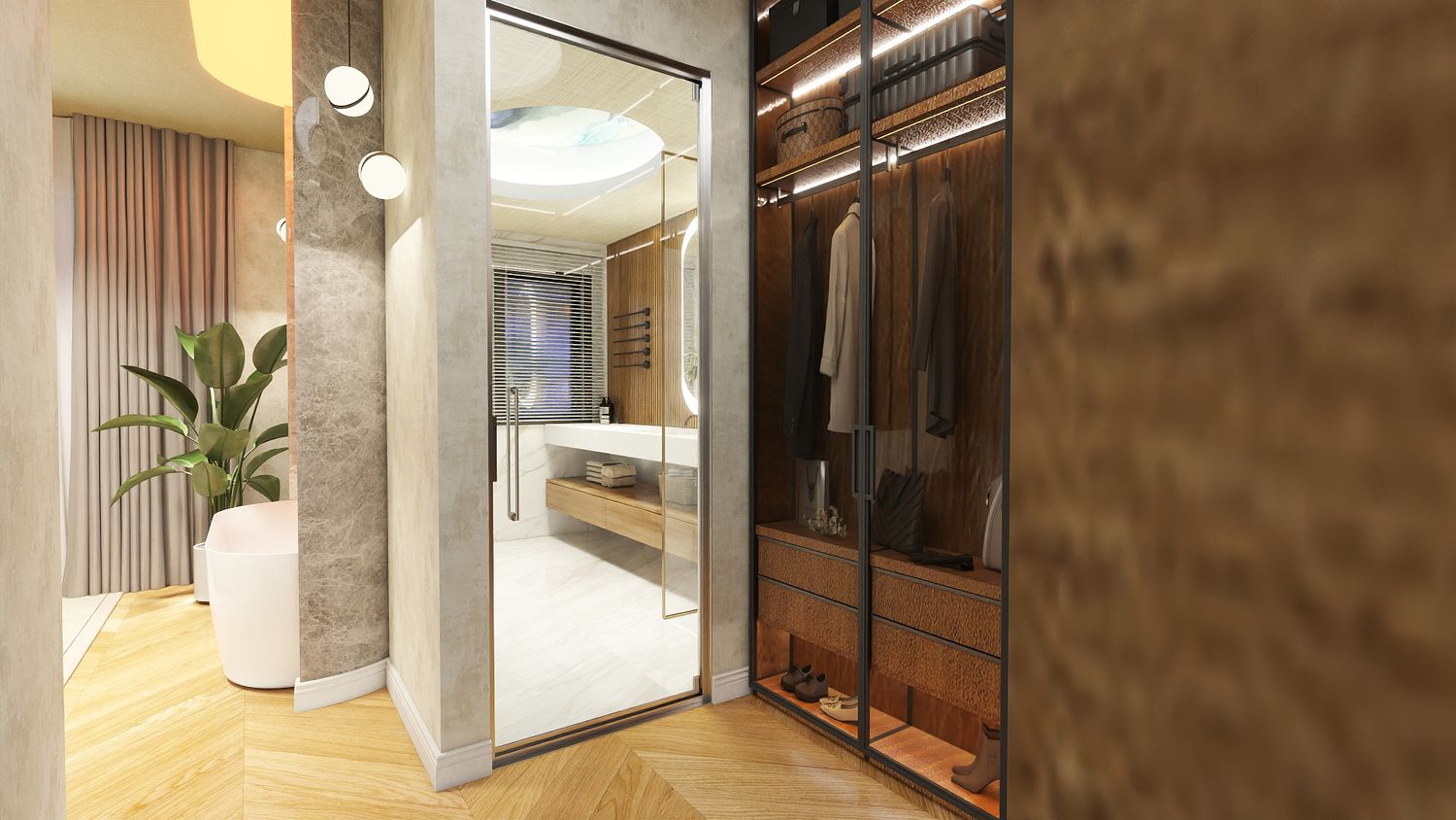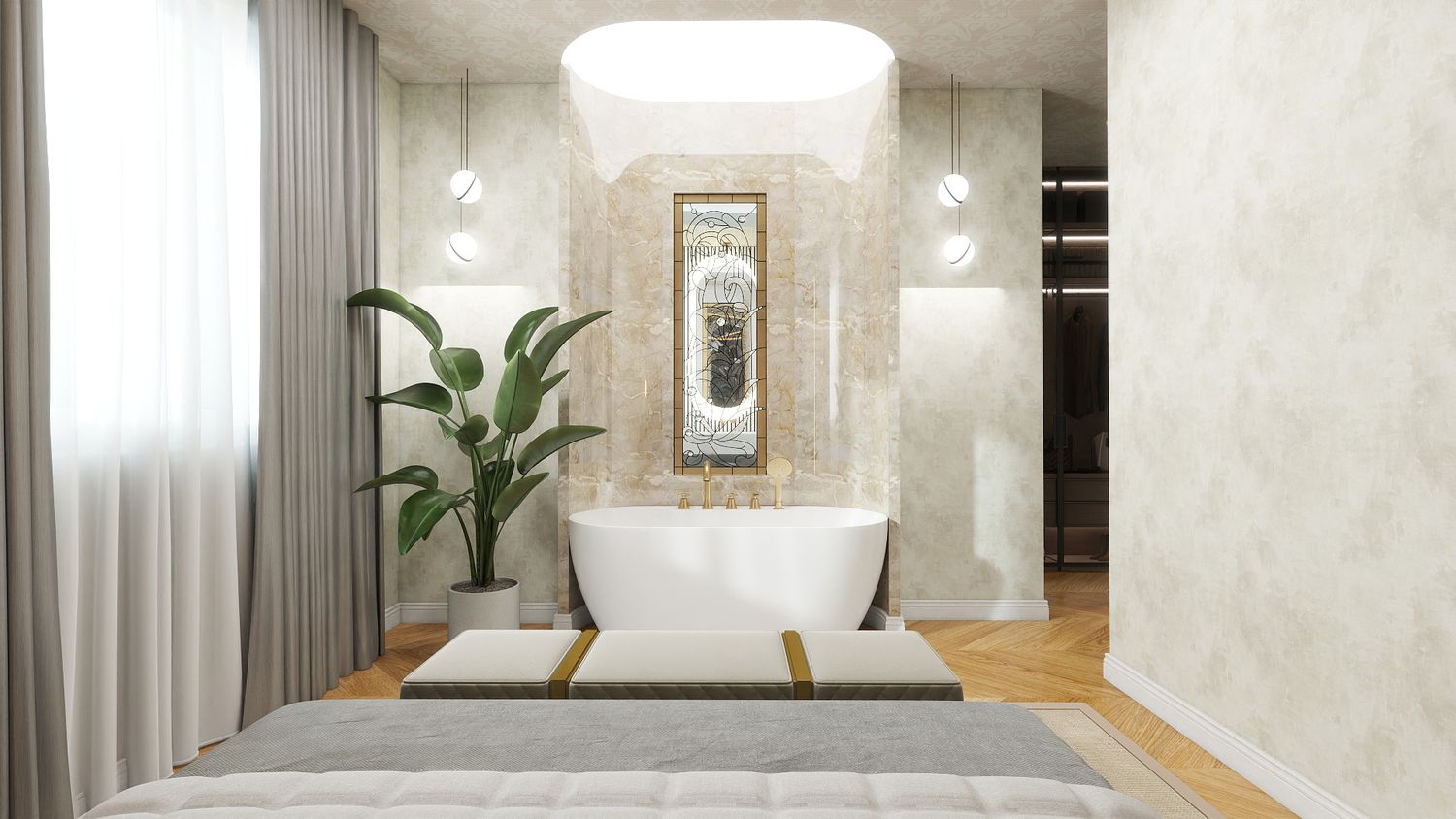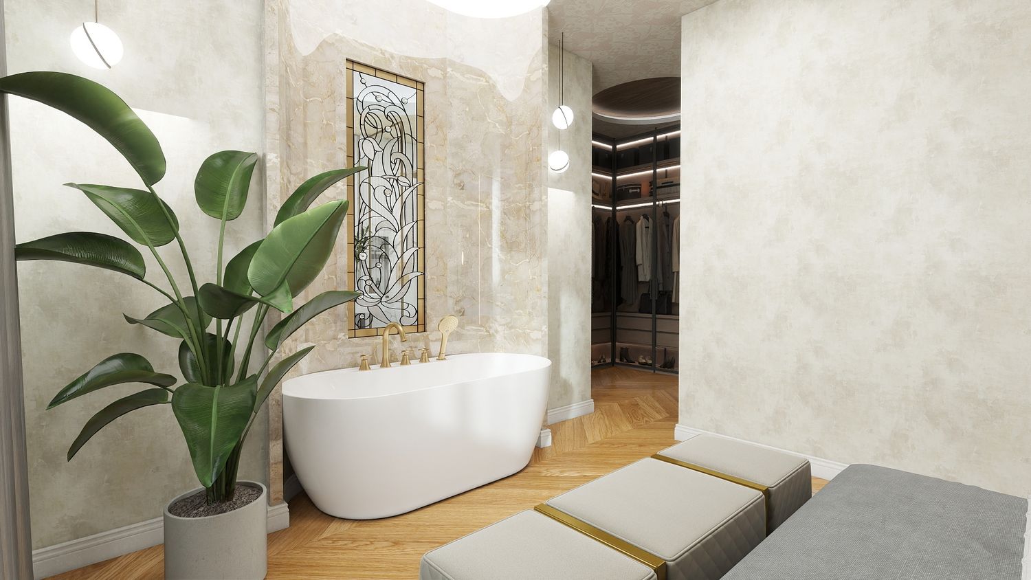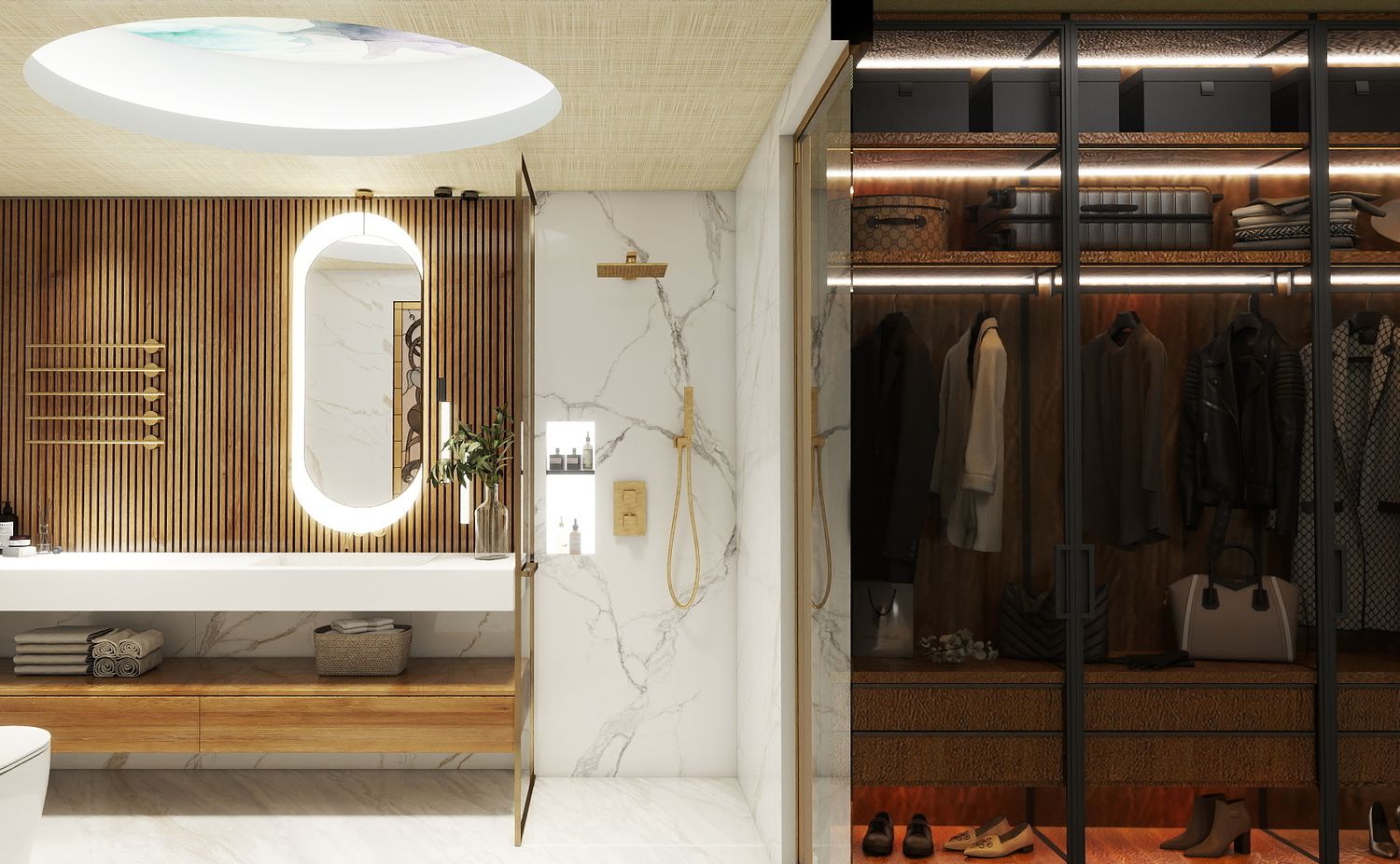 Include cabina armadio e vasca freestanding, con possibilità di accesso diretto dalla camera o alternativa con la vasca collocata nel bagno.