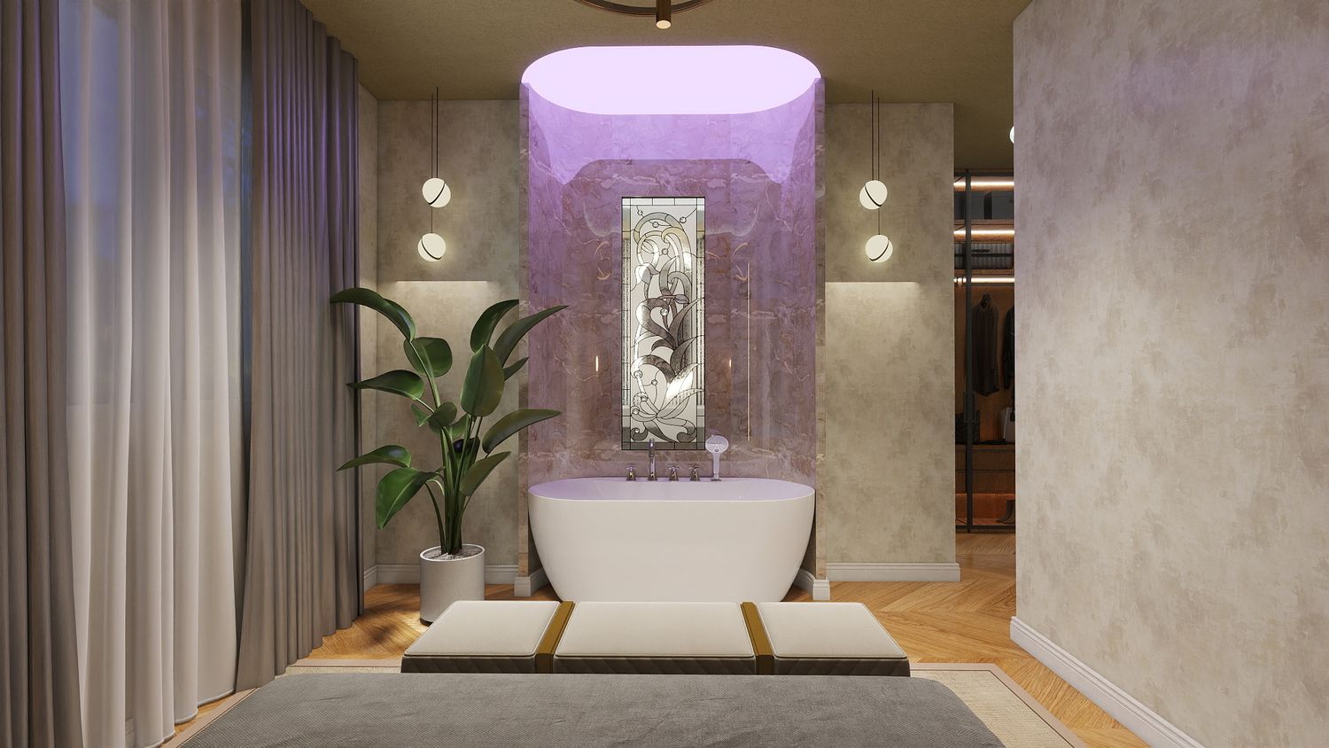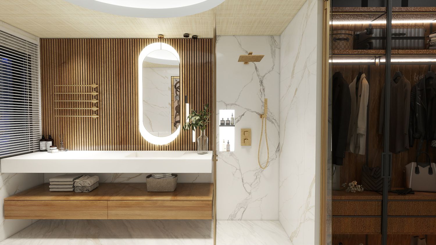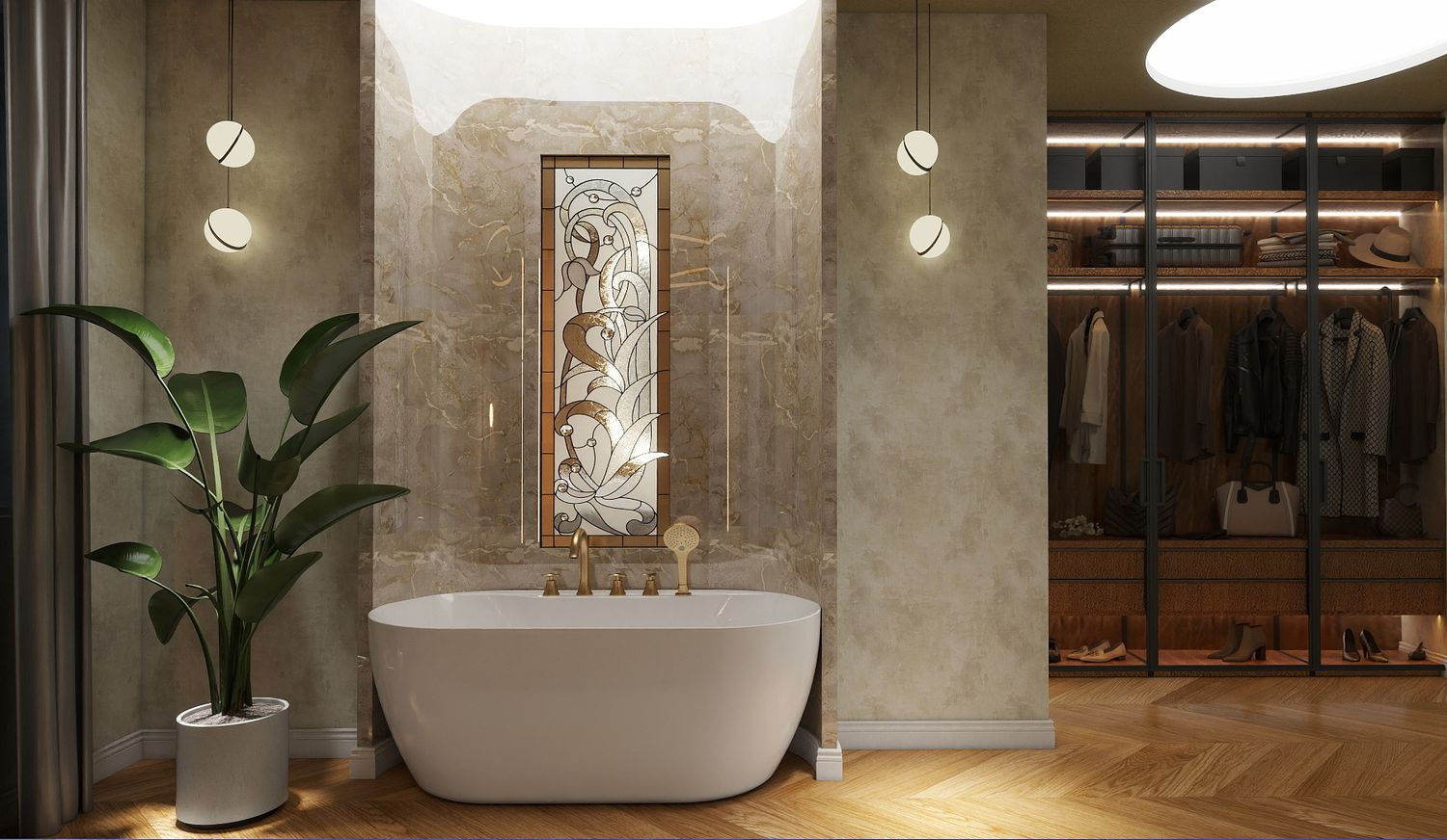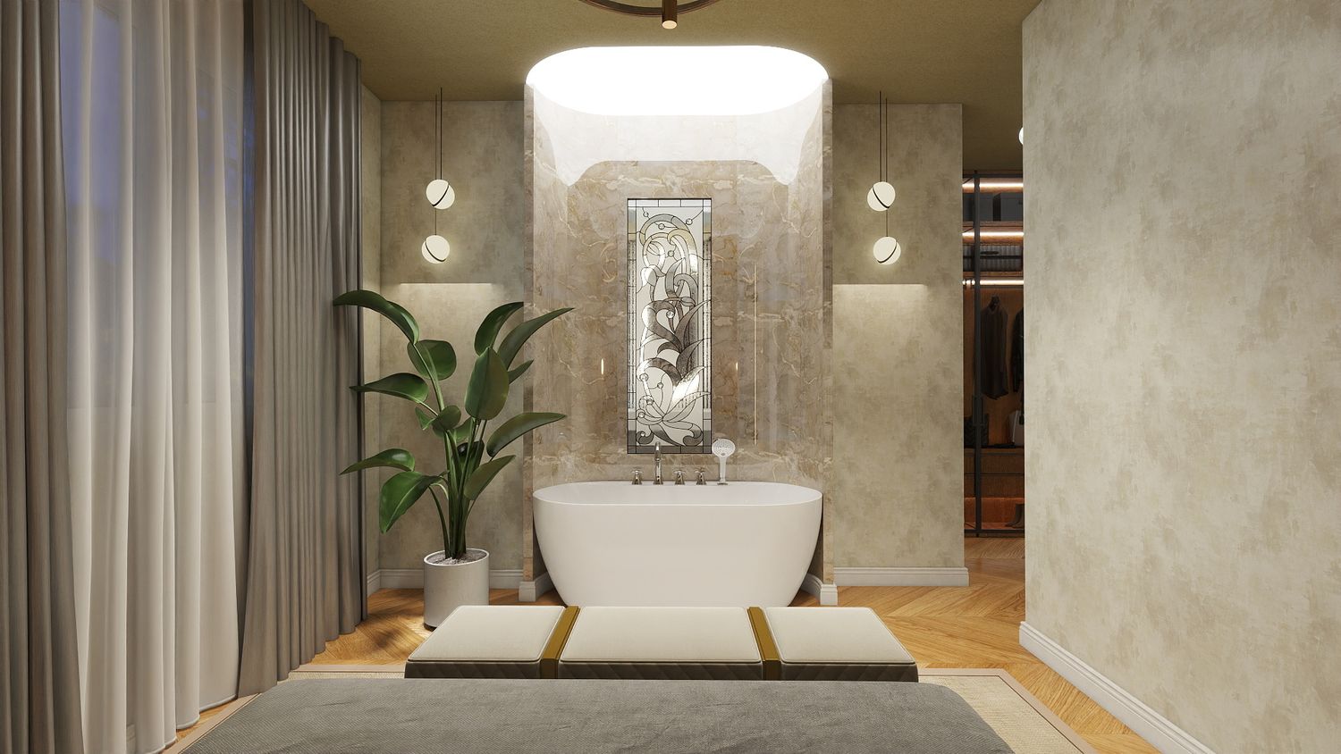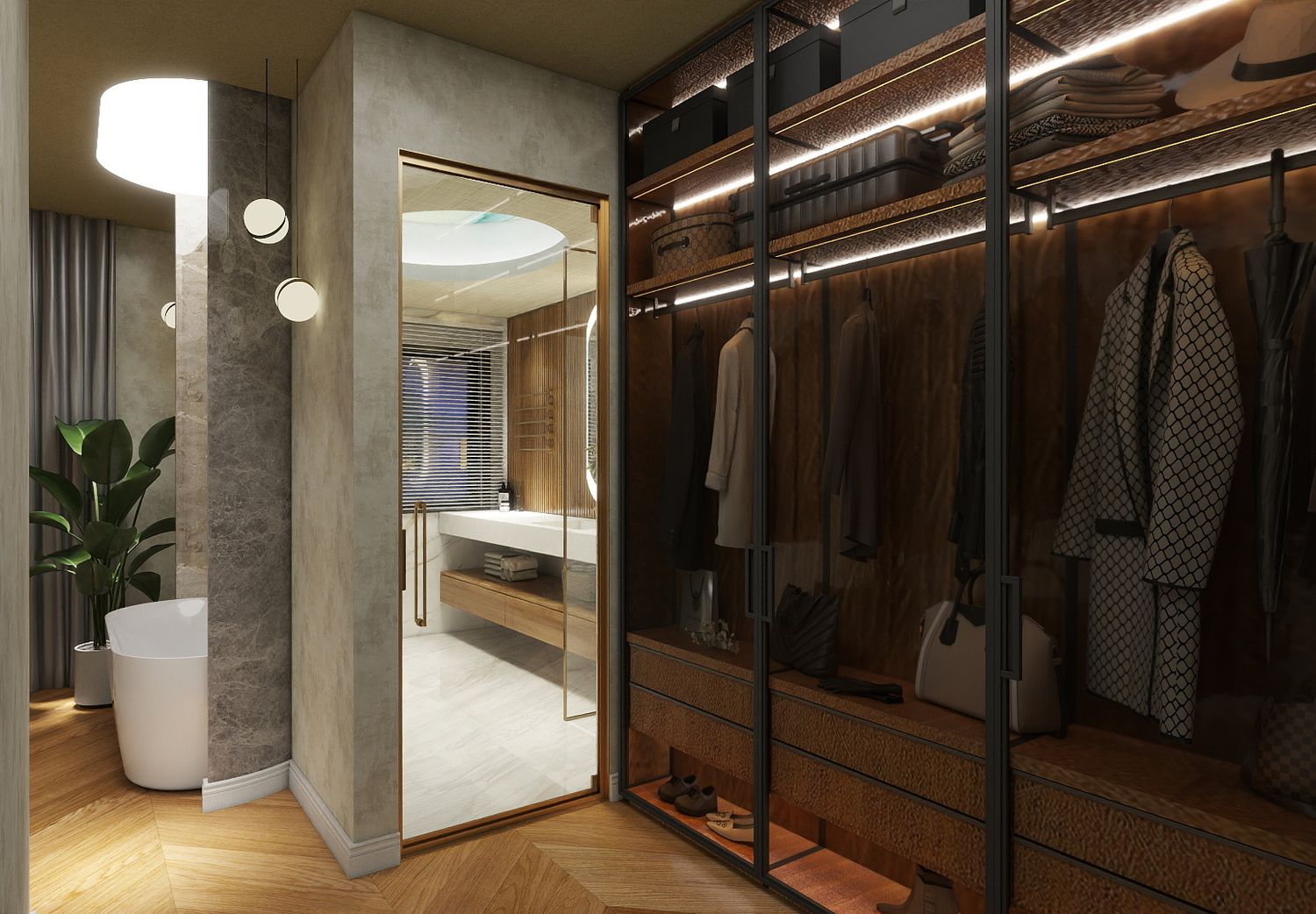 Include cabina armadio e vasca freestanding, con possibilità di accesso diretto dalla camera o alternativa con la vasca collocata nel bagno.