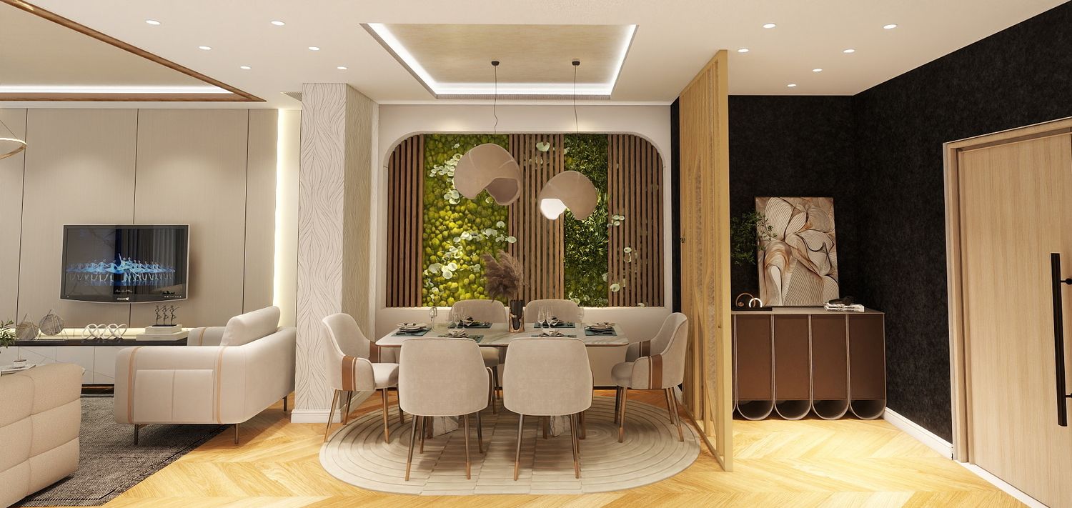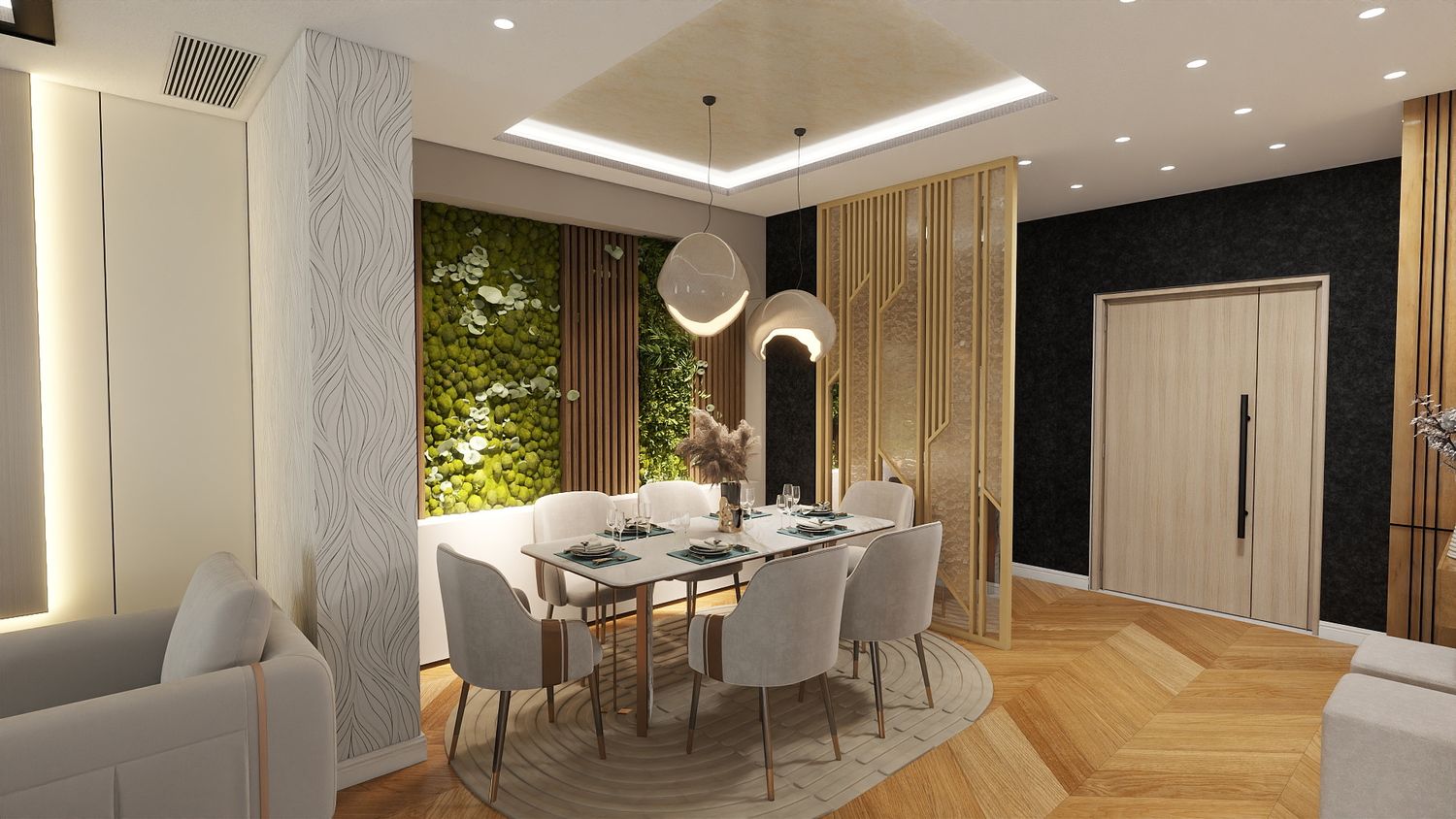 La zona pranzo è trattata come anchor point dell’appartamento, valorizzata dalla parete verde. La separazione visiva dall’ingresso è affidata a uno screen elegante, che mantiene comunque la fluidità visiva.