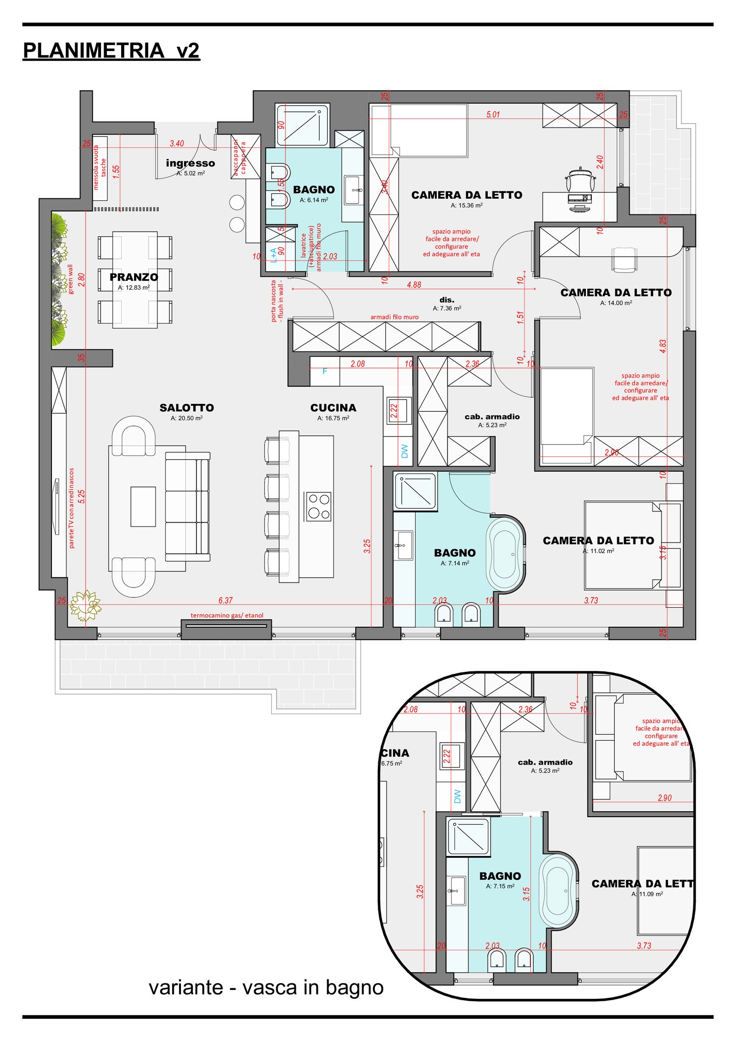 È previsto ampio spazio contenitivo: armadio guardaroba all’ingresso, “tavola svuota chiavi”, posibilita armadi retro TV, armadi lungo il corridoio, cucina con ampi vani e cassetti sotto piano.