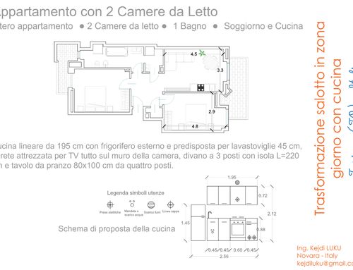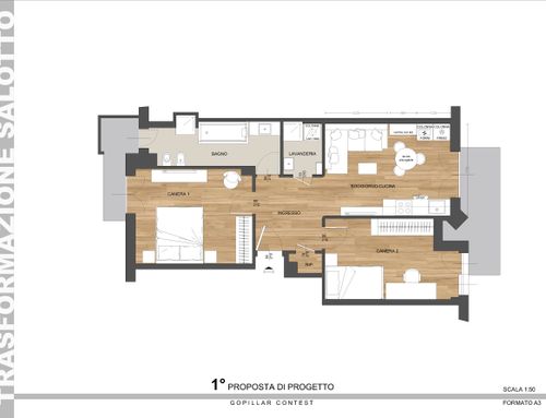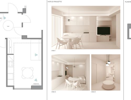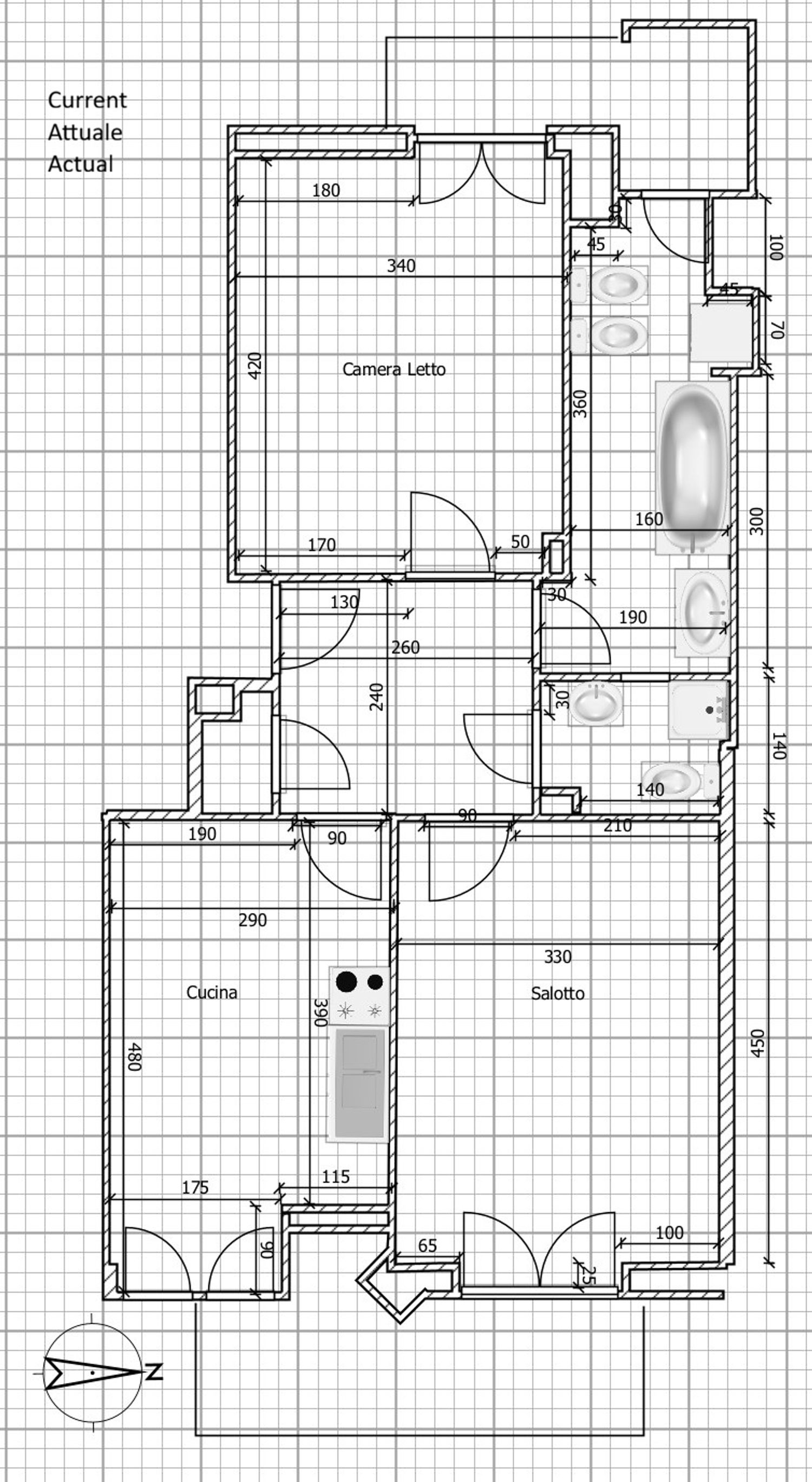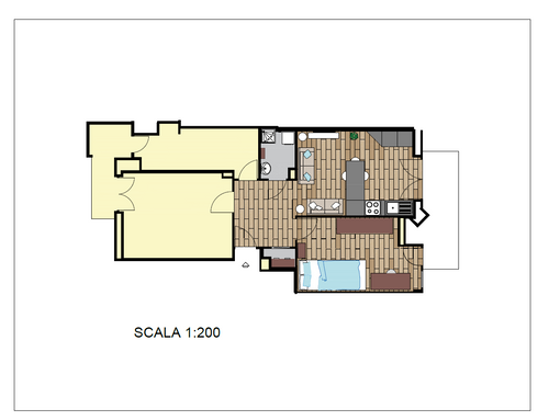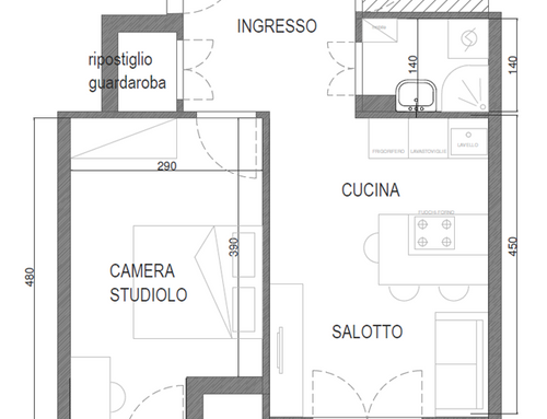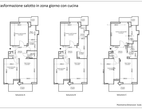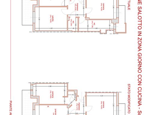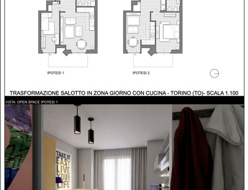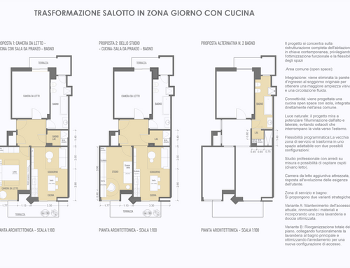 - trasformare l’attuale salotto in un’unica zona giorno con cucina, per sfruttare il maggiore spazio della stanza più grande;