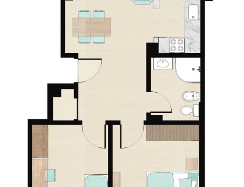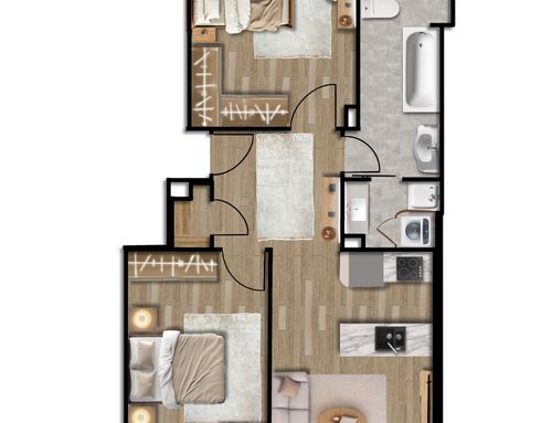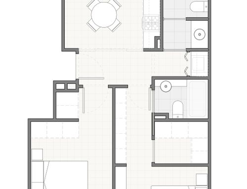 - la distribución está pensada para una o dos personas, convivientes o eventualmente en modalidad de vivienda compartida;