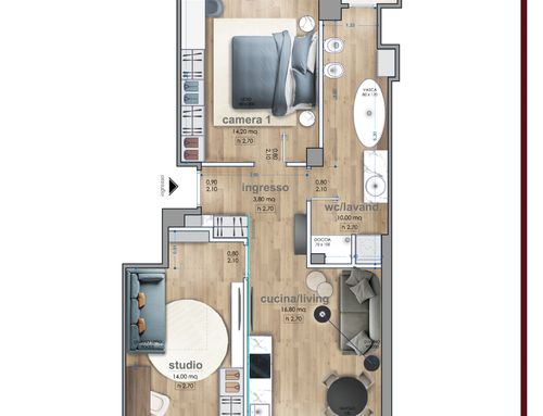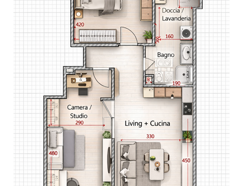 Immagine di riferimento modificata con AI per dare una idea del desiderato riorganizzando anche i bagni