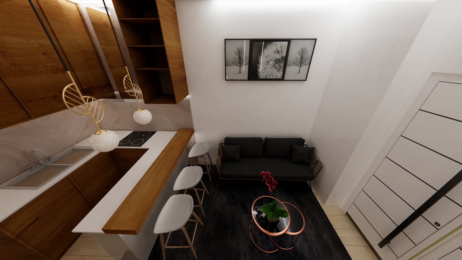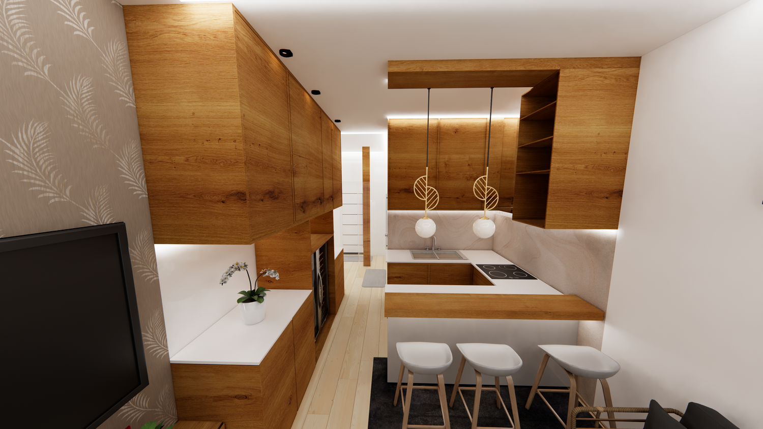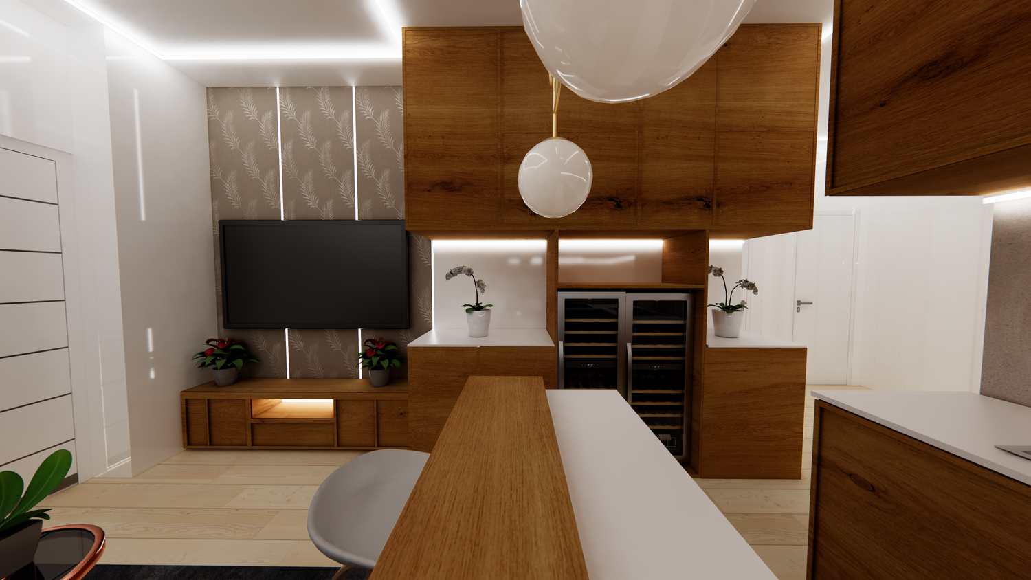 The proposal successfully transforms the living room into an open-plan space with an integrated kitchen.