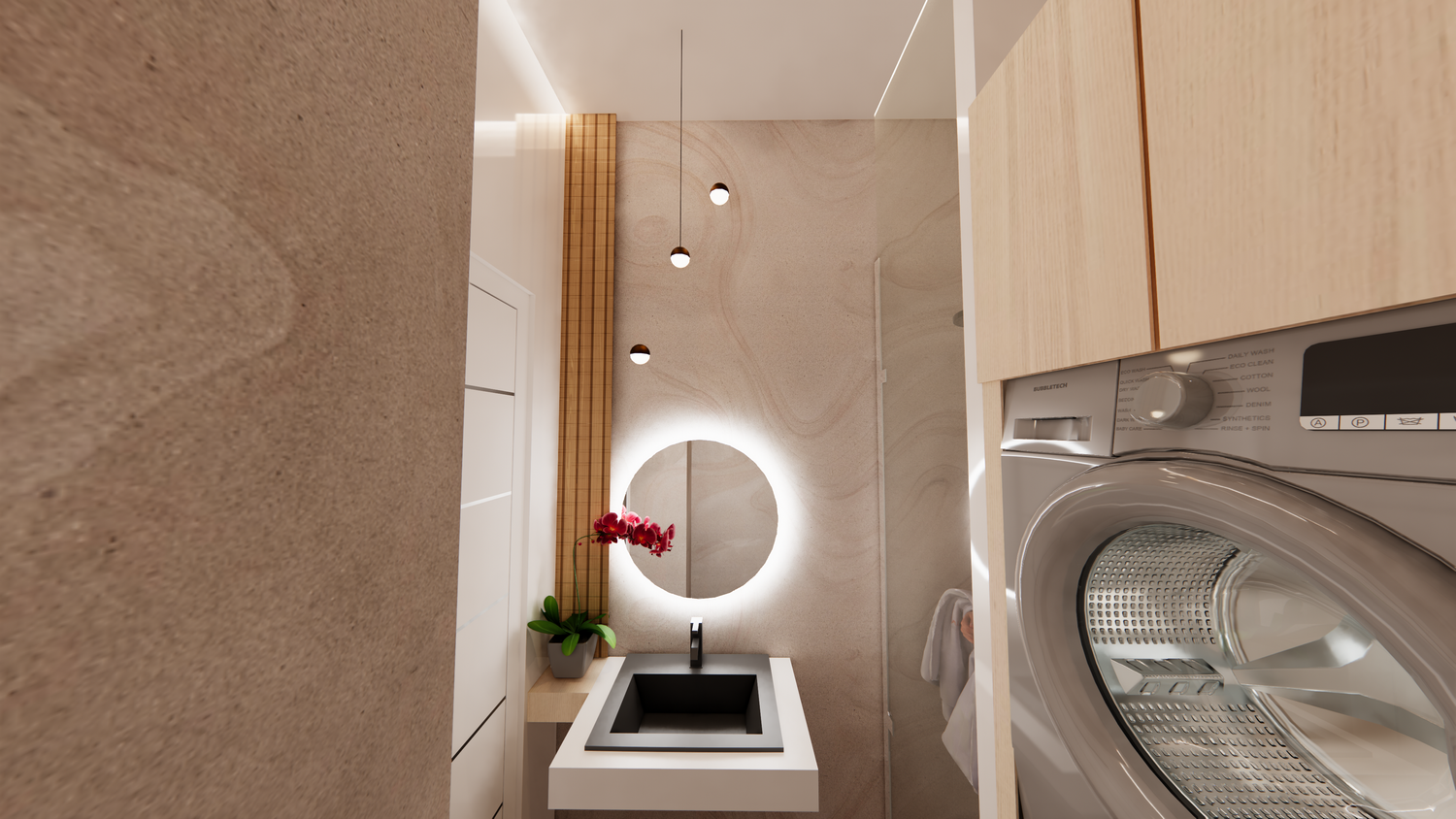 The secondary WC has been reconfigured into a combined laundry and shower room.