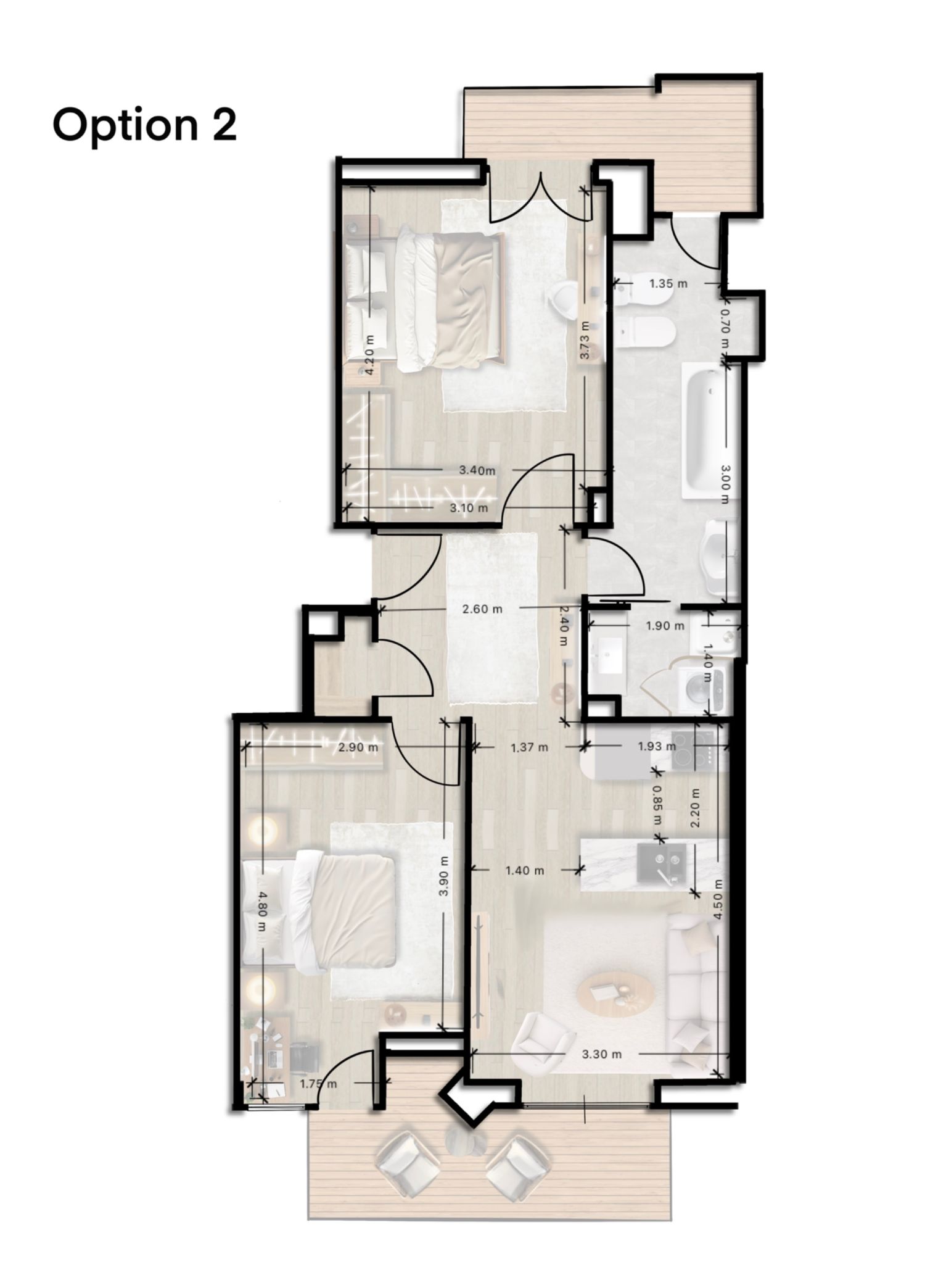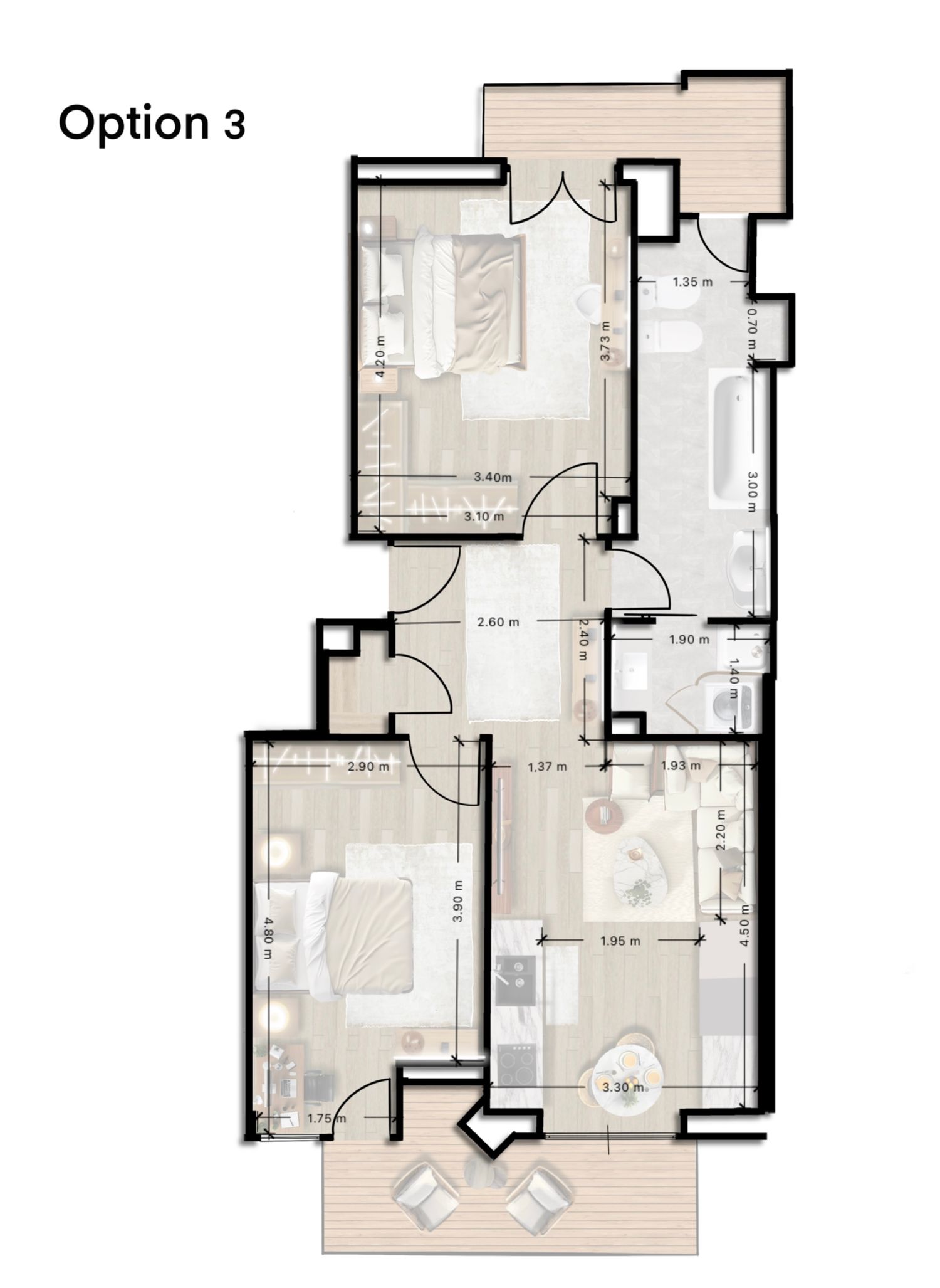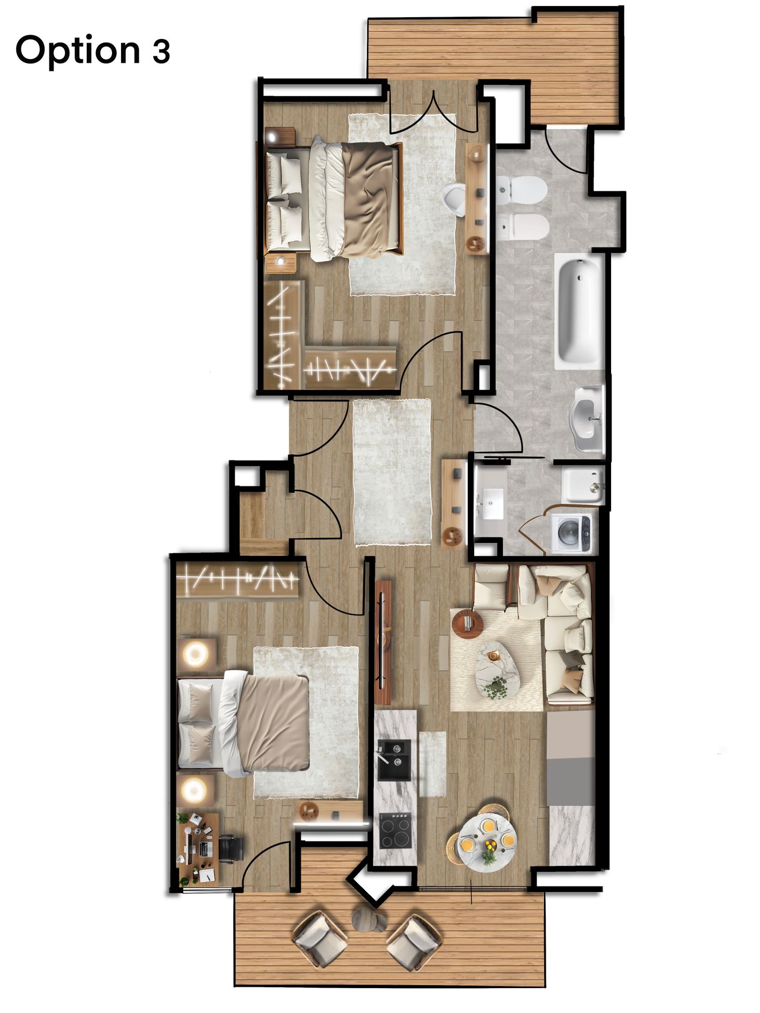 I have developed three different layout options for the living area and kitchen, offering alternative solutions for space optimization and functionality.